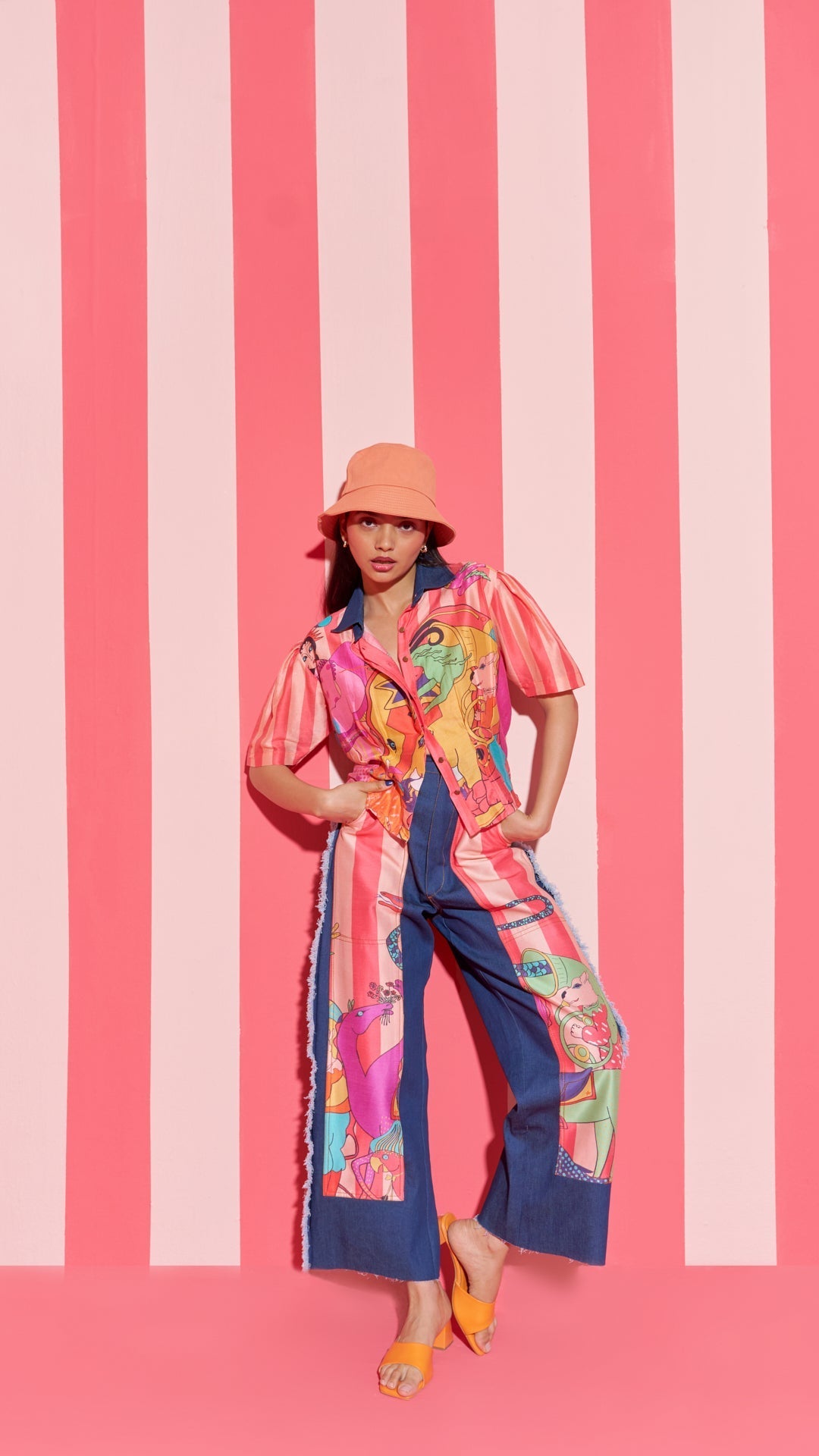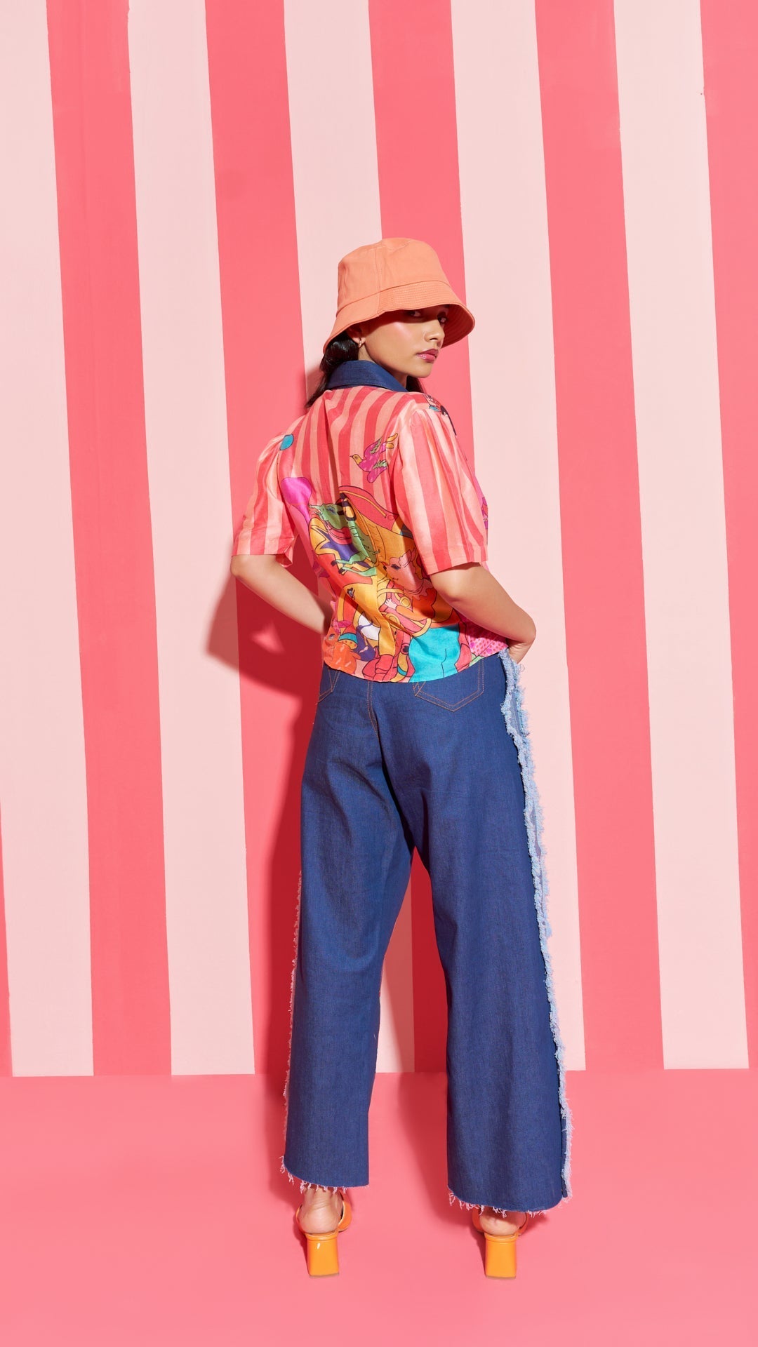 High waisted pants. Made in out parade print with fray detailing on the edges.
