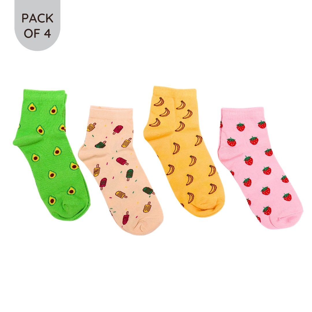 Spice up your sock game with our Fruit Custard Socks! This pack of 4 unisex ankle socks features playful designs of bananas, strawberries, avocados, and popsicles on a soft cotton base. Perfect for anyone with a playful and quirky sense of style.