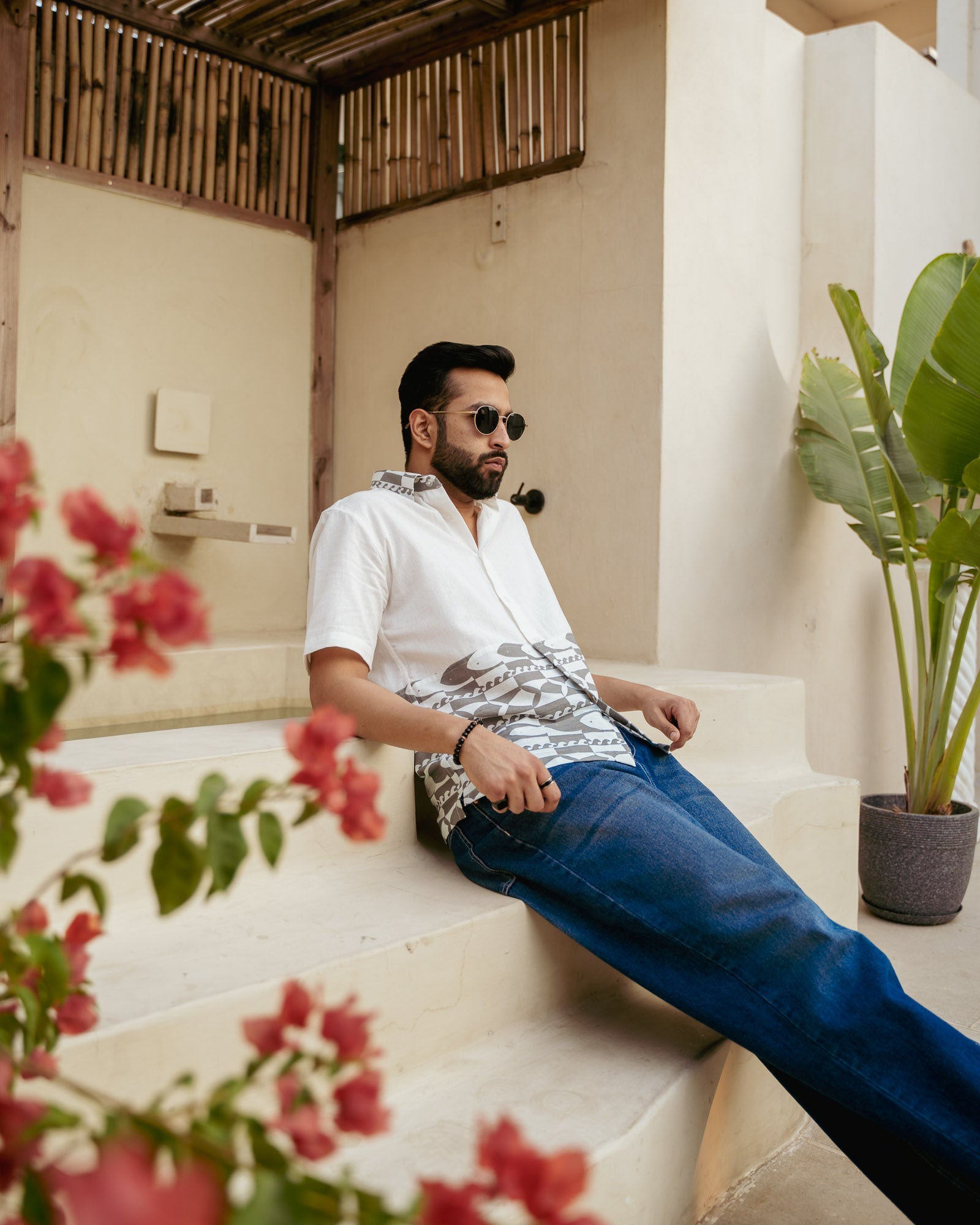 Elegant white shirt sea creature print. Perfect for casual outings, summer brunches, semi-formal office wear, or travel.
