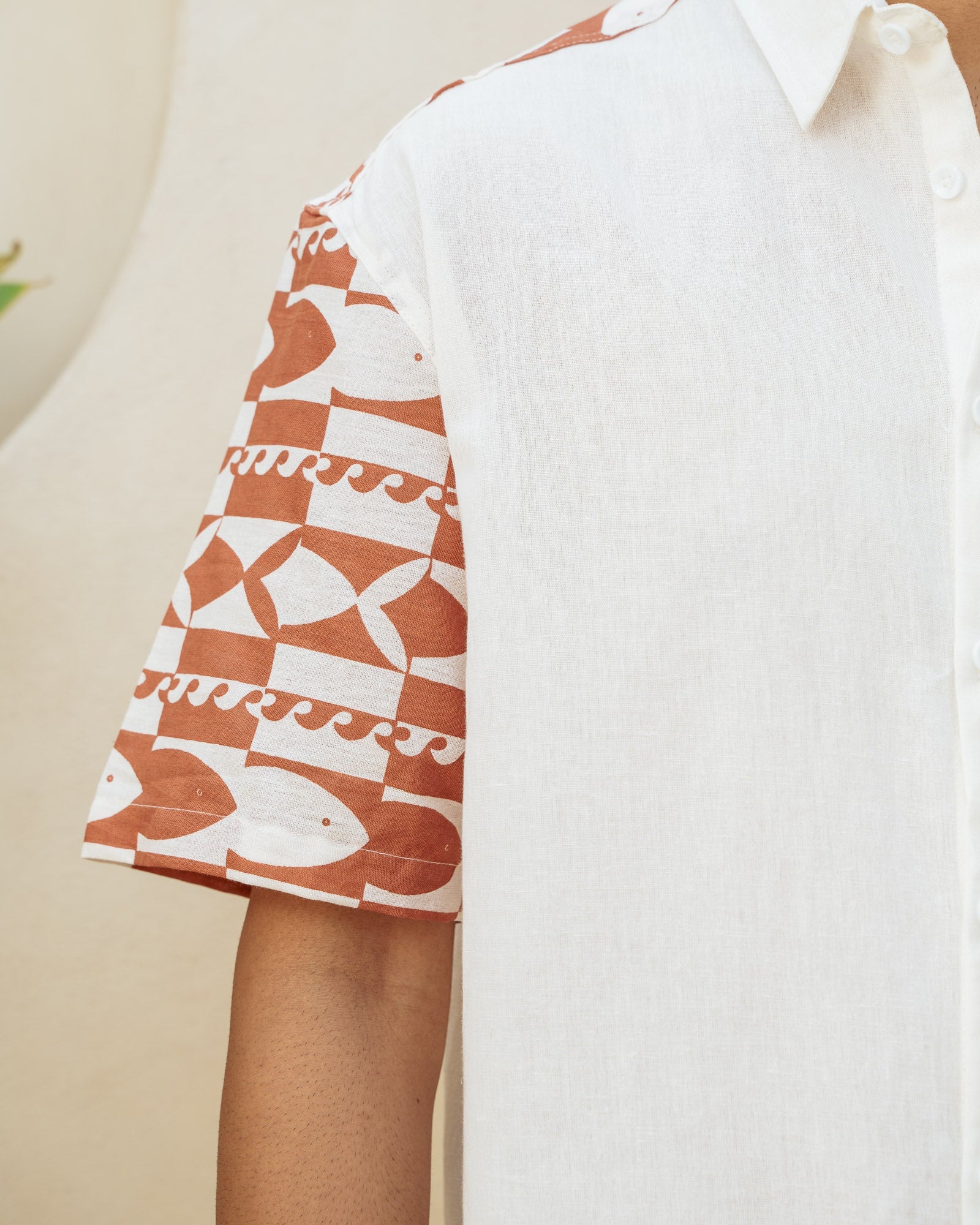 Elegant white shirt with earthy-toned print. Perfect for casual outings, summer brunches, semi-formal office wear, or travel.