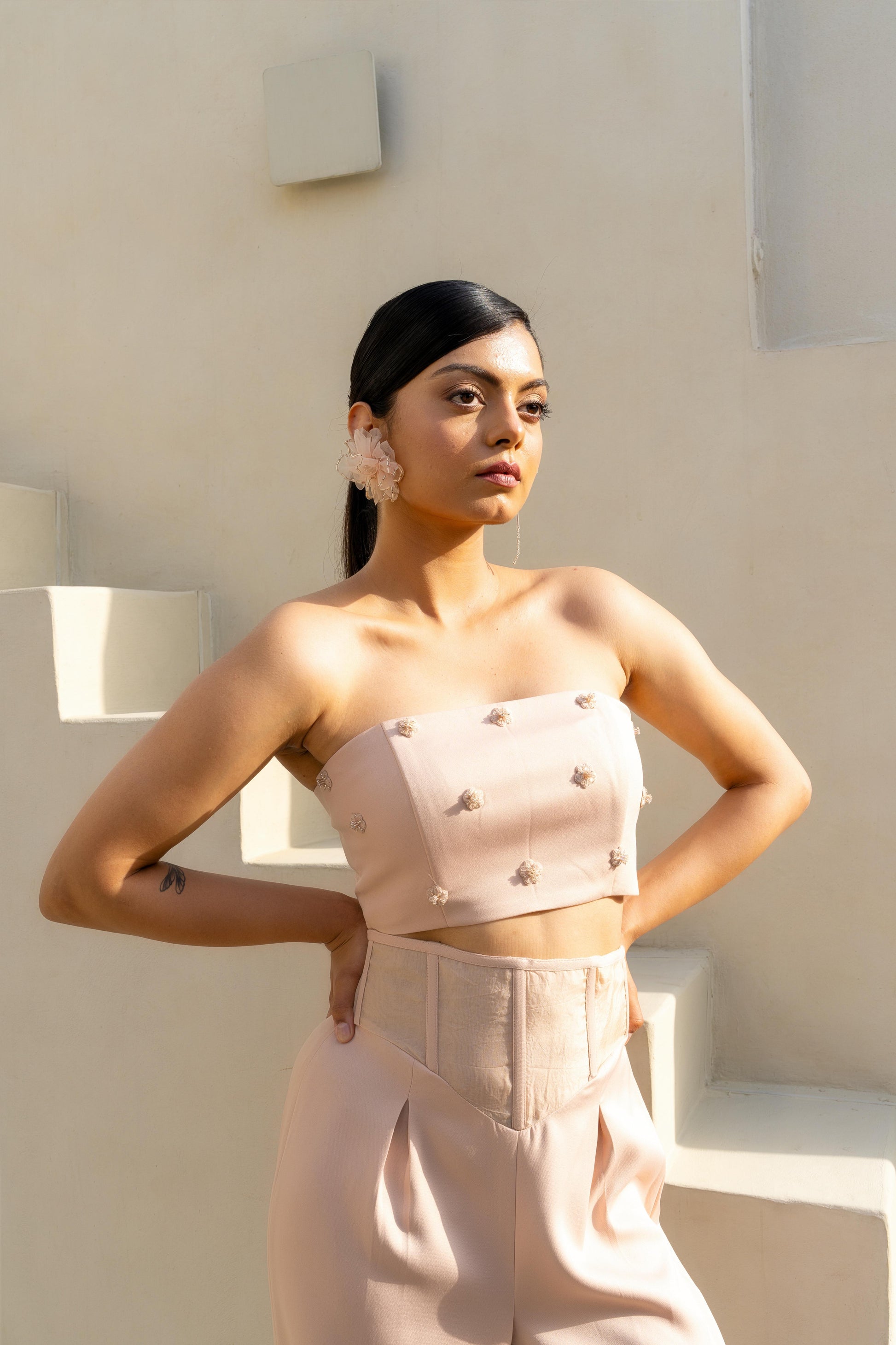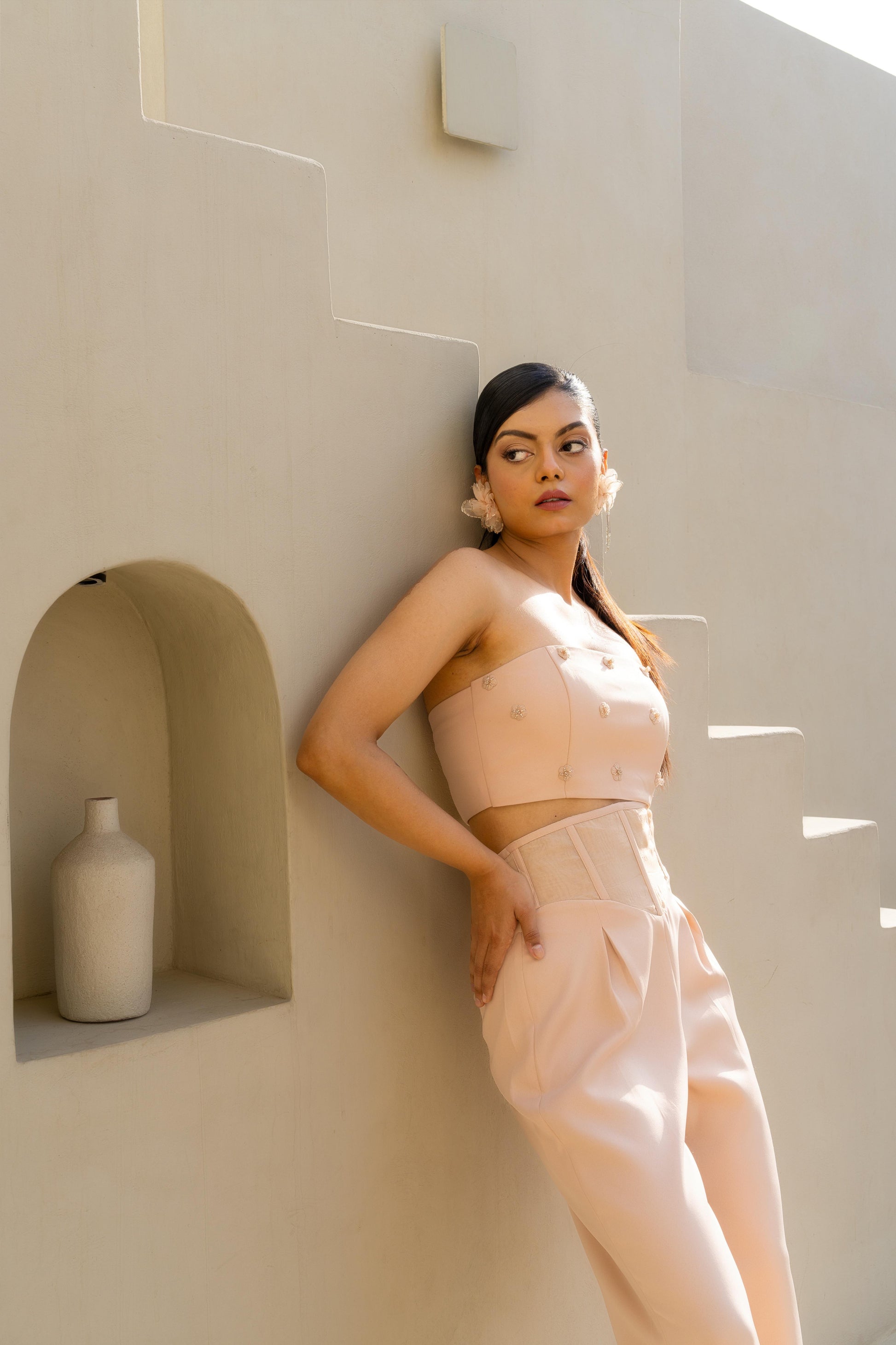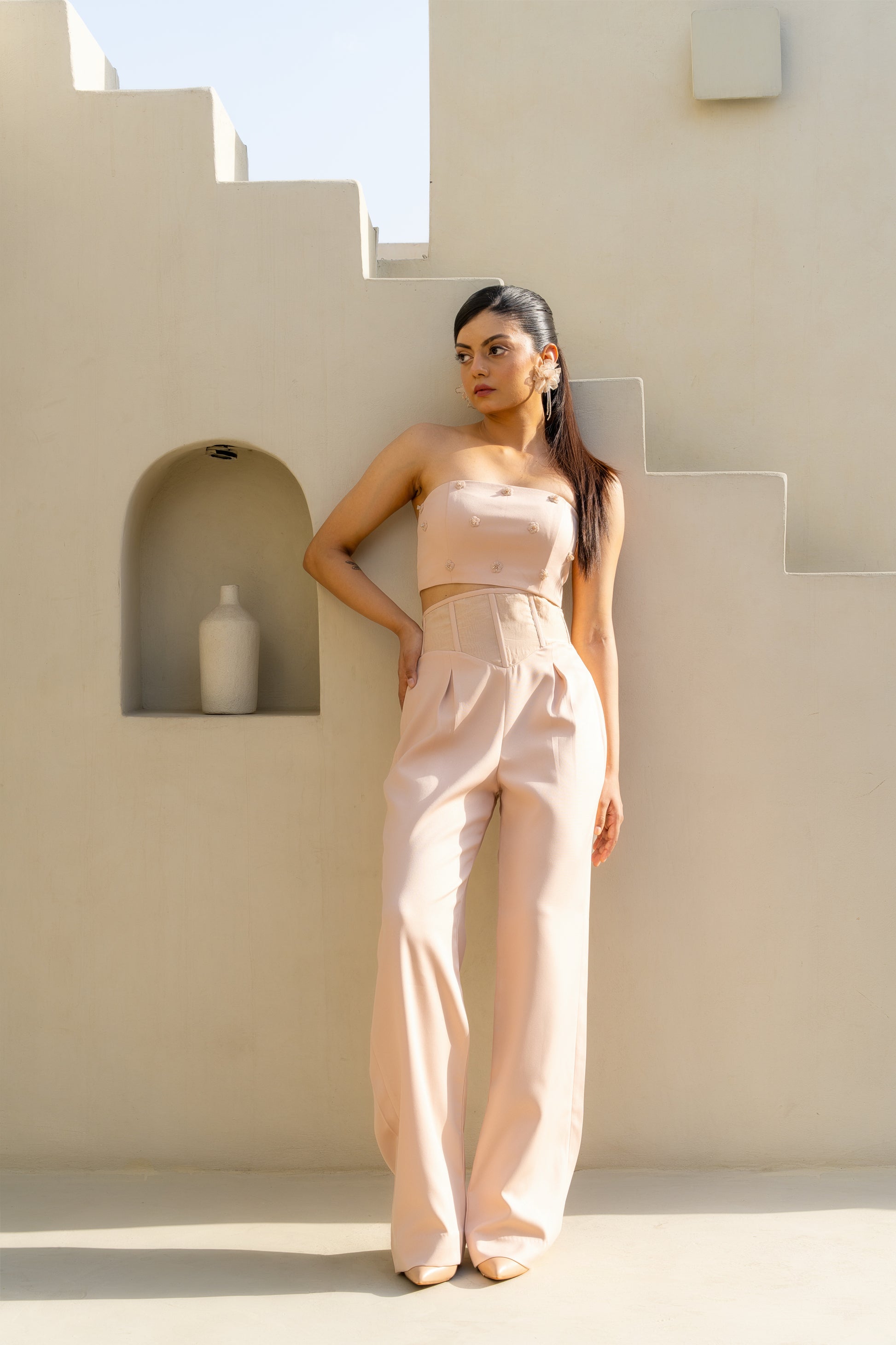 Bustier corset top with signature handwork detail. Corset straight-fit pants.