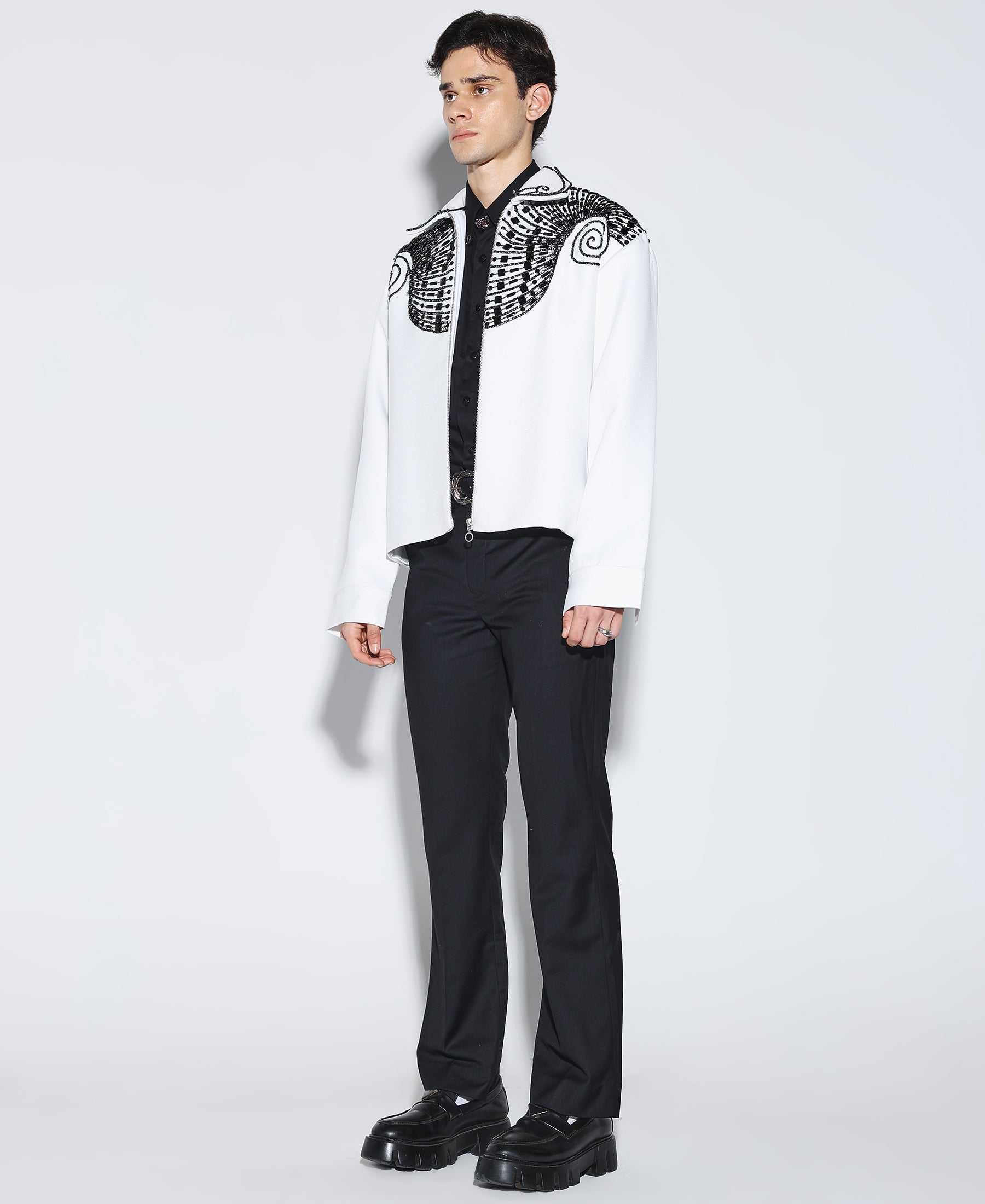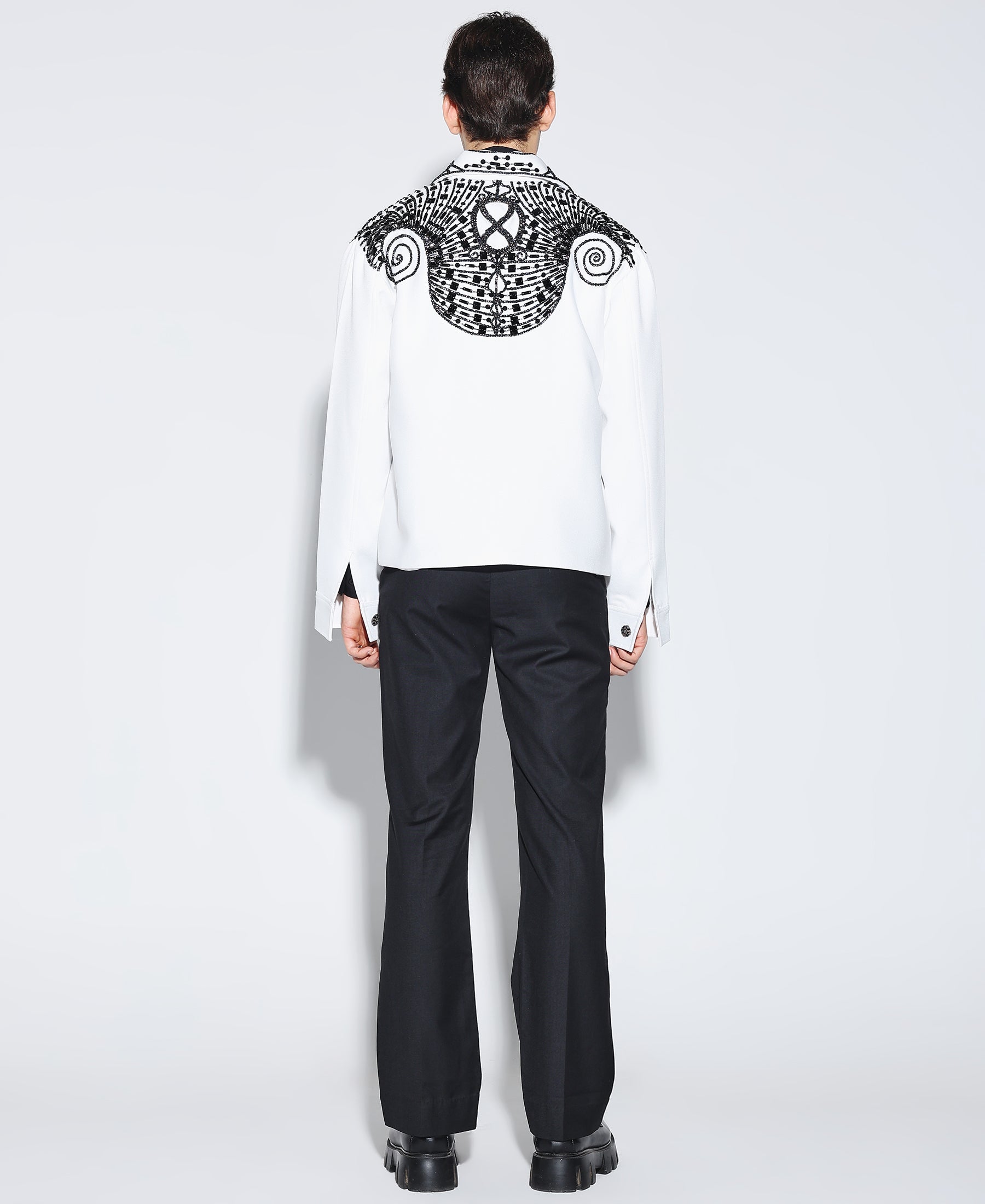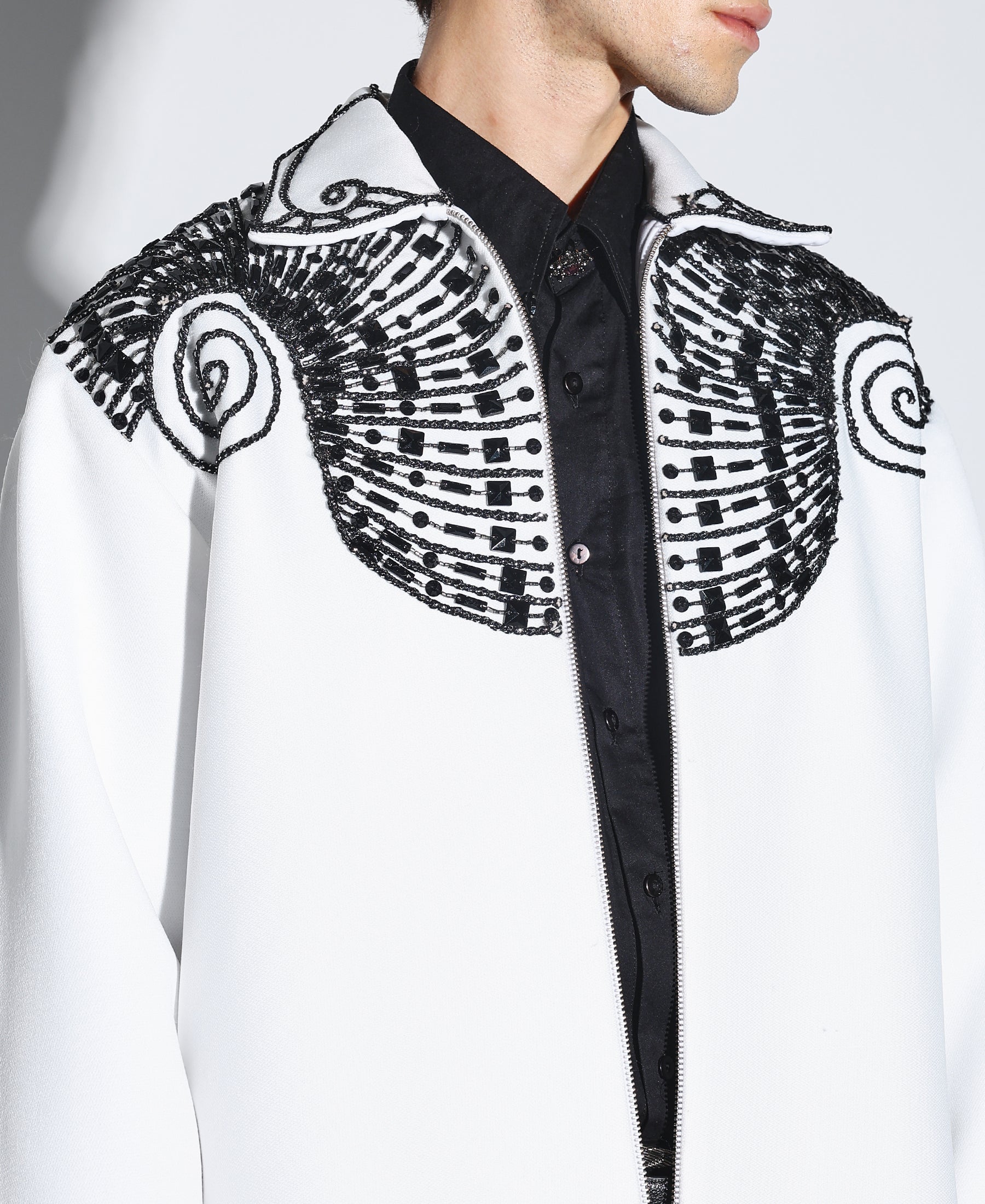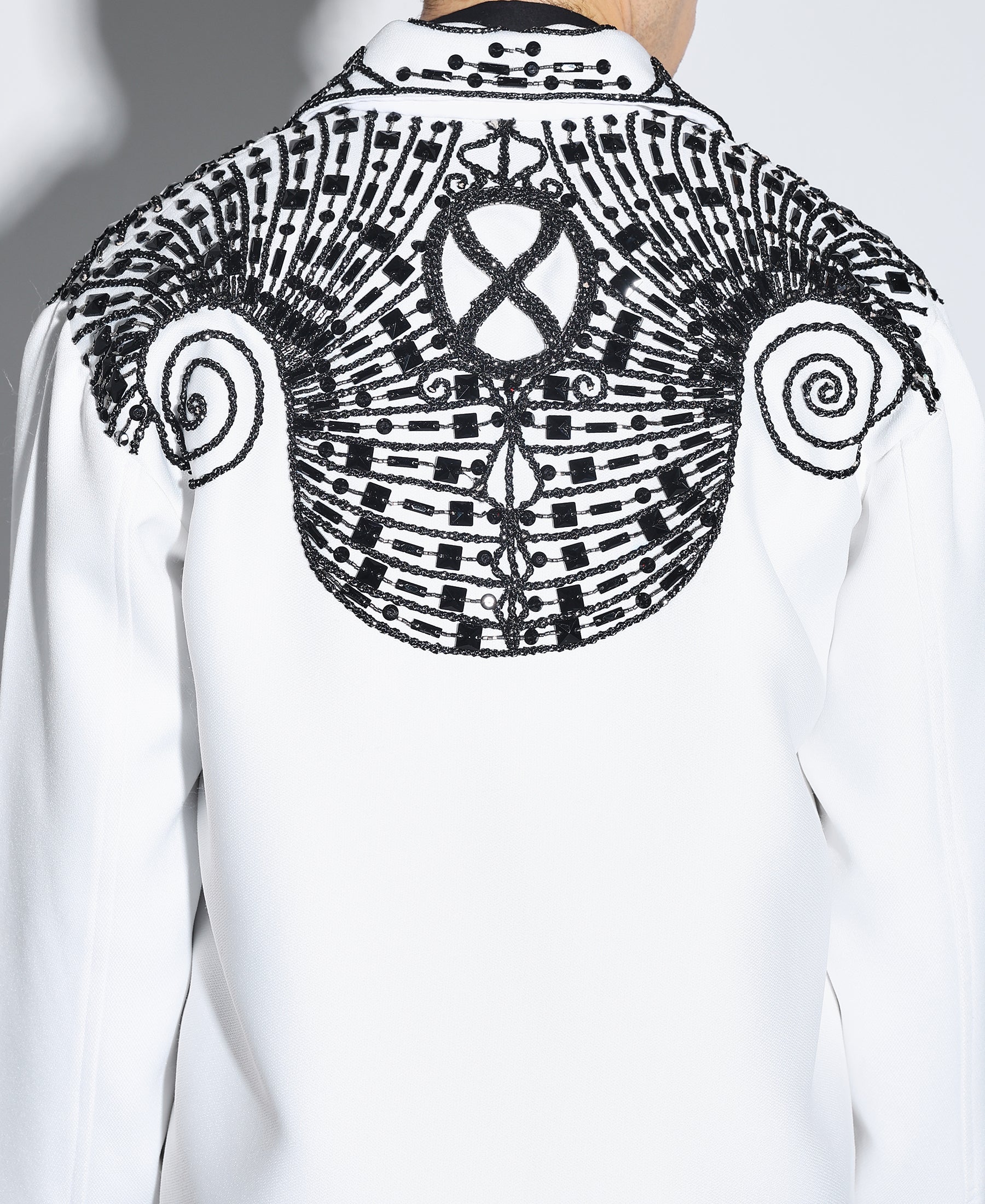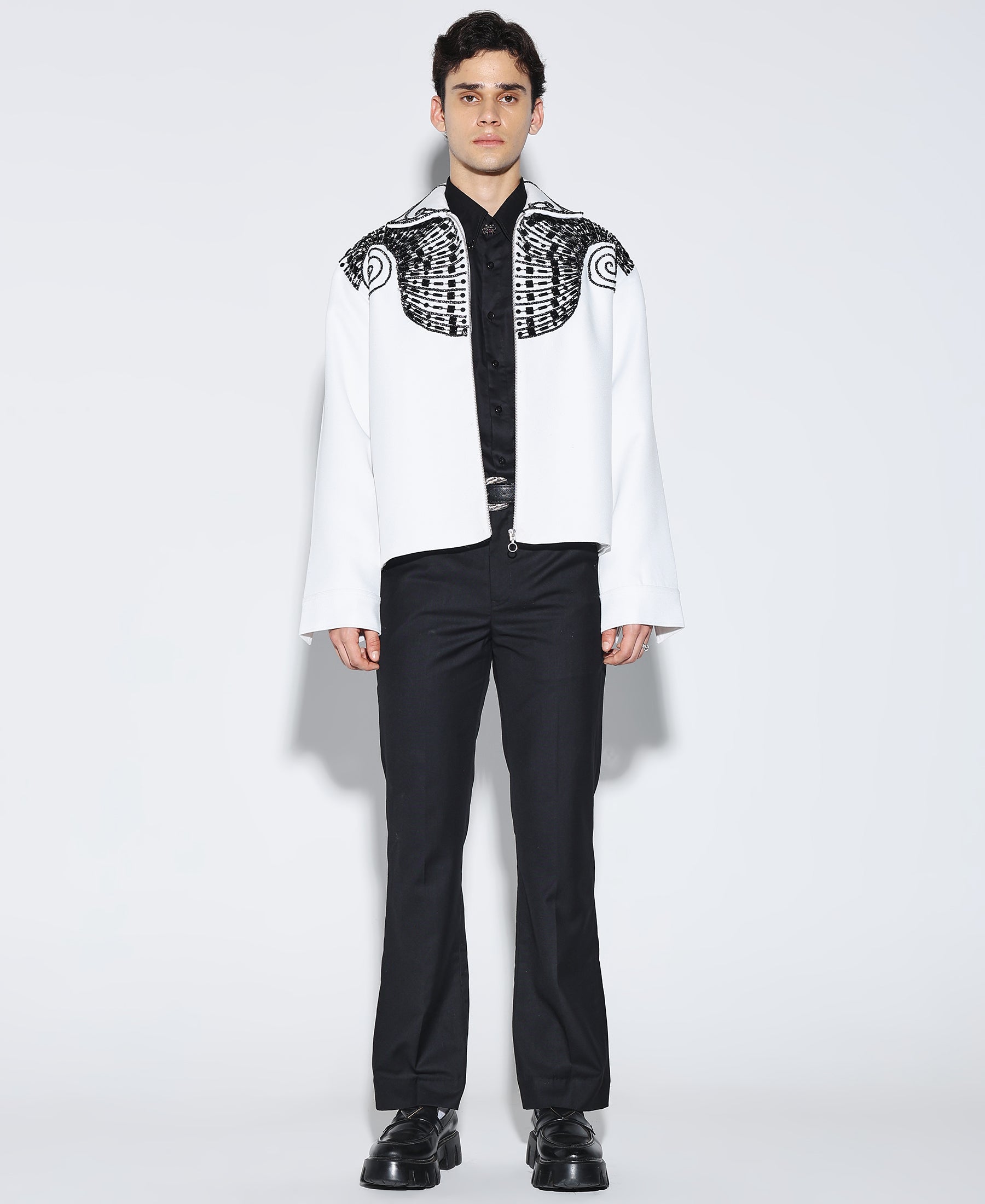 Embellished Jacket with cord embroidery crafted from Japanese suiting fabric inspired by snail shell reflects the cosmic cycles of creation and dissolution. This jacket is a work of art - adding attitude to your outfit has never been easier.