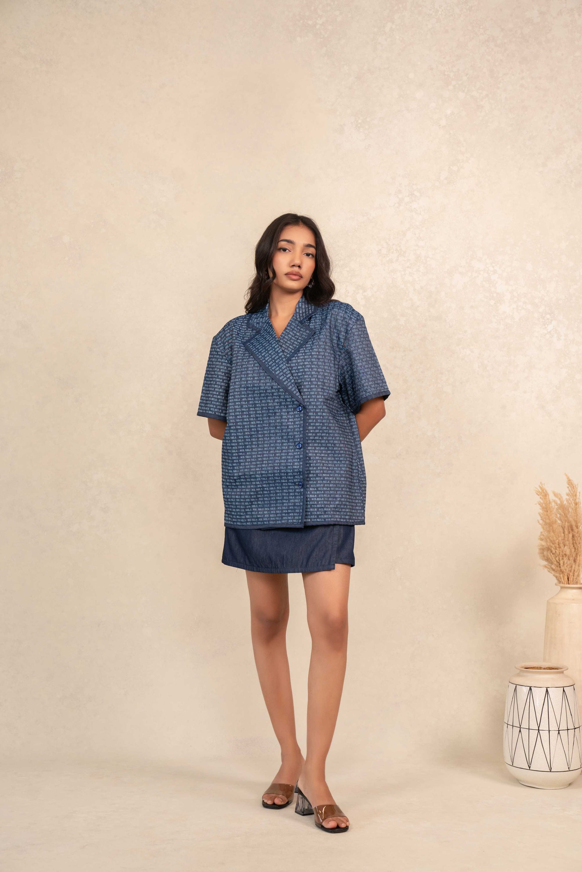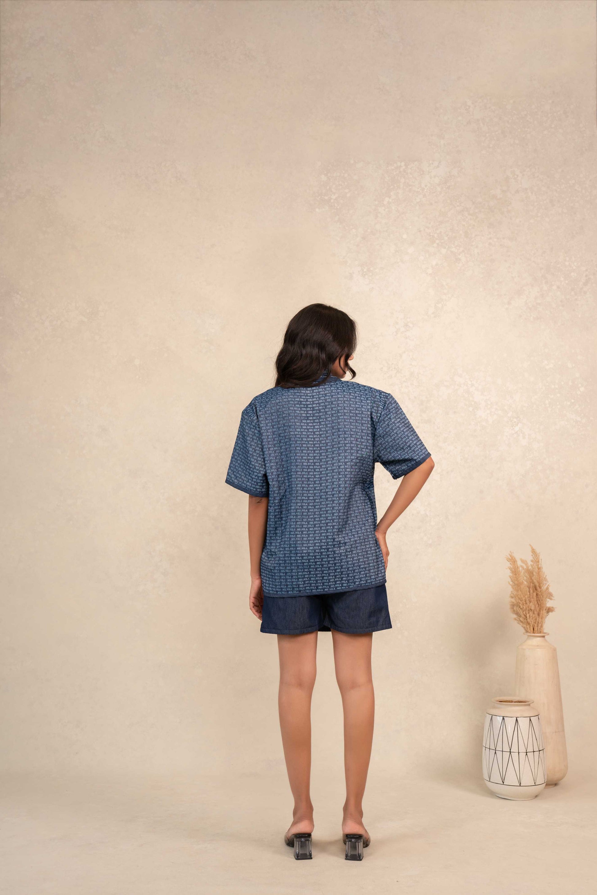 Crafted from soft cotton denim, the Mexico Set is a bold yet versatile co-ord for women. It features a cropped boxy shirt with wide sleeves and a high-waisted A-line mini skort both enhanced with subtle sil-sila print. The breathable cotton denim offers structure without compromising on comfort, making it perfect for everyday wear. Whether styled as a full printed denim set or worn as separates, it’s a statement.