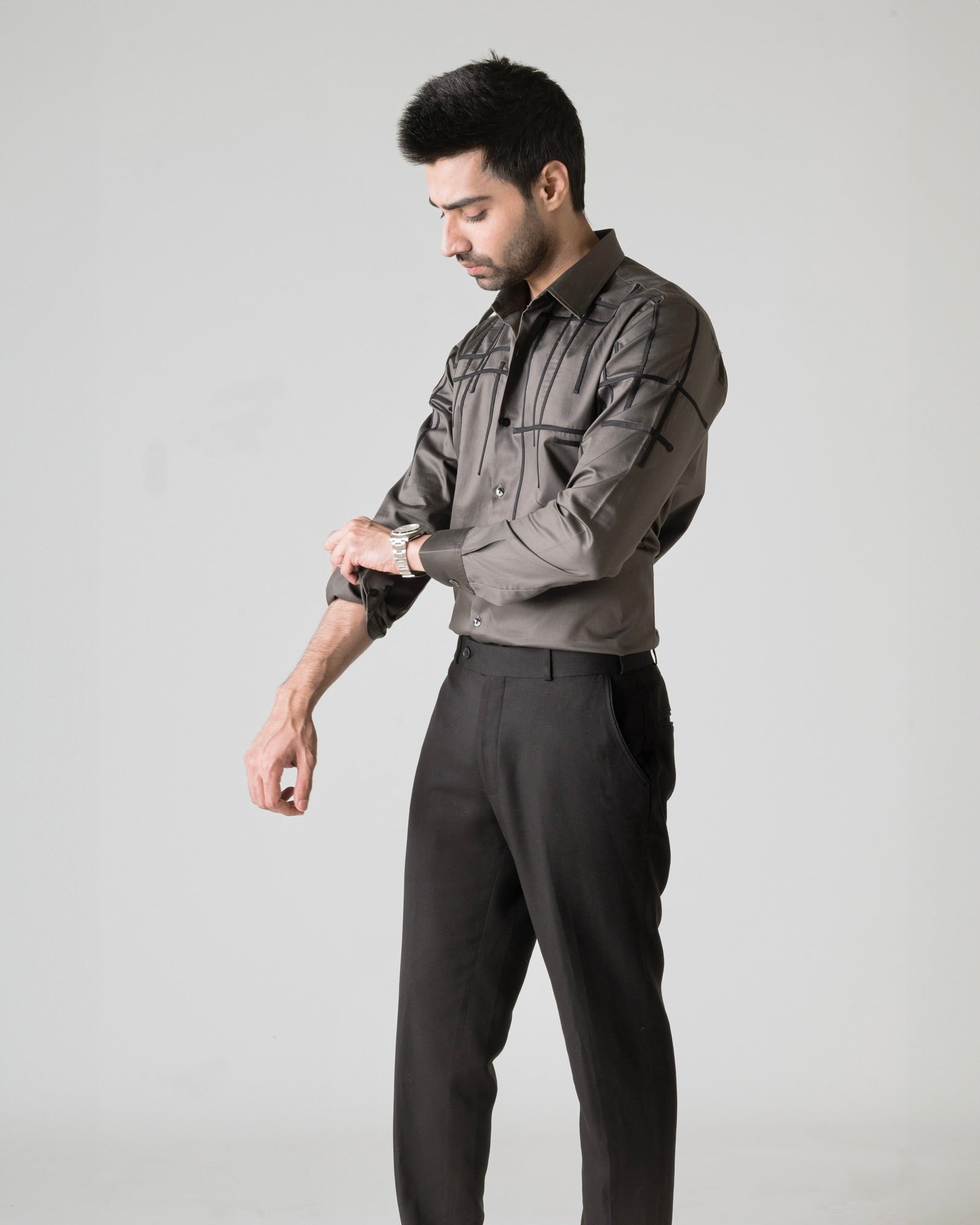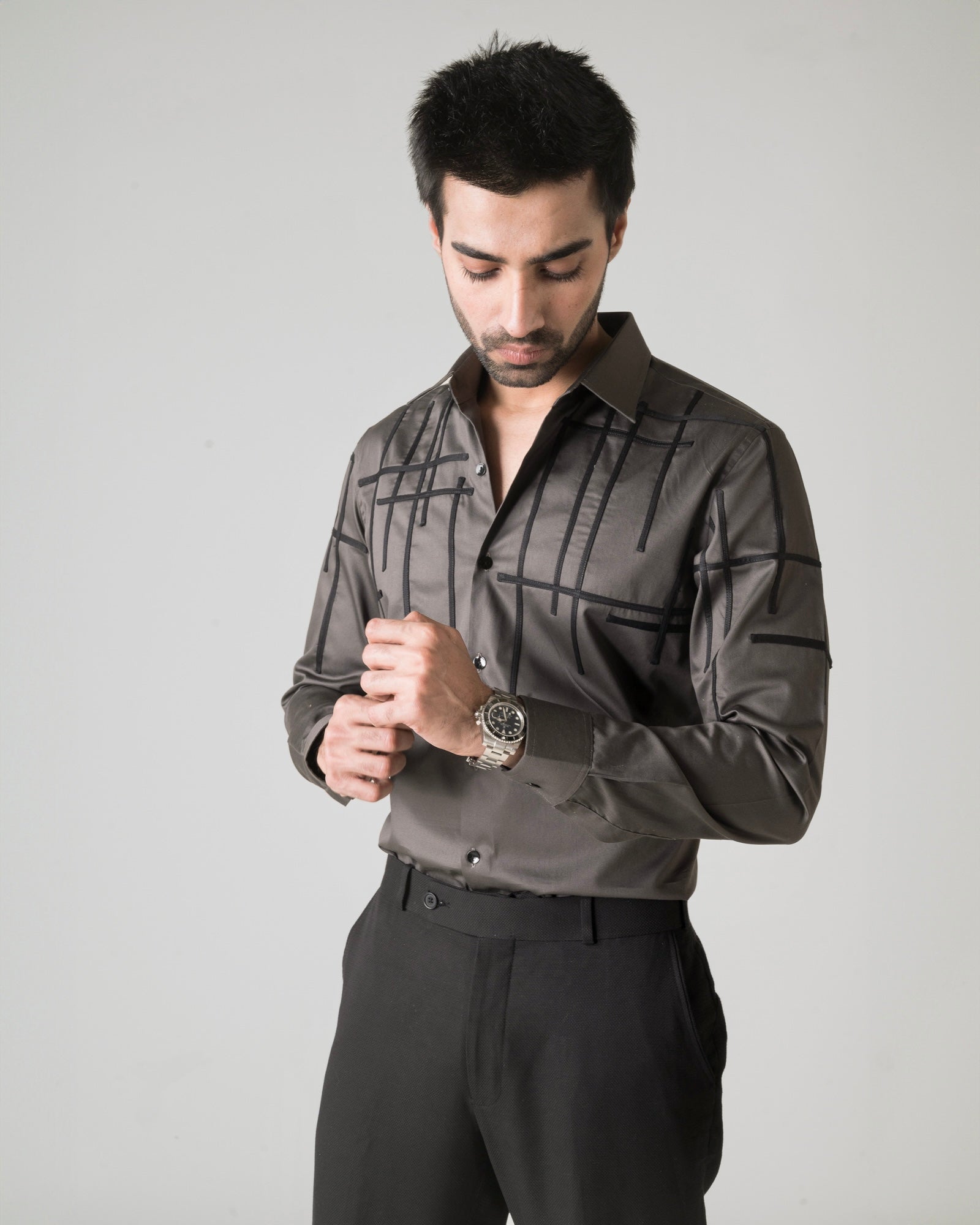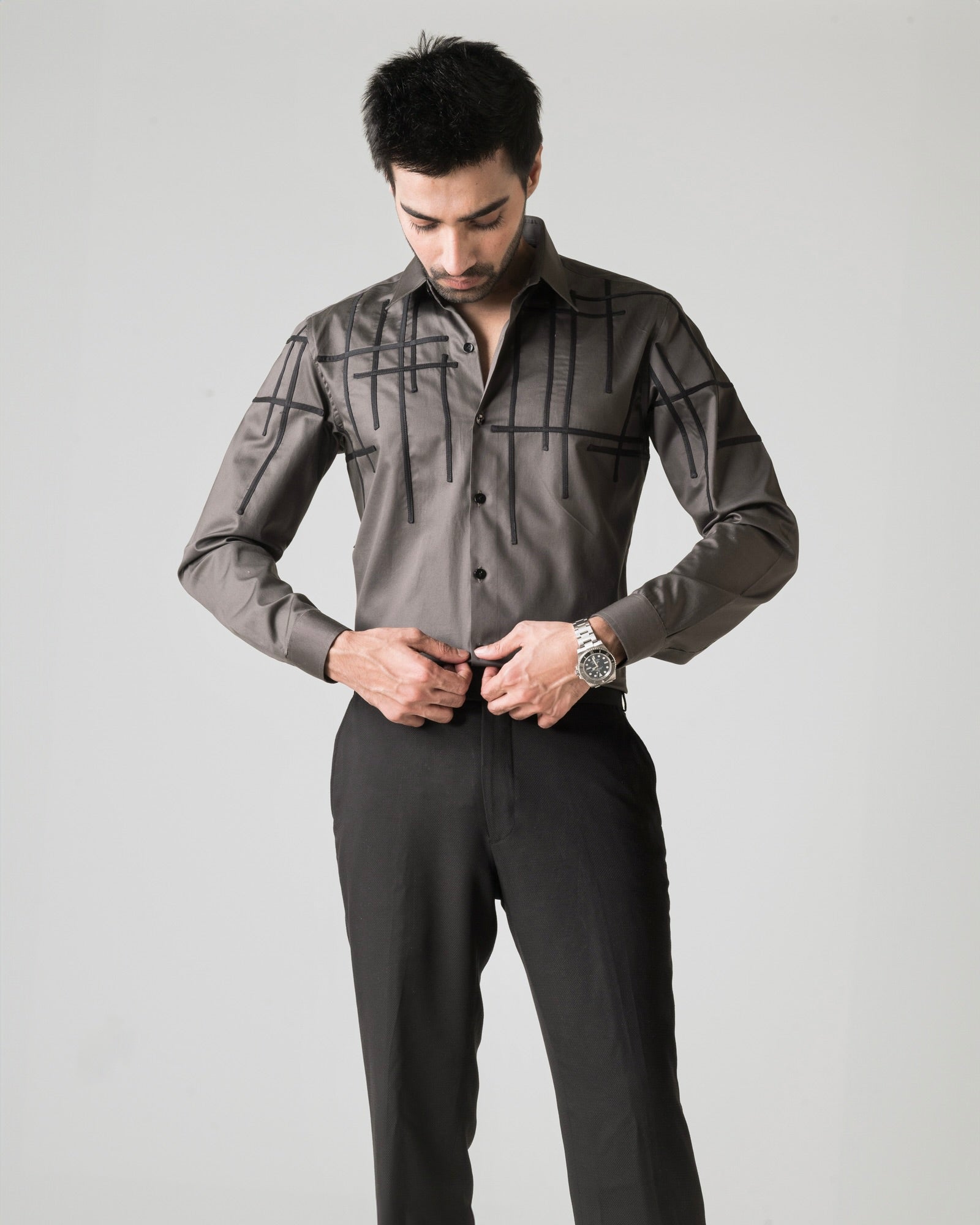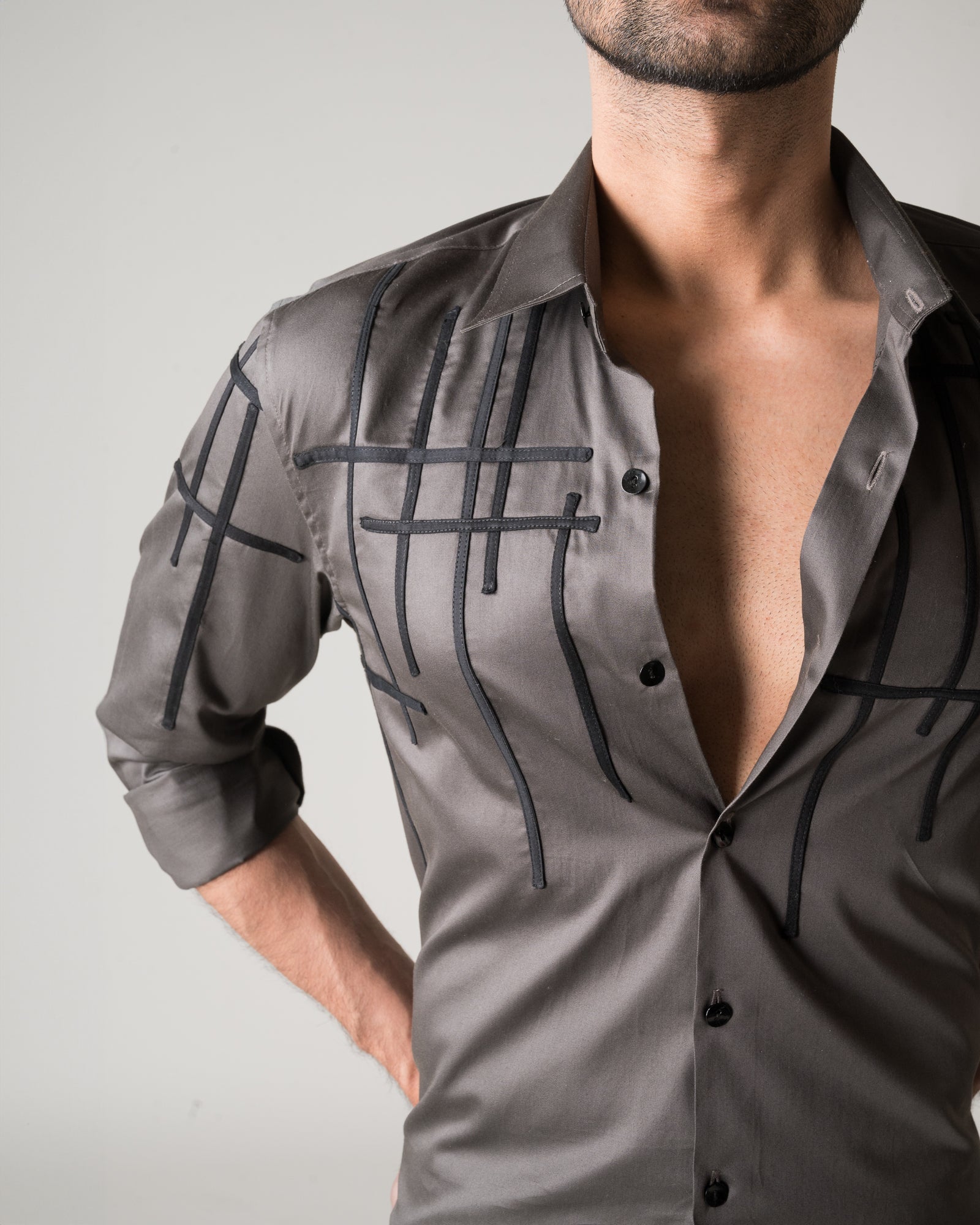 There's never a dull moment in a Shay shirt! This shirt features intersecting arrangement of black strips stitched on premium grey cotton fabric. Pair it with black bottoms and wear it out to parties, dinners or semi-formal events.