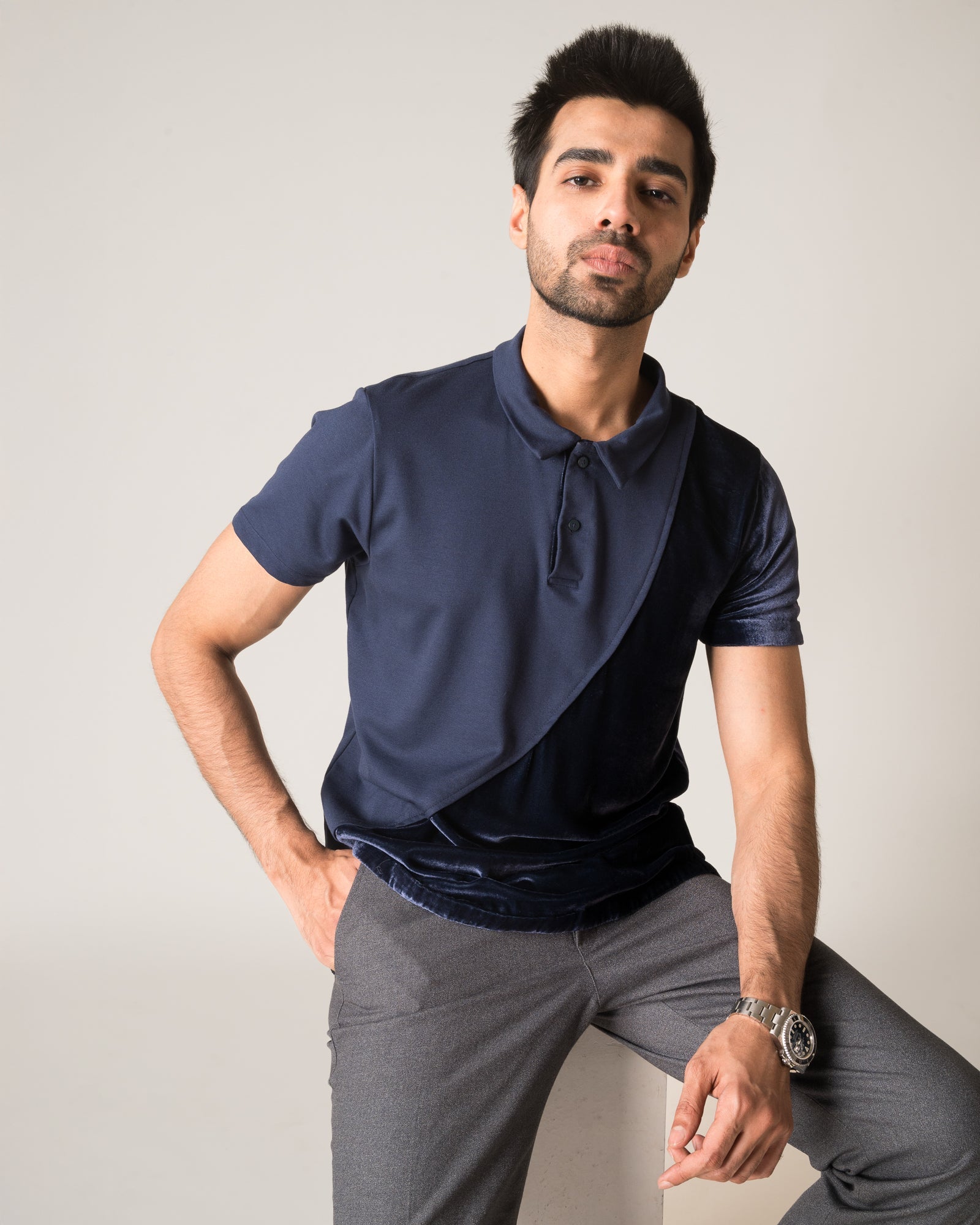Our half moon polo, features a bold contrast between pure silk velvet shine and matte fabric. Pair it with grey or black jeans or trouser for a date night or a club night.