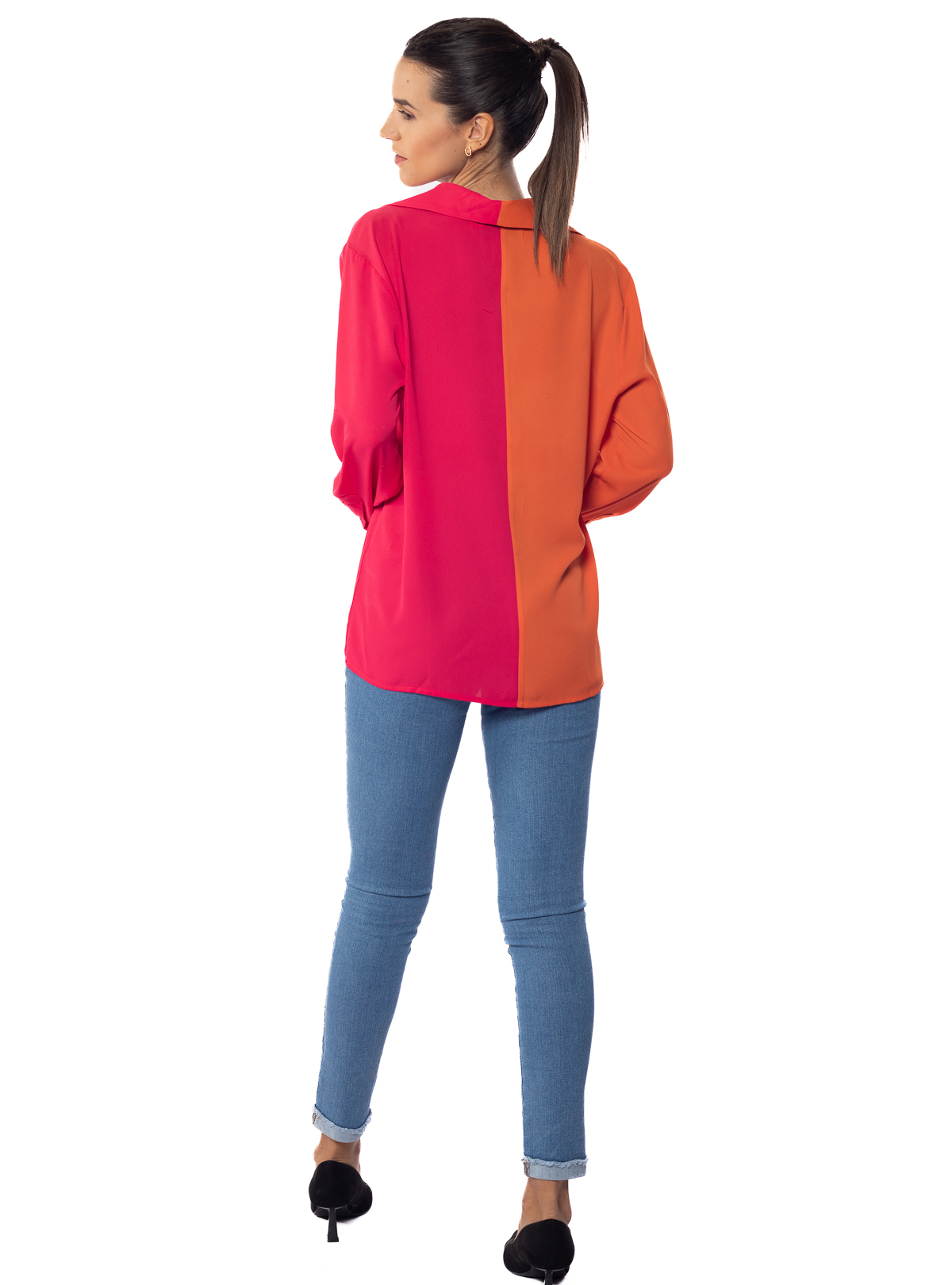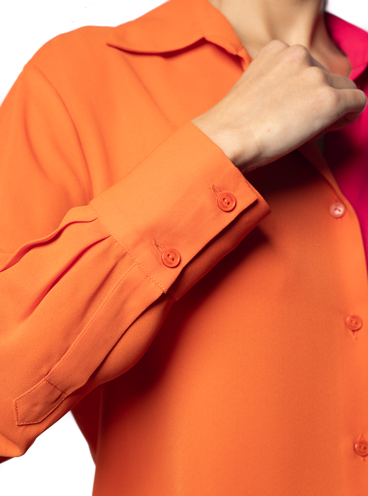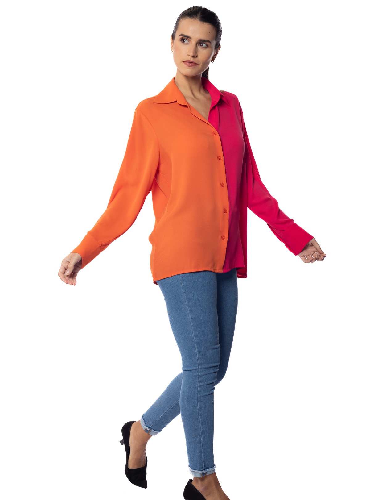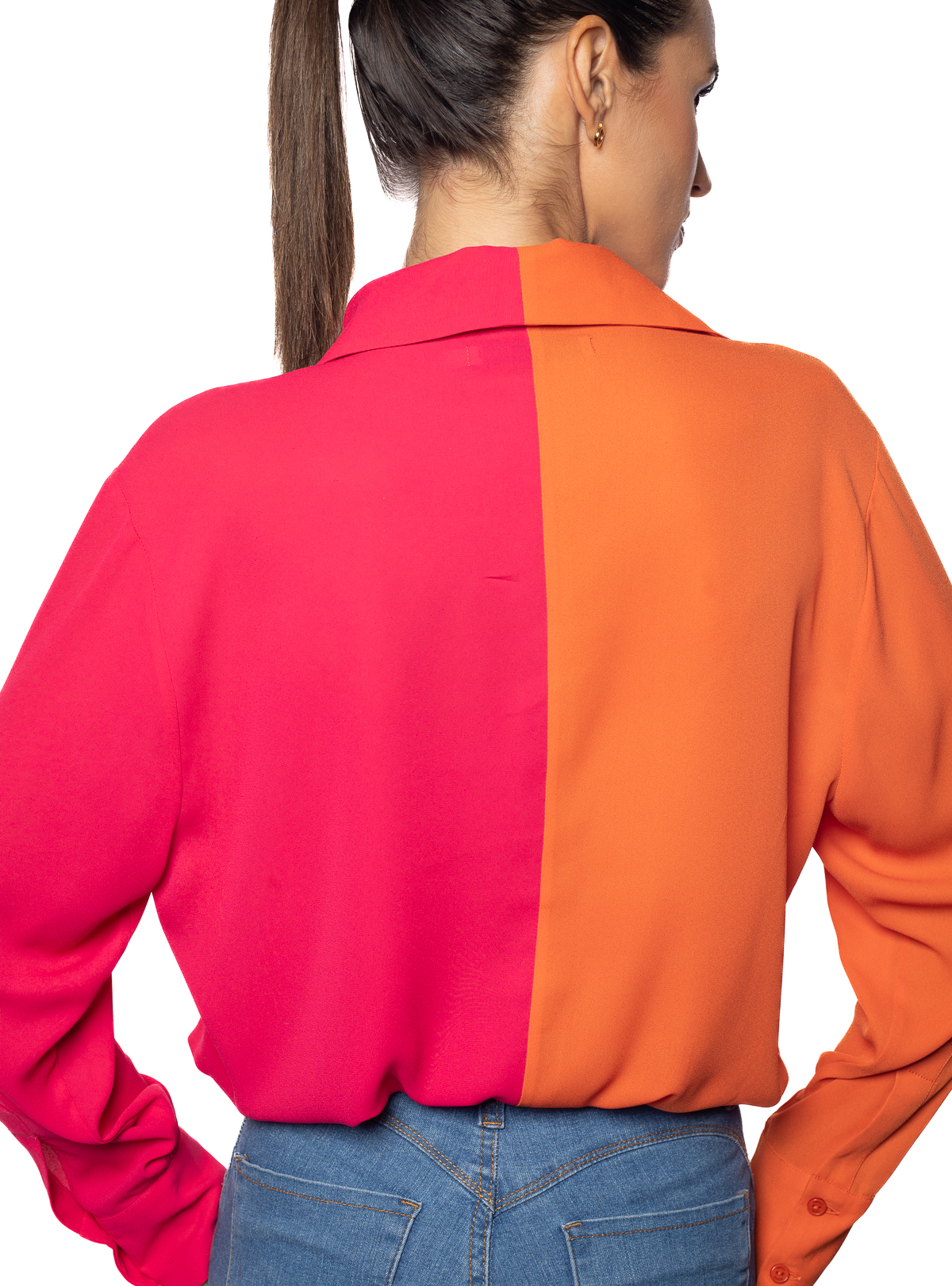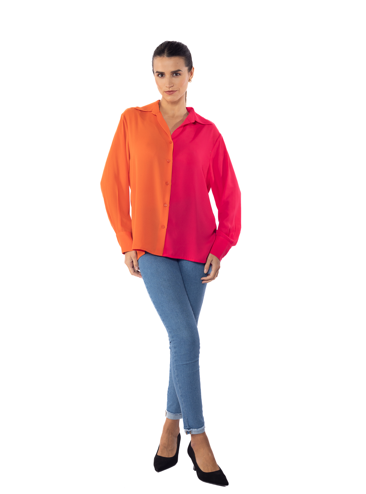 Make a bold statement with our Half N Half Shirt, a contemporary twist on classic tailoring. This striking shirt features a unique half-and-half color-block design—warm orange and a playful pink—effortlessly blending sophistication with modern edge. Crafted from a smooth, lightweight fabric, this shirt offers a comfortable fit and refined drape. It includes a classic collar, full-length sleeves with buttoned cuffs, and a sleek front button placket that enhances its polished look.