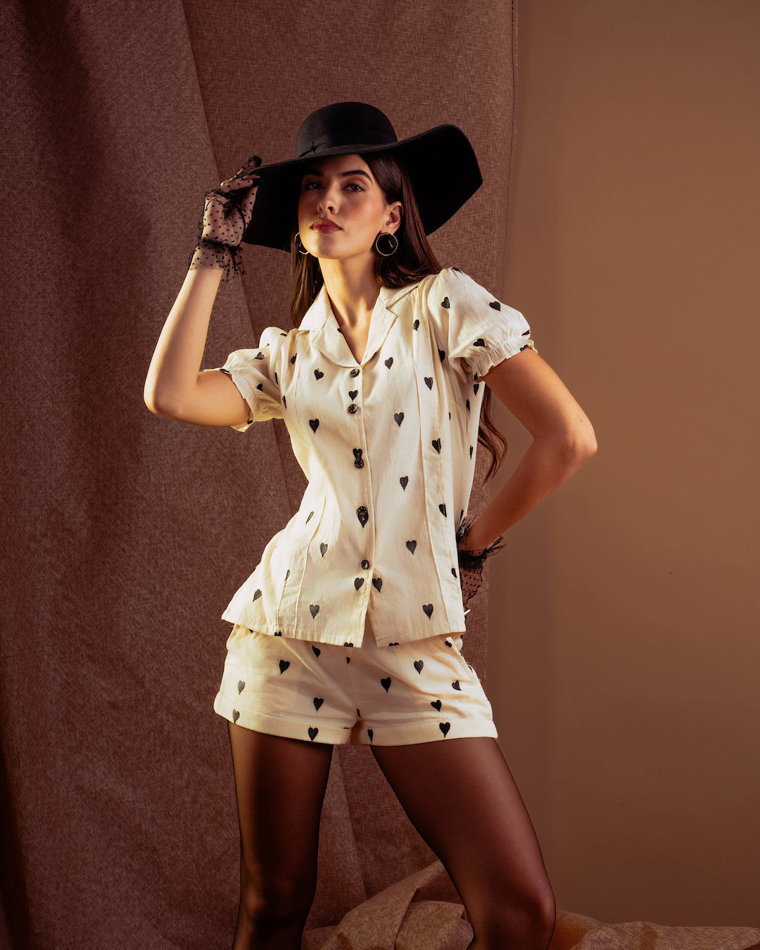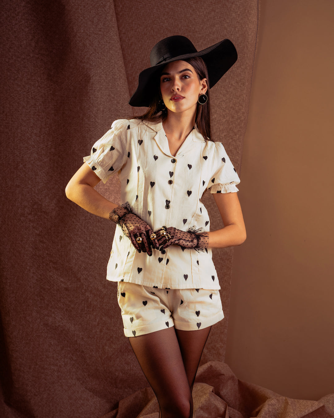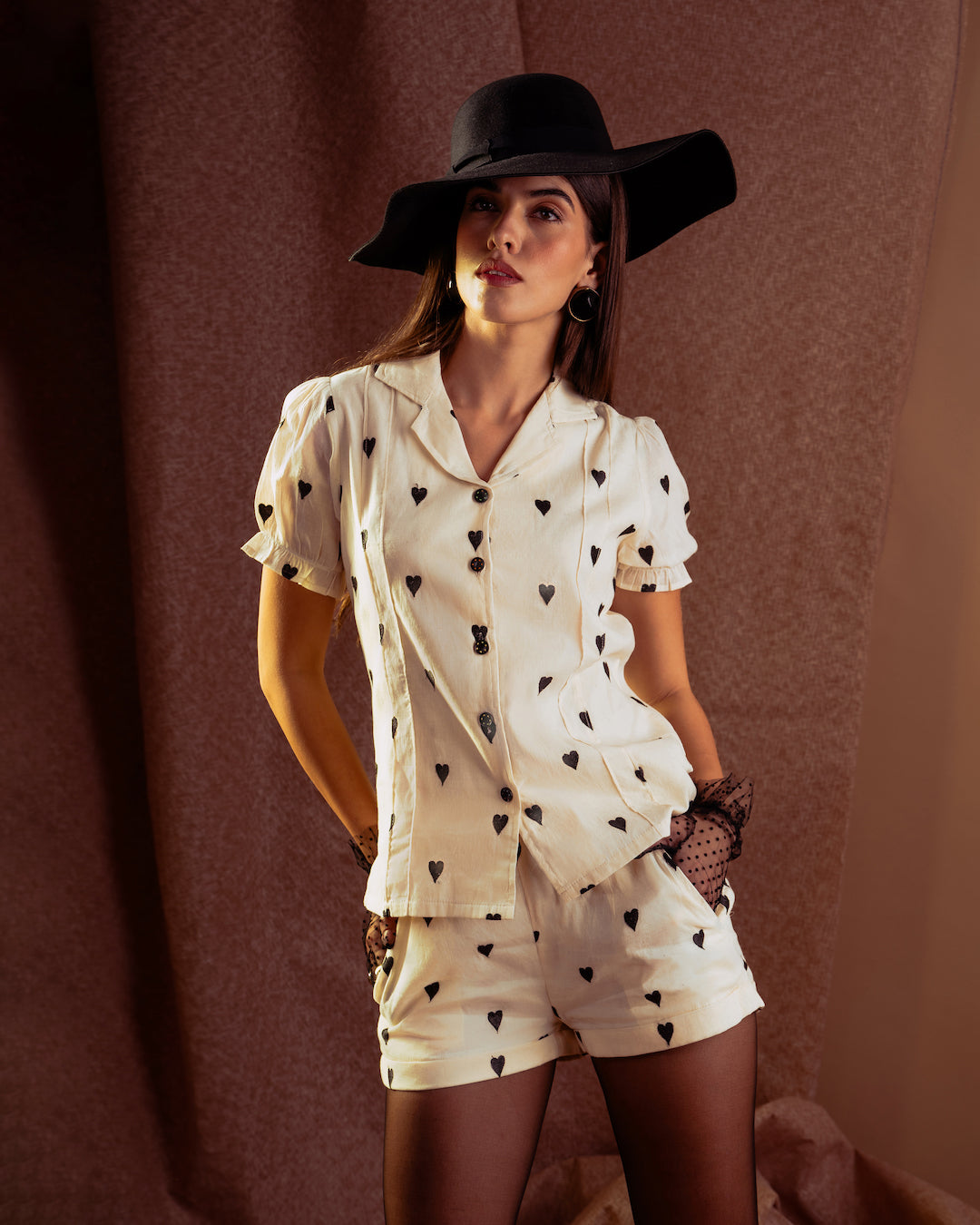 This cotton shorts set is the perfect causal holiday look. The top features a collared neck with short balloon sleeves & pintucks. It is paired with semi fit matching shorts that have a soft cotton lining.