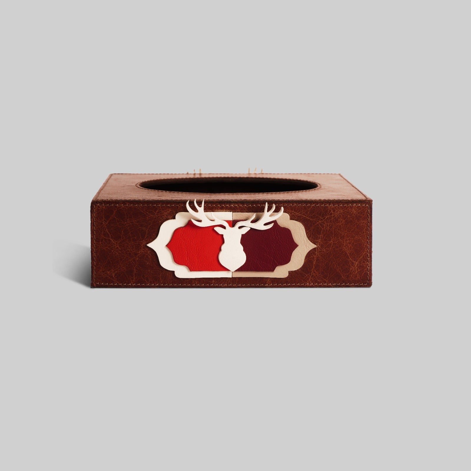 Heritage Tissue Box beautifully merges tradition with elegance, featuring a majestic deer face intricately placed within a classic Jharokha Motif. Crafted from genuine leather, this exquisite piece adds a refined and cultural charm to your space. Its thoughtful design enhances functionality while serving as a sophisticated décor element.