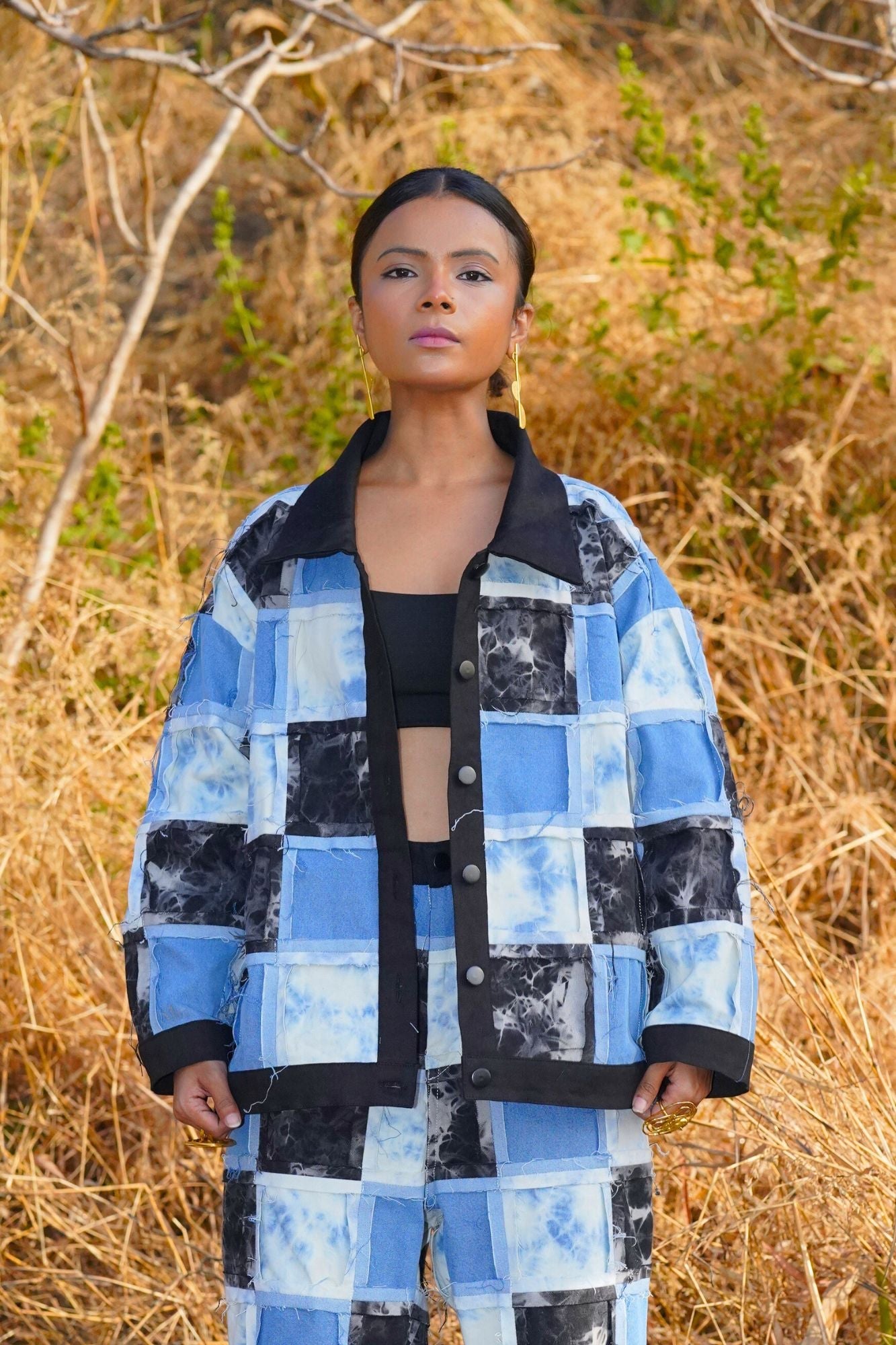 Description – Introducing the Horizon Jacket - a statement piece featuring a unique square patchwork design and denim patches that are hand tie-dyed for a cool and trendy look. Up your style game with this one-of-a-kind jacket
