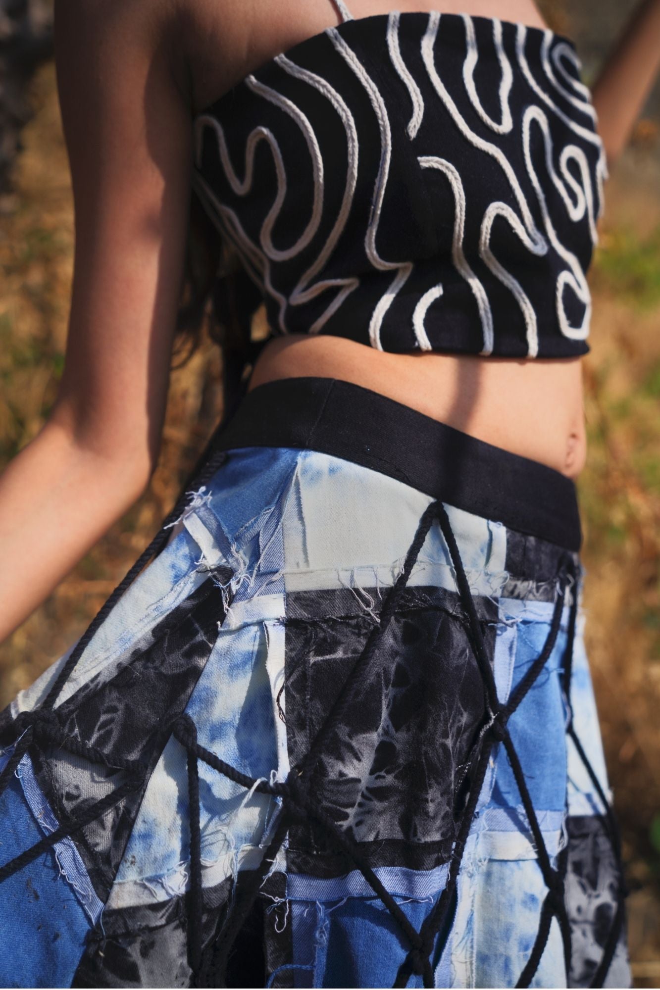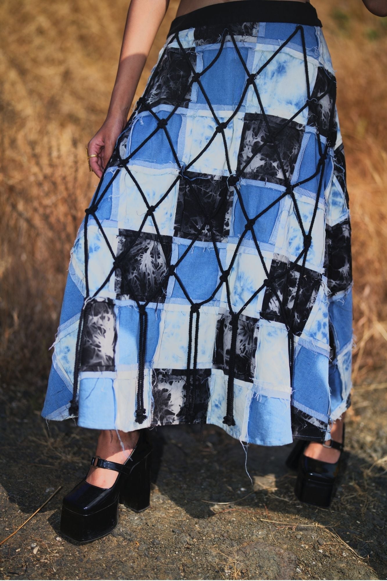 Description – Elevate your wardrobe with the HORIZON SKIRT. This statement piece boasts a unique square patchwork design with hand tie-dyed denim patches. The skirt is accented with a loose hand macramé detail in black yarn, adding a trendy touch to this must-have piece. Stand out in style with the Horizon Skirt.