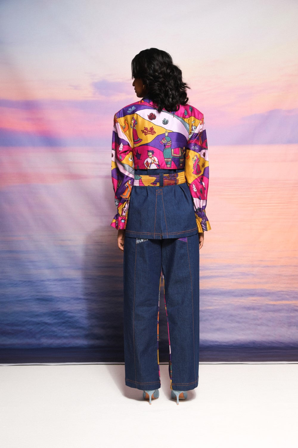 - Printed panels in the front. Front zip fly and metal button fastening.