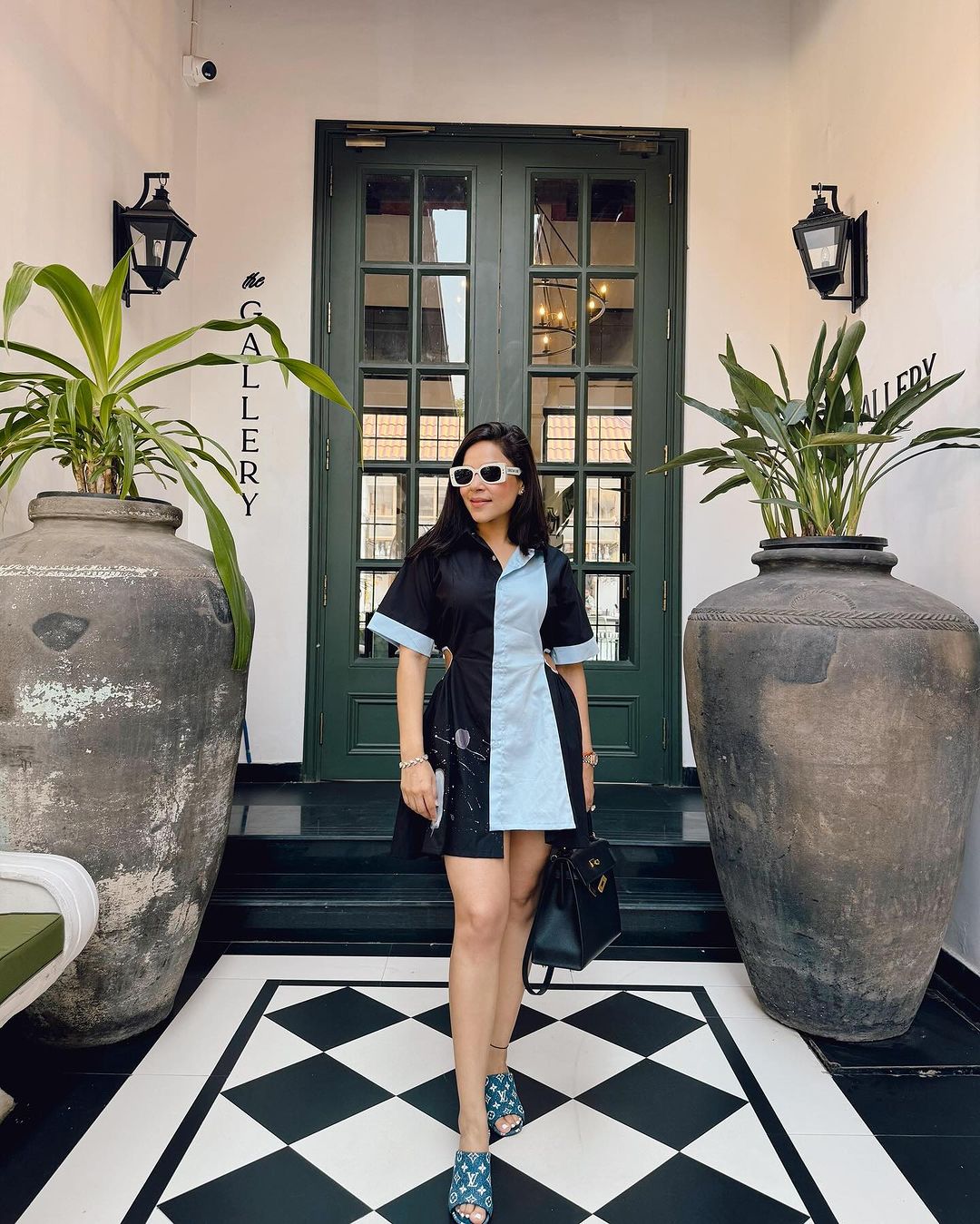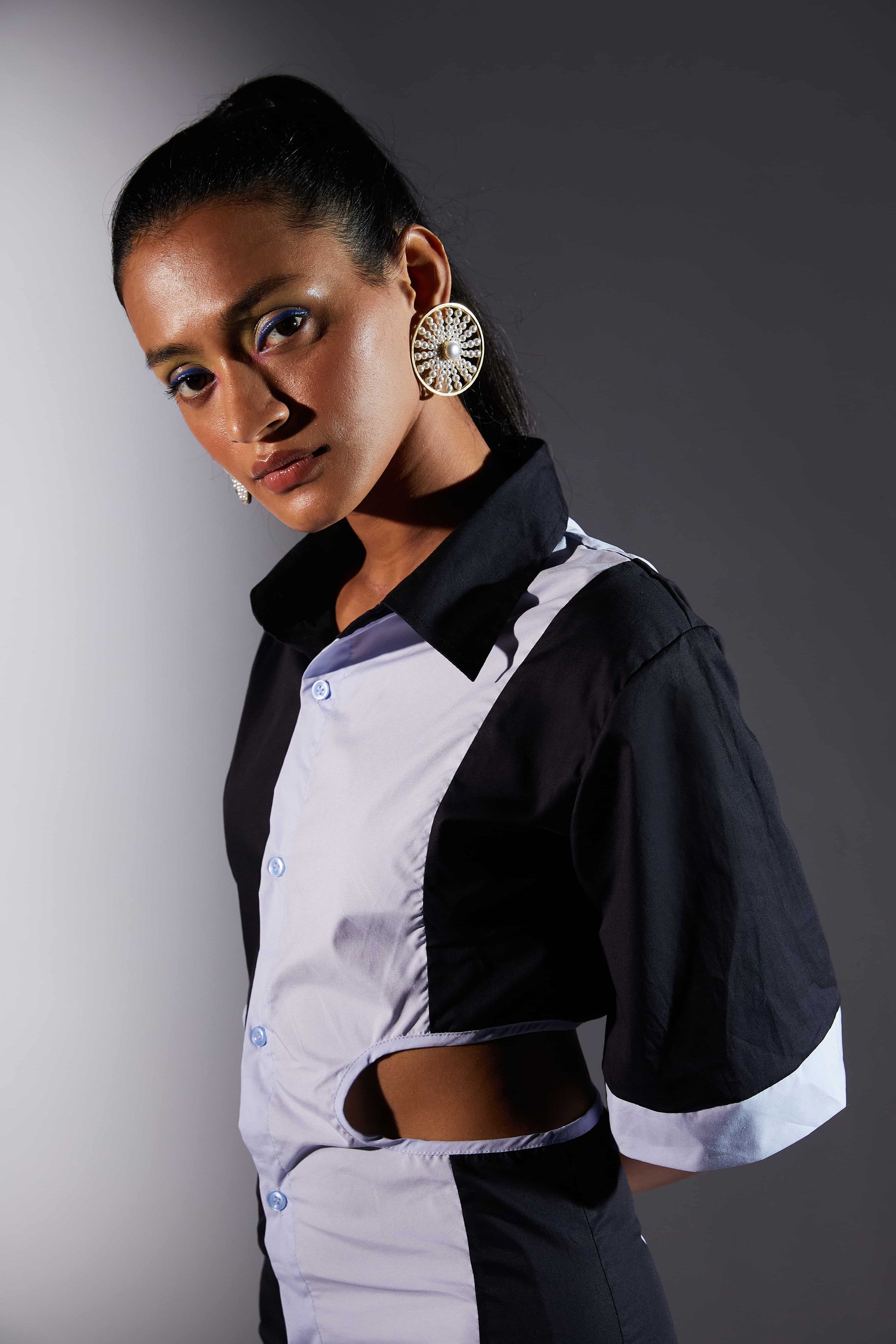Asymmetric Two-tone shirt dress with short sleeves finished with contrasting color on the hem. A cut-out waist detail with a Button-up front. Featuring asymmetric "Ice - cream space". The ice cream space is designed in collaboration with Muskaan. An NGO for specially-abled. This artwork was created by Vasu. 15% of our net profit will be donated for their welfare.