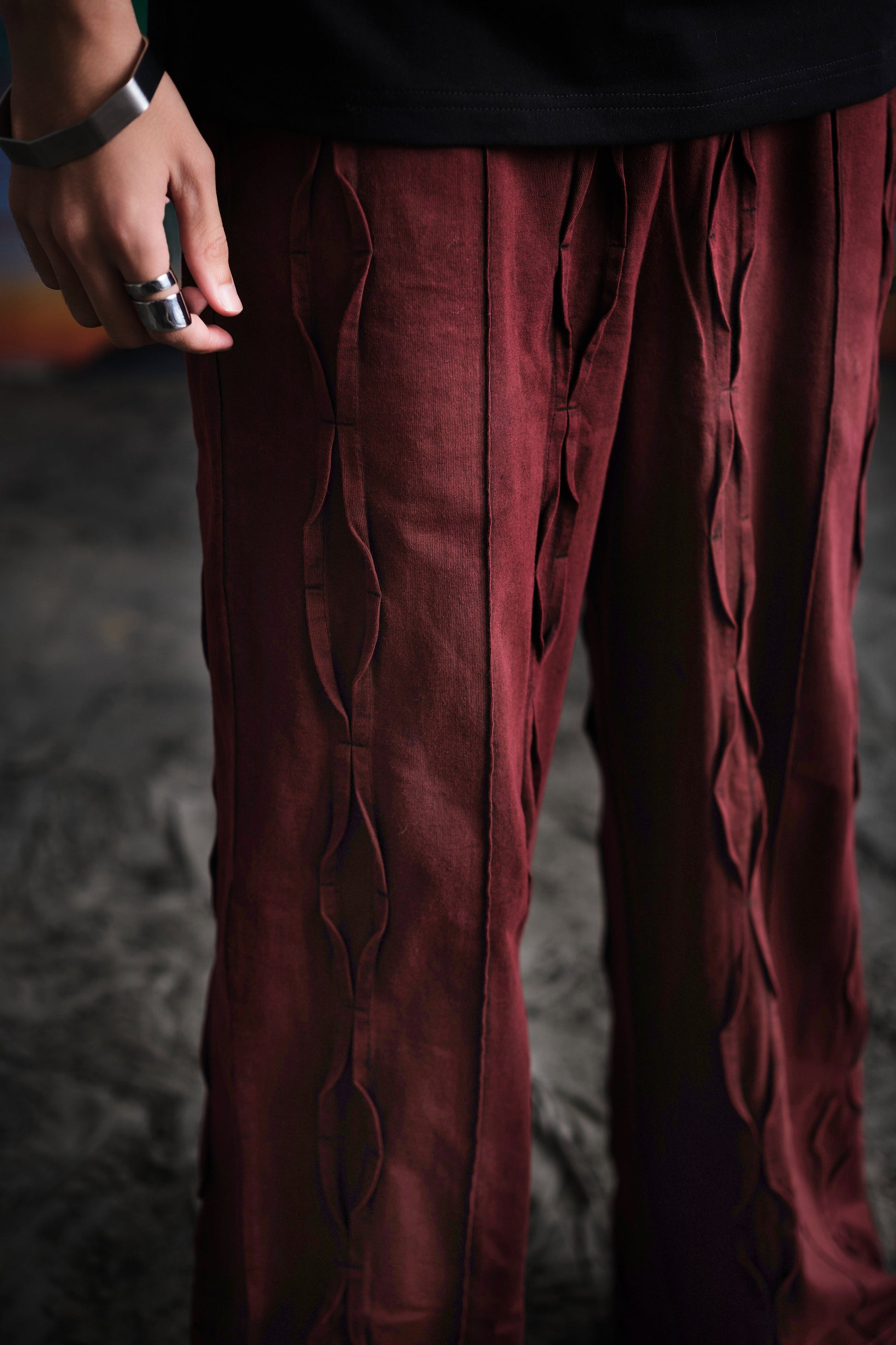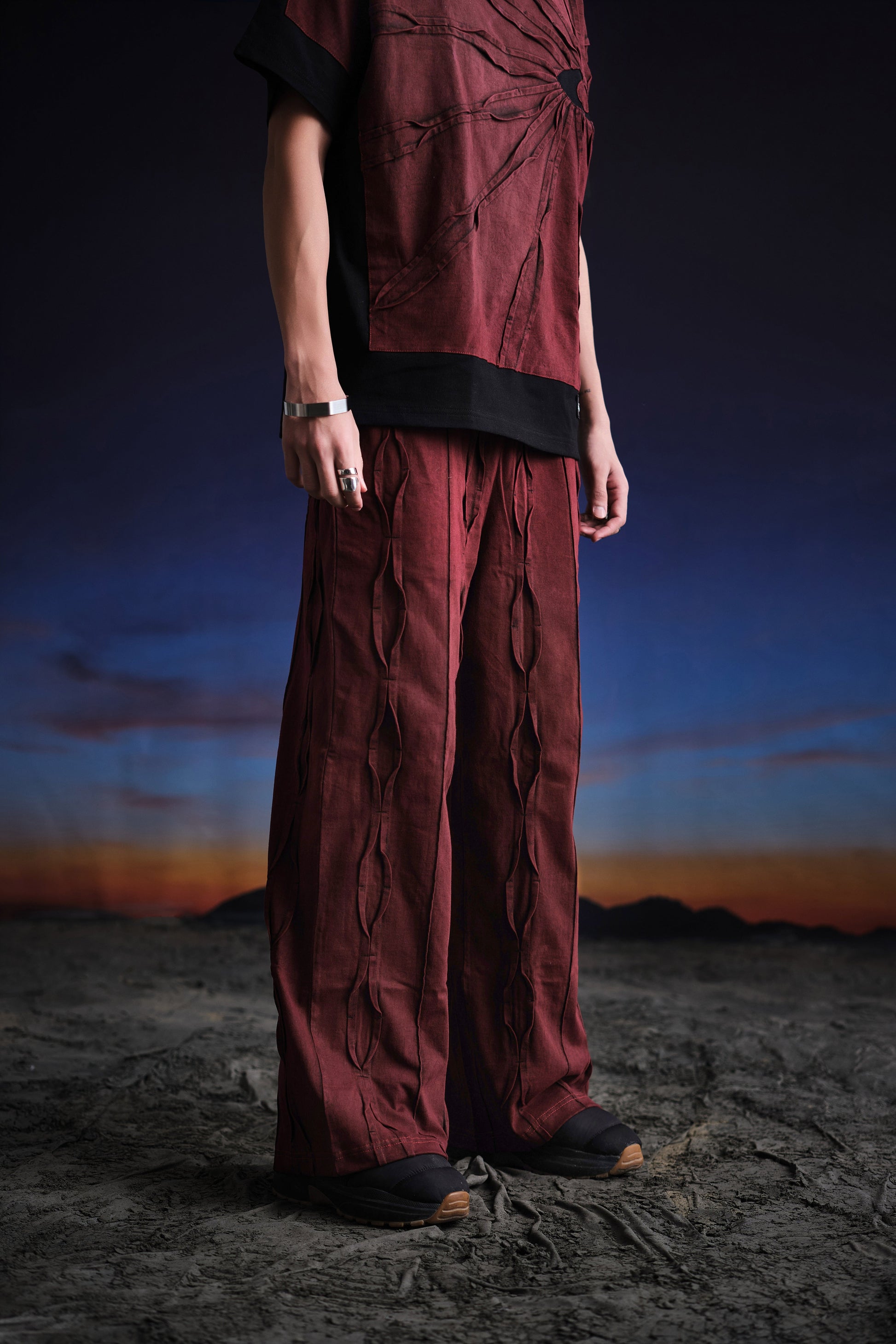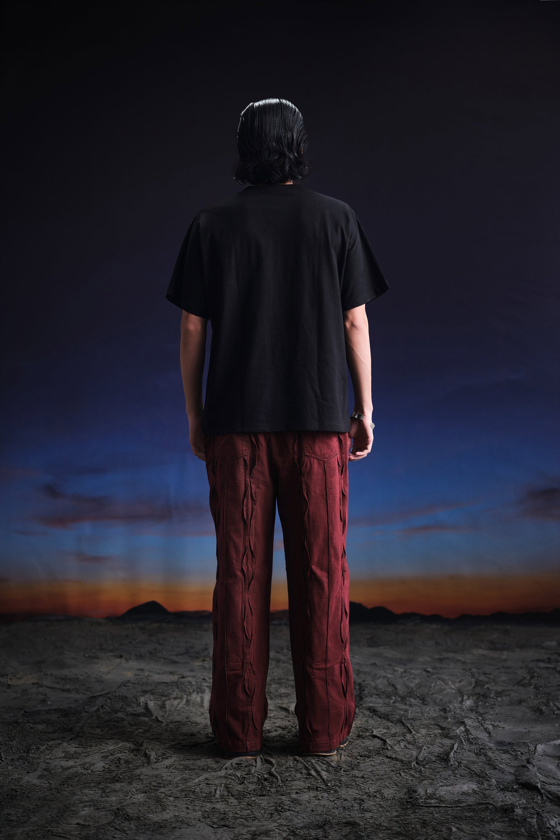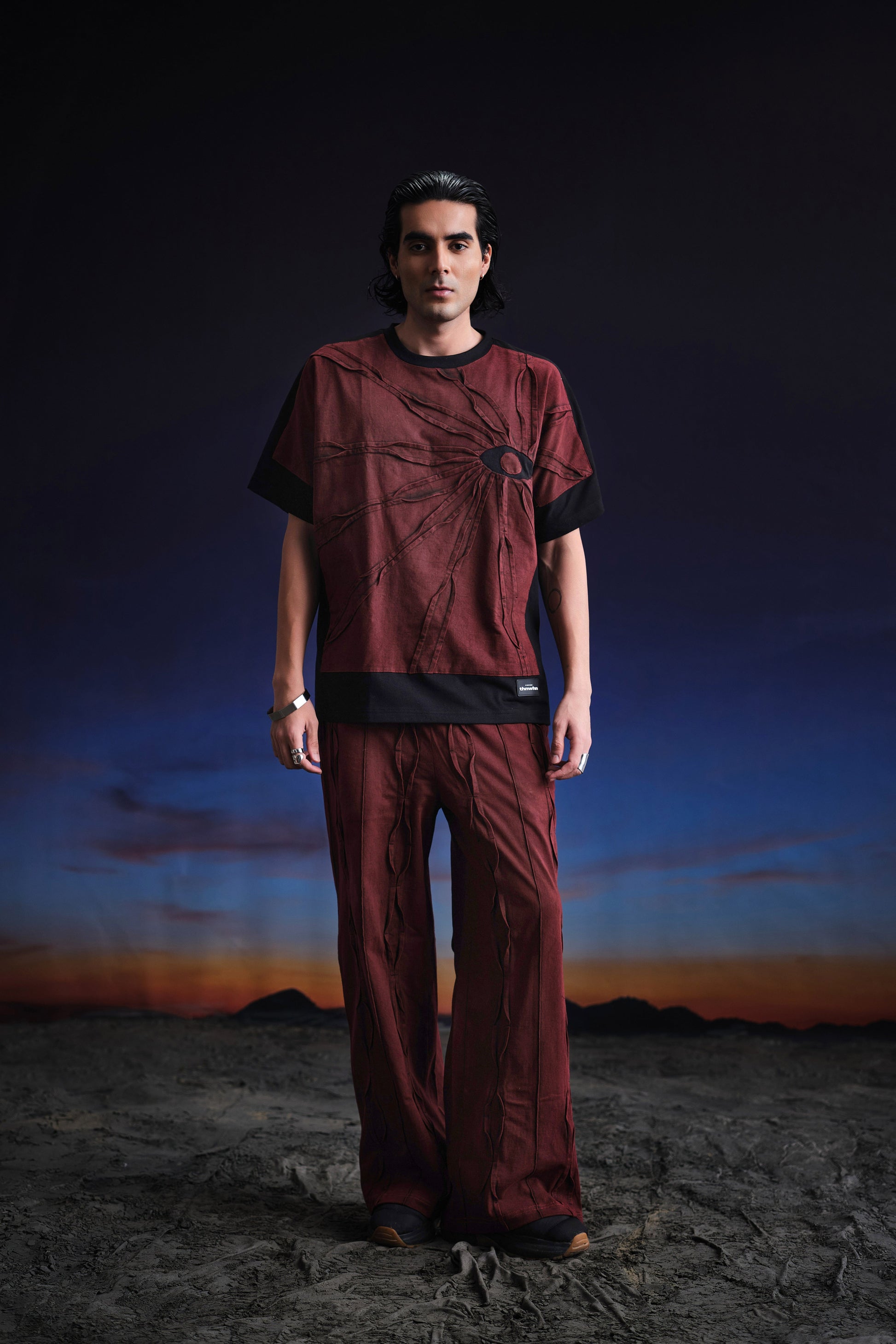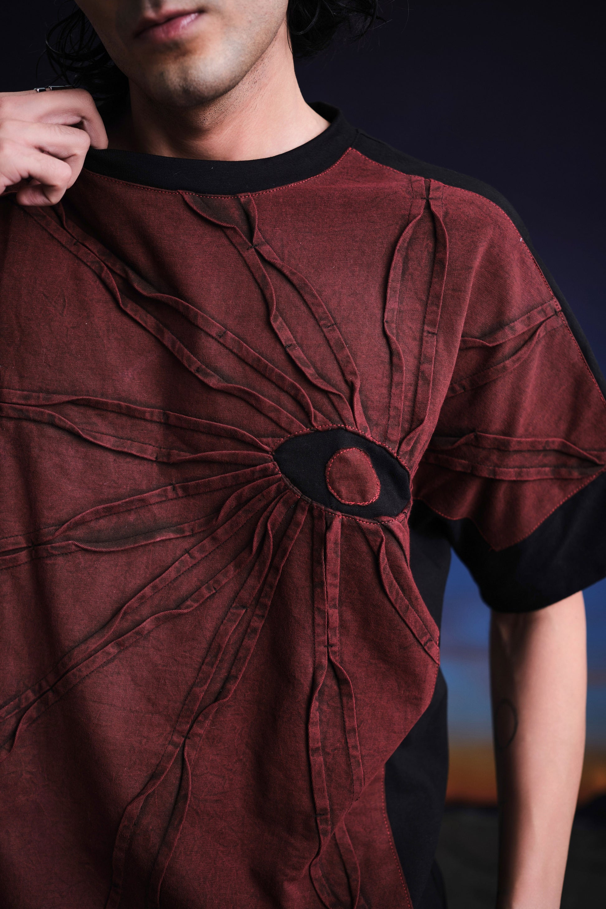 - Top: Inspired by the concept of awakening, this tee features an eye-shaped chest panel with precisely constructed pin tucks and wave tucks resembling sun rays. Finished with an acid wash to highlight the intricate details.