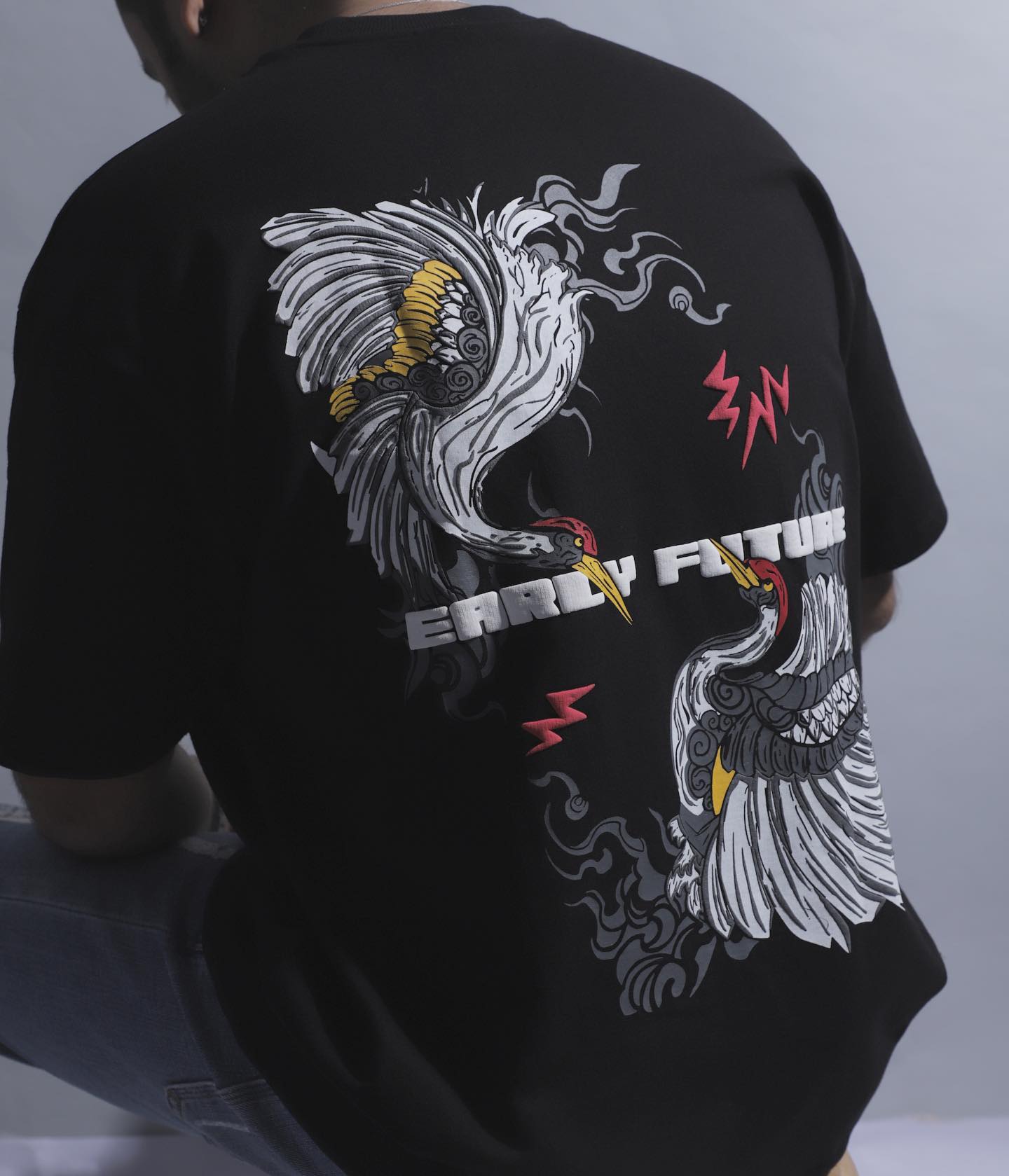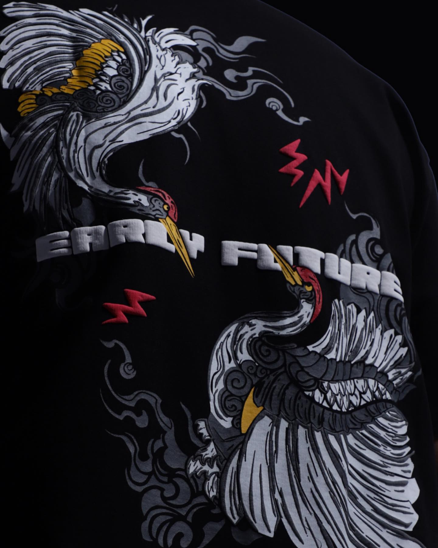 The artwork features two cranes, symbolic of longevity, balance, and harmony circling each other in motion, representing the pursuit of purpose and inner peace. The bold energy lines and smoke-like patterns reflect the constant flow between chaos and calm a reminder that finding your Ikigai is not a destination, but a journey.