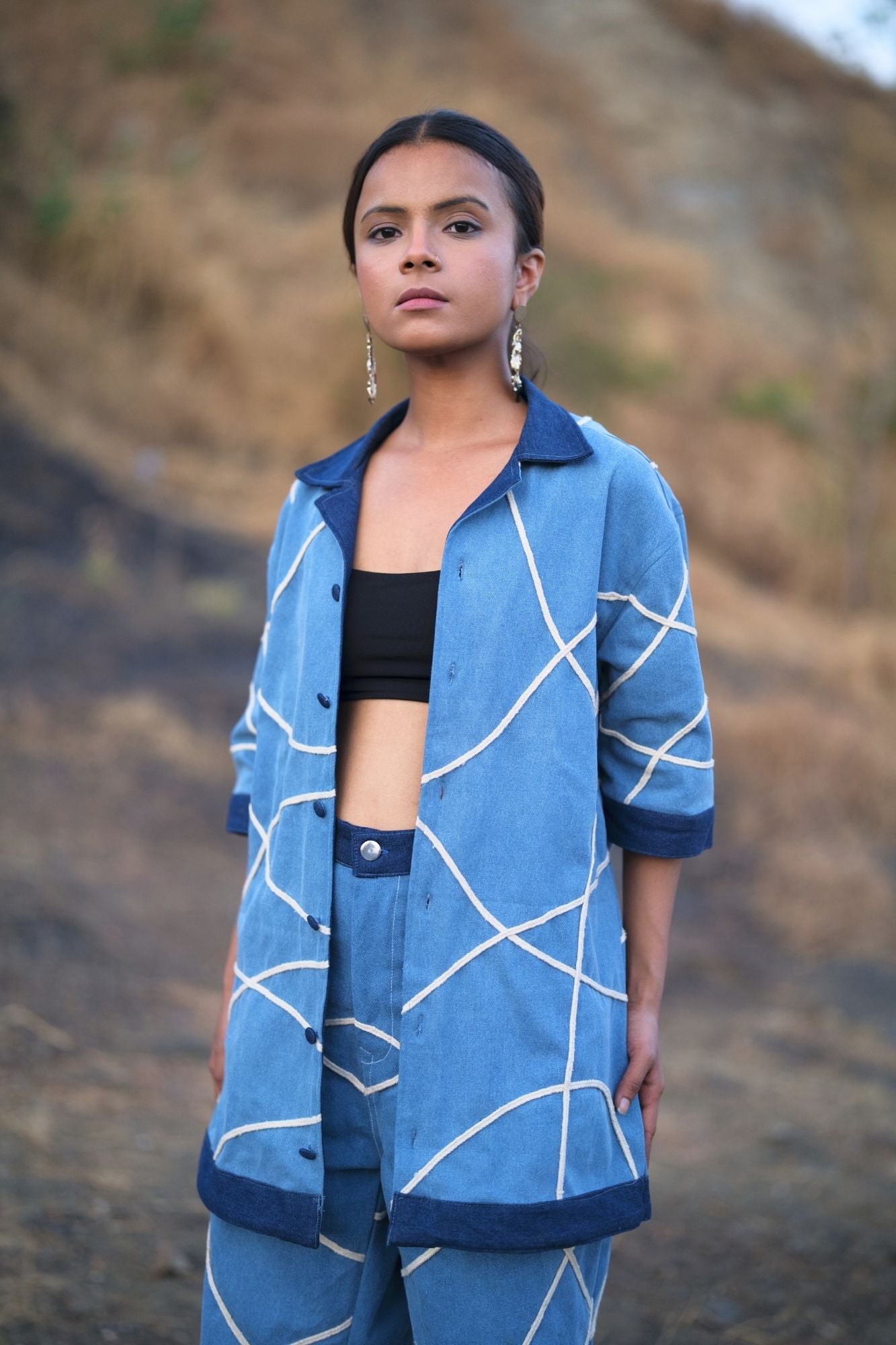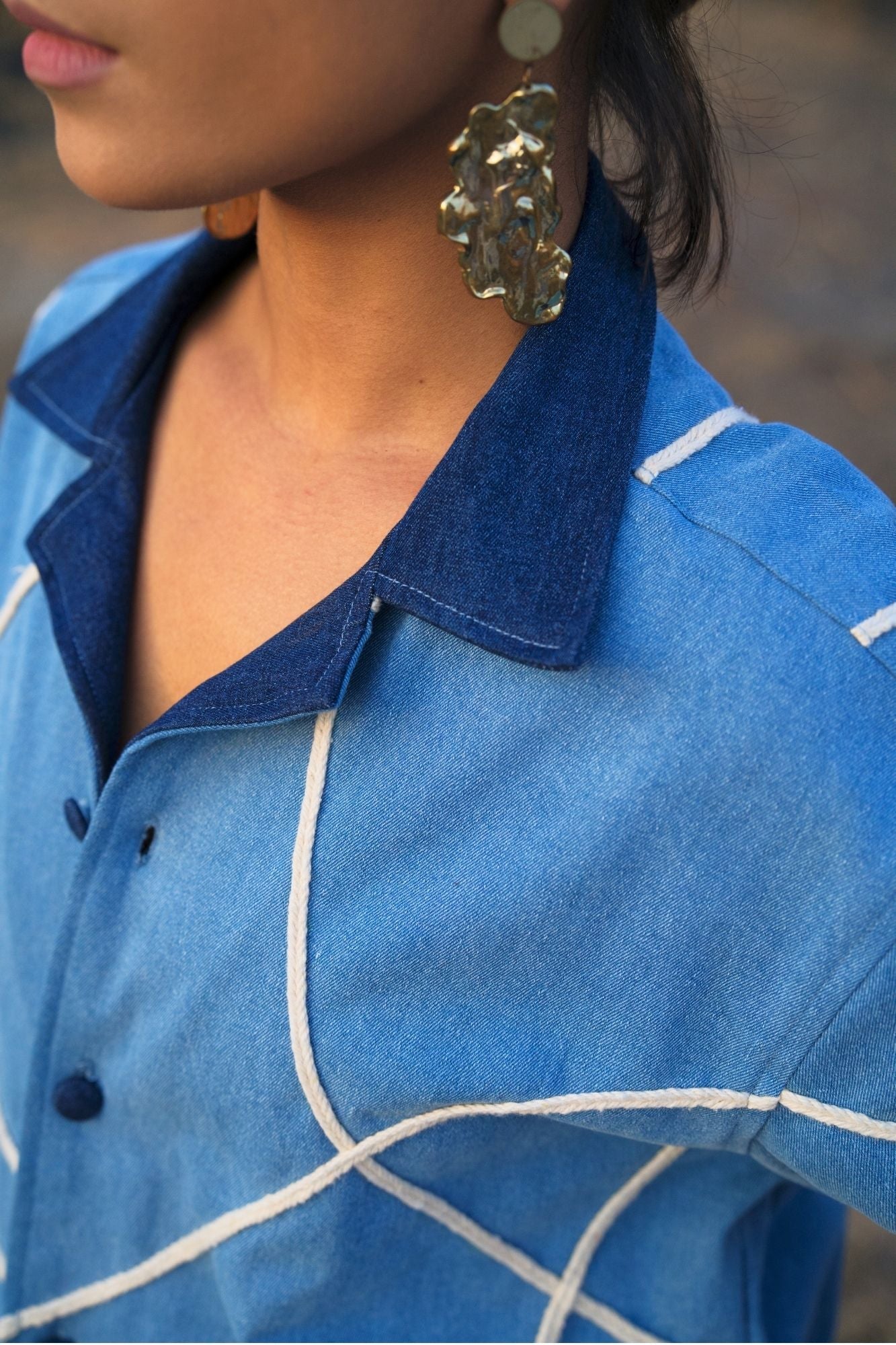 Description – Expertly crafted denim shirt with a unique hand-braided yarn interlaced pattern. Elevate your style with this INTERLACE SHIRT that offer a one-of-a-kind look. Made with precision and attention to detail, this shirt are the perfect blend of comfort and sophistication.