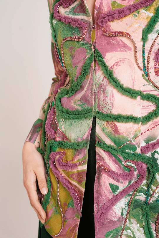 A sharp, embellished structured jacket with hook fastening at the front, paired with a deep green asymmetric drape skirt. The clean lines of the silhouette are balanced by the textural details, creating a polished yet directional ensemble.