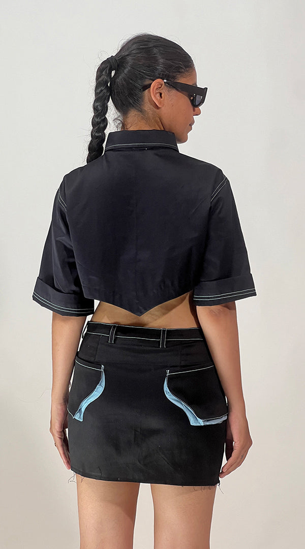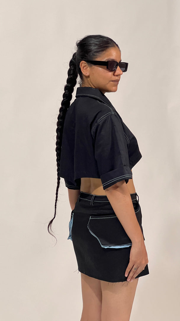 This shirt is cut from black cotton fabric with curve hems at the waist line. It has lime asymmetric hand embroidery detailing in the shape of a pocket. It has pop powder blue stitch detailing all around.
