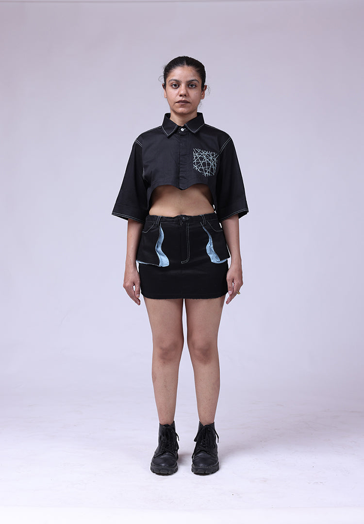 This shirt is cut from black cotton fabric with curve hems at the waist line. It has powder-blue asymmetric hand embroidery detailing in the shape of a pocket. It has pop powder blue stitch detailing all around.