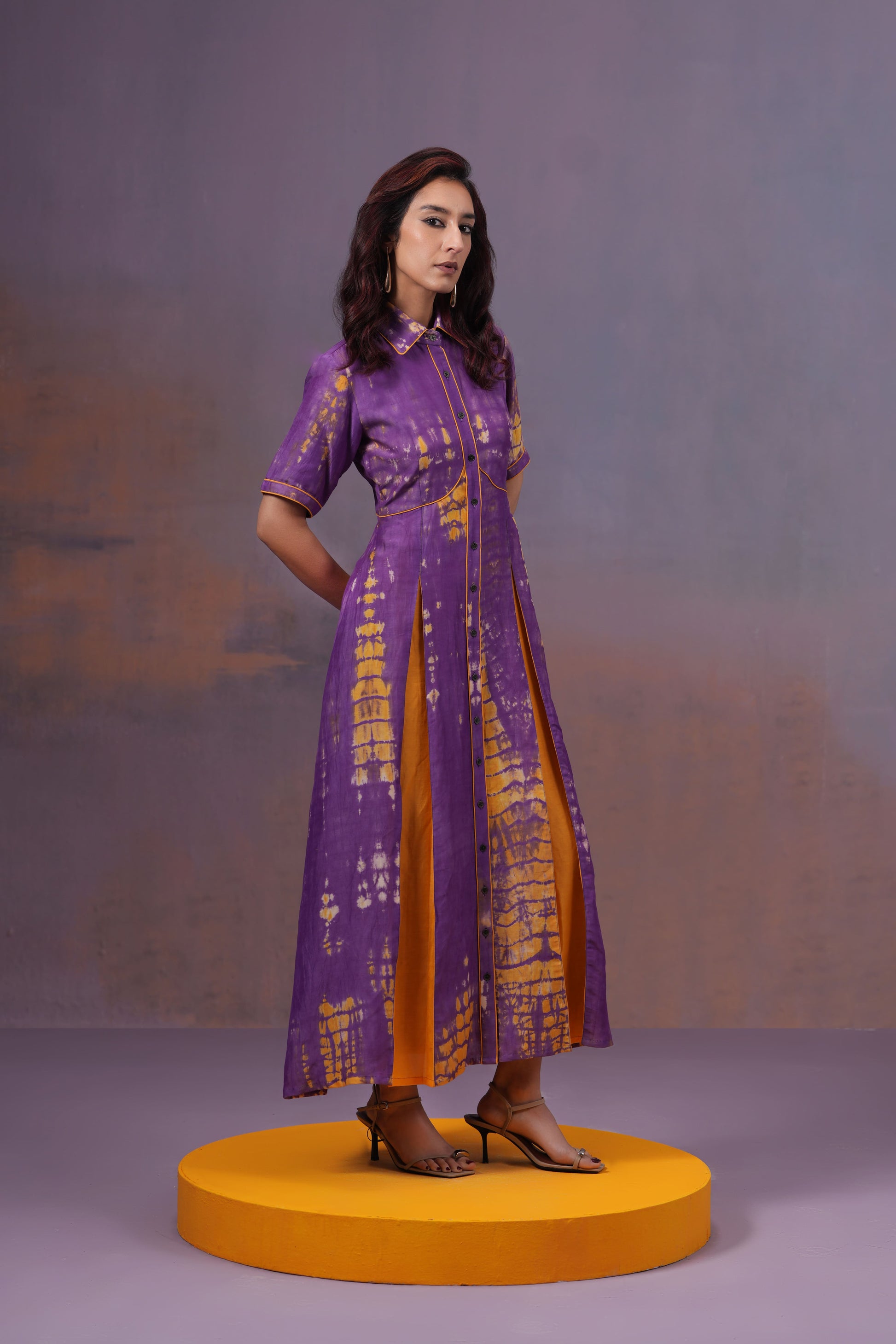 A Line Flared Button Down Hand Dyed Shibori Dress. Comes with Inverted contrasting box pleats on the front.
