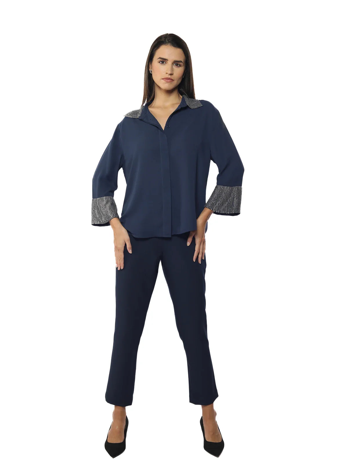 Update your wardrobe with this fresh take on the classic button-down. Featuring metal sequin details on the collar and cuffs, and a concealed placket with buttons, this shirt is the perfect blend of modern style and timeless sophistication.