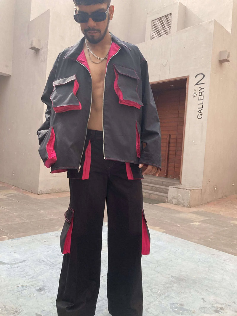 The jacket is cut from a heavy black cotton fabric with 4 statement river pockets with hot pink hidden detailing. The pocket goes from front till the back. It has black stitch detailing all over and zipper opening in front.