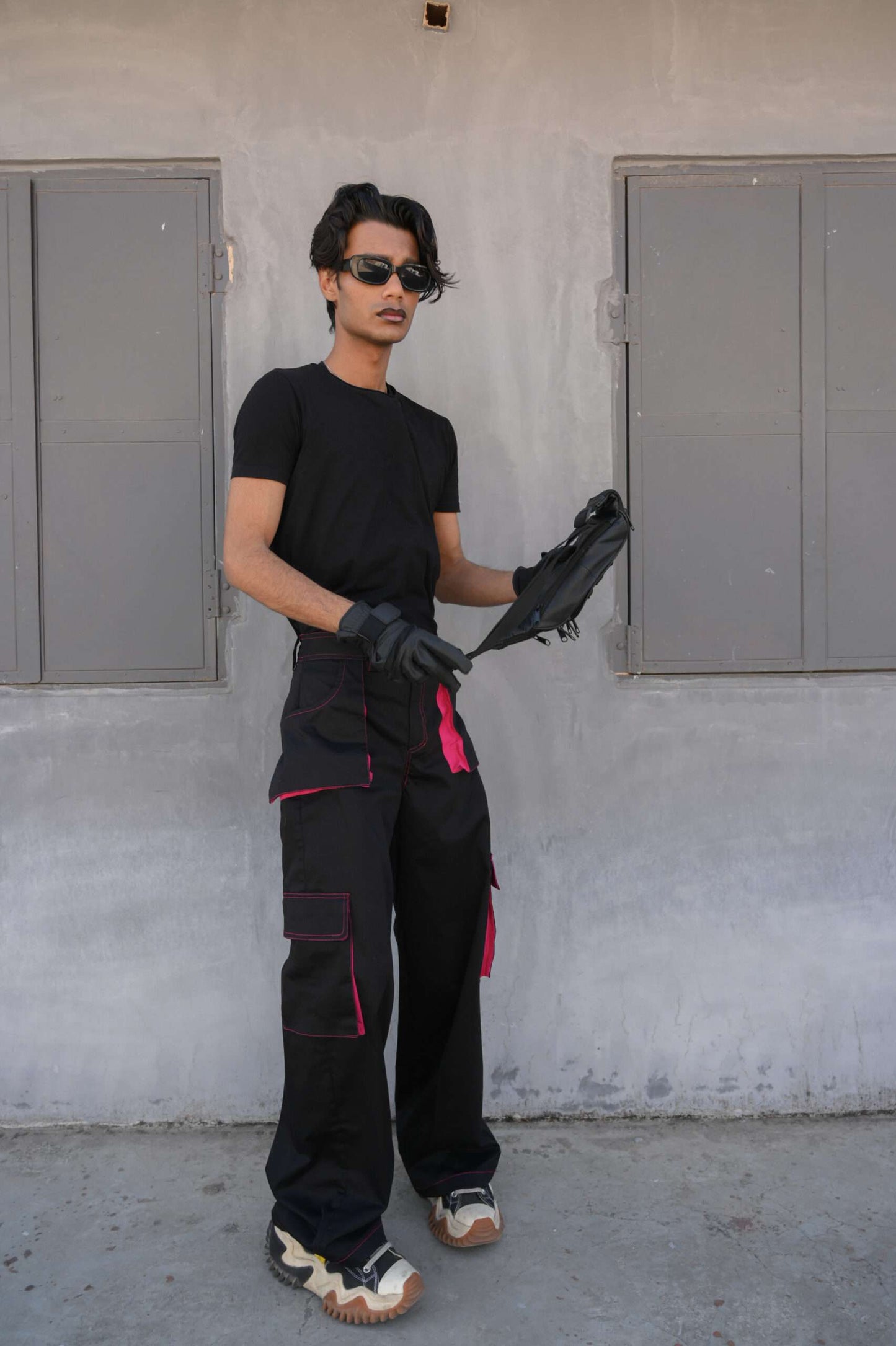 Wide-leg black cargo pants with a kick of hot pink patch pocket detail on the boundaries. The unique front pockets are patched till the back. It is stitched with bright popping hot pink threads (that we swear by you would die for) all over.
