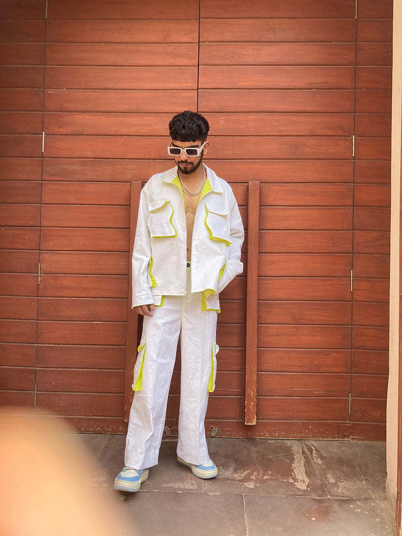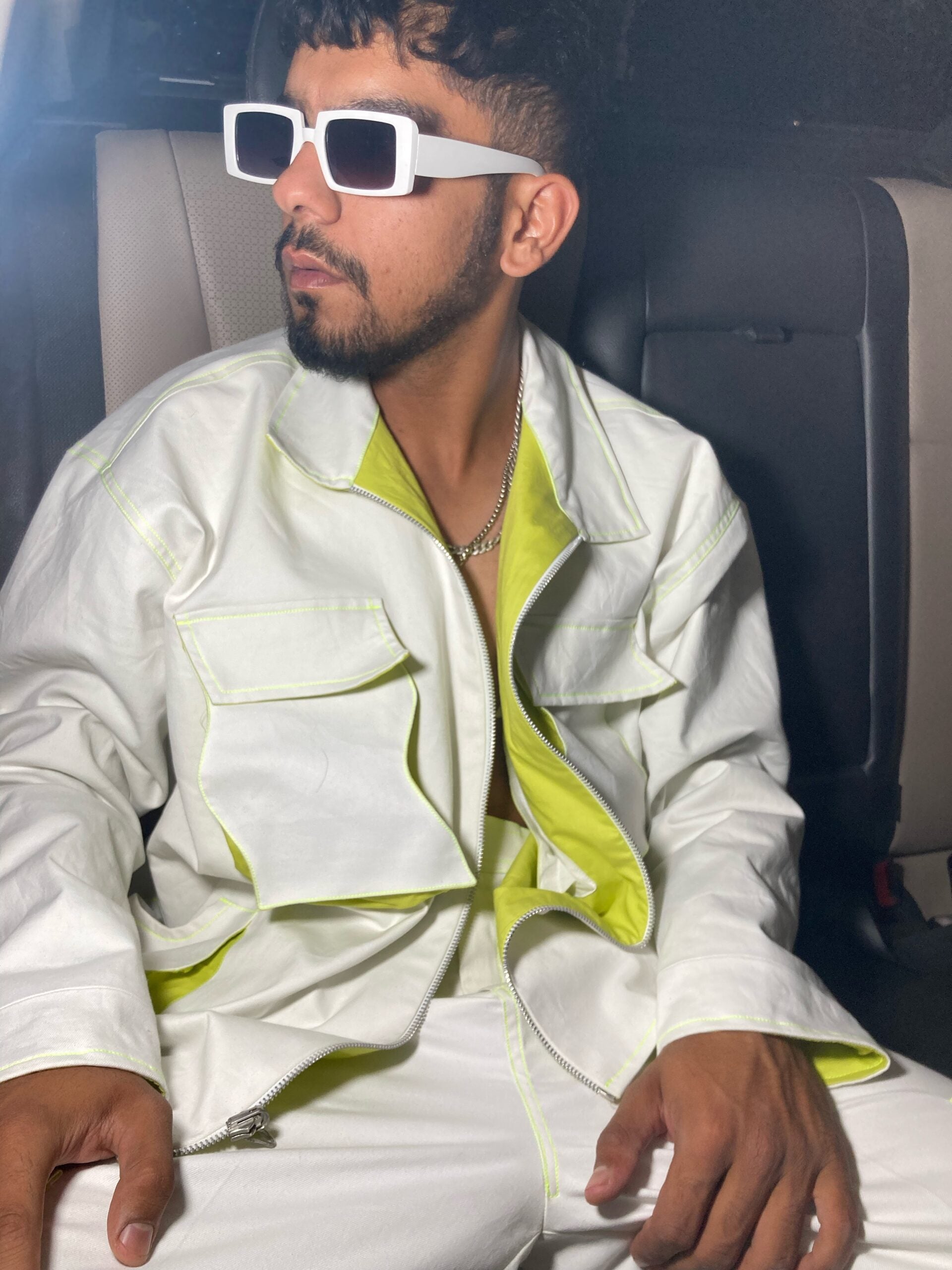 This jacket is cut from a white denim fabric with 4 statement river pockets with lime hidden detailing. The pocket goes from front till the back. It has lime stitch detailing all over and zipper opening in front.