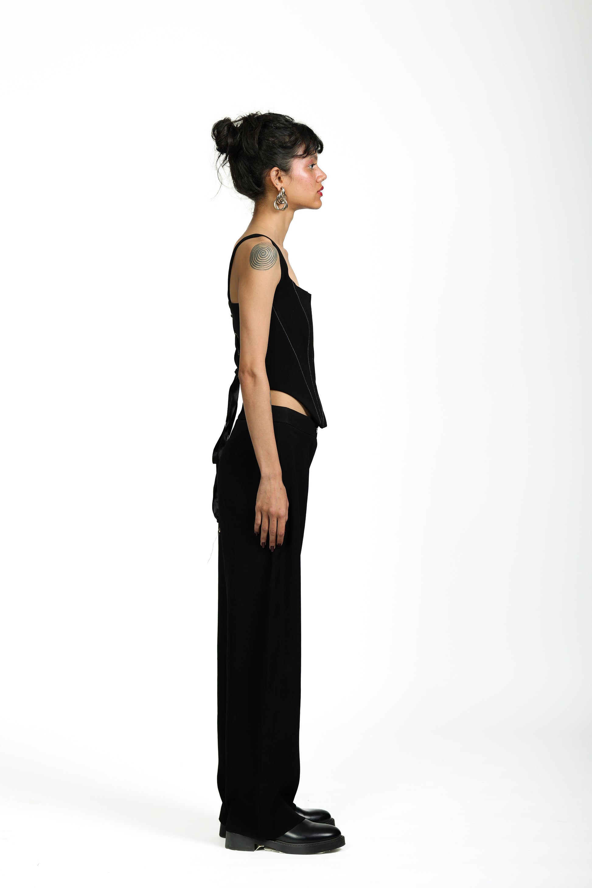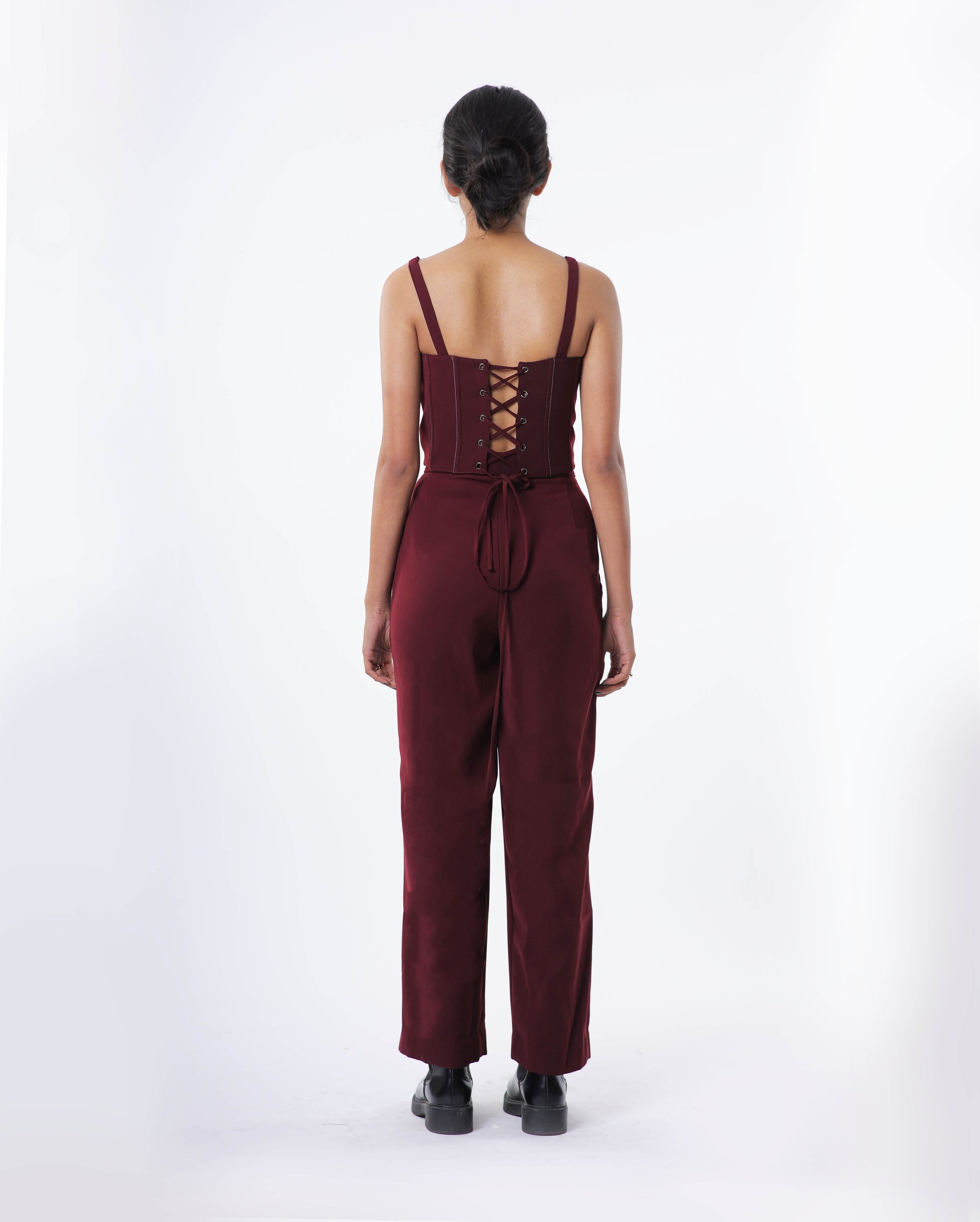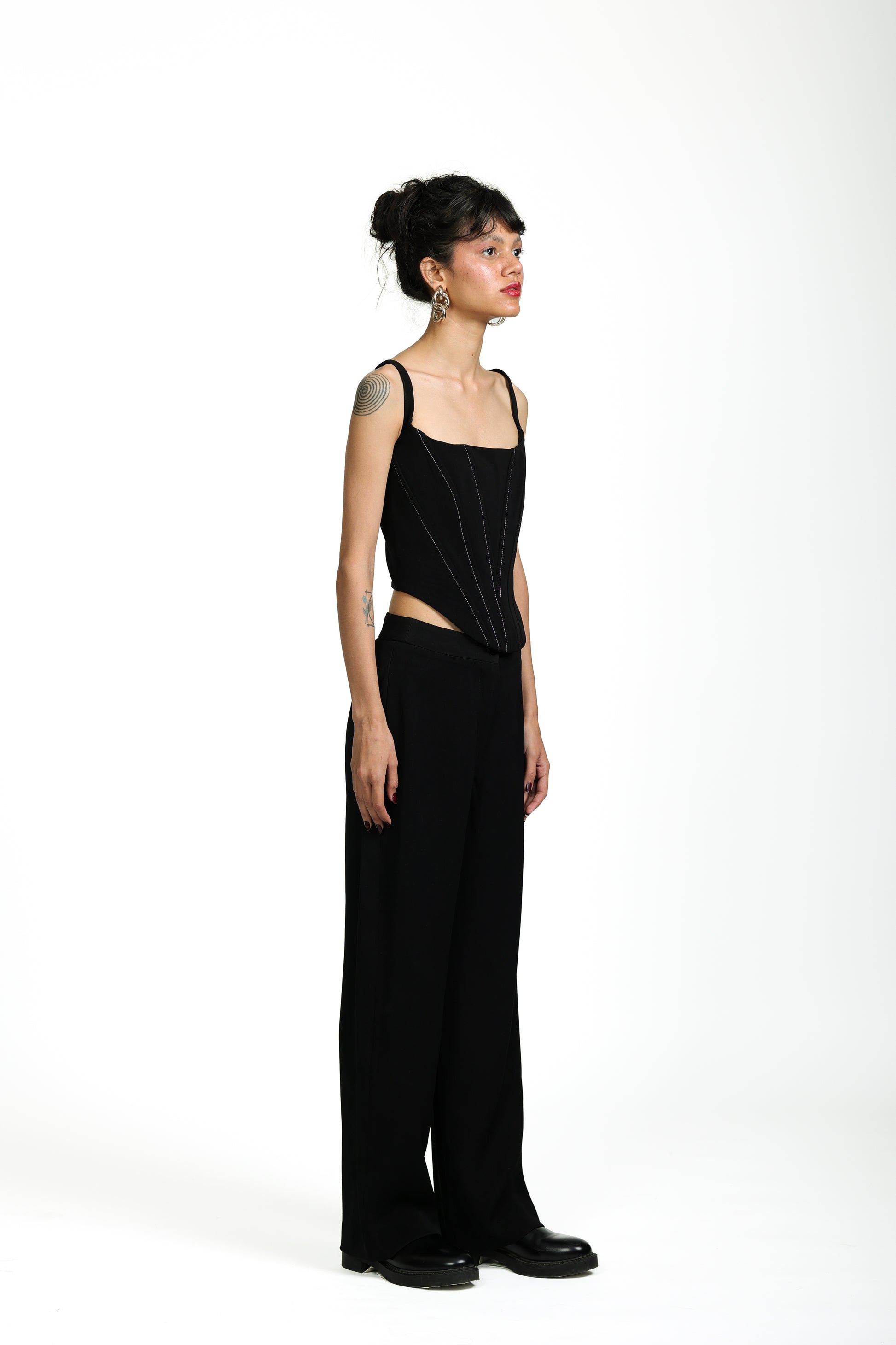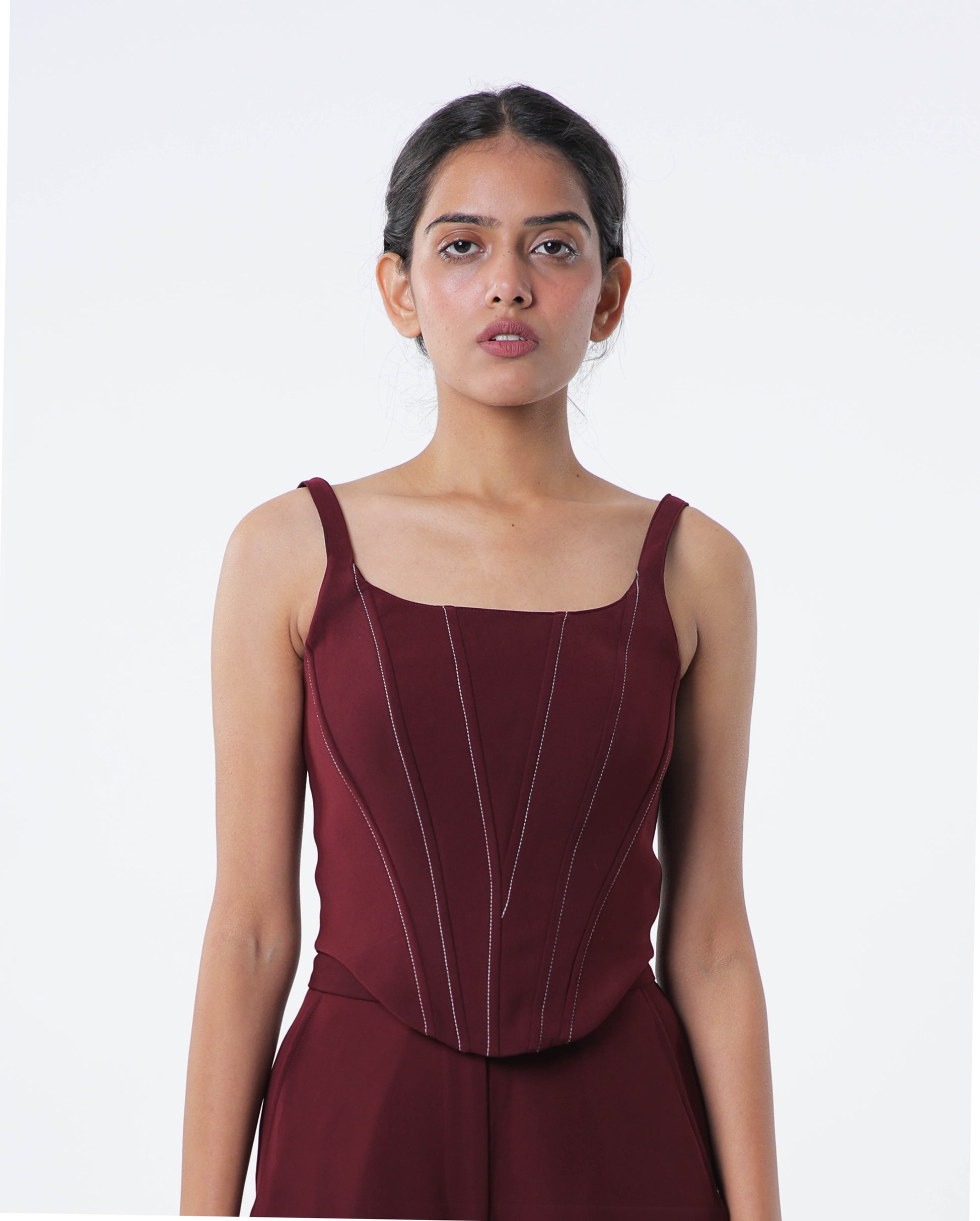 Knotty corset with white stitch detail for your date night, it truly shines when paired with high waisted pants. The back tie-up option ensures flexibility, accommodating slight weight fluctuations.