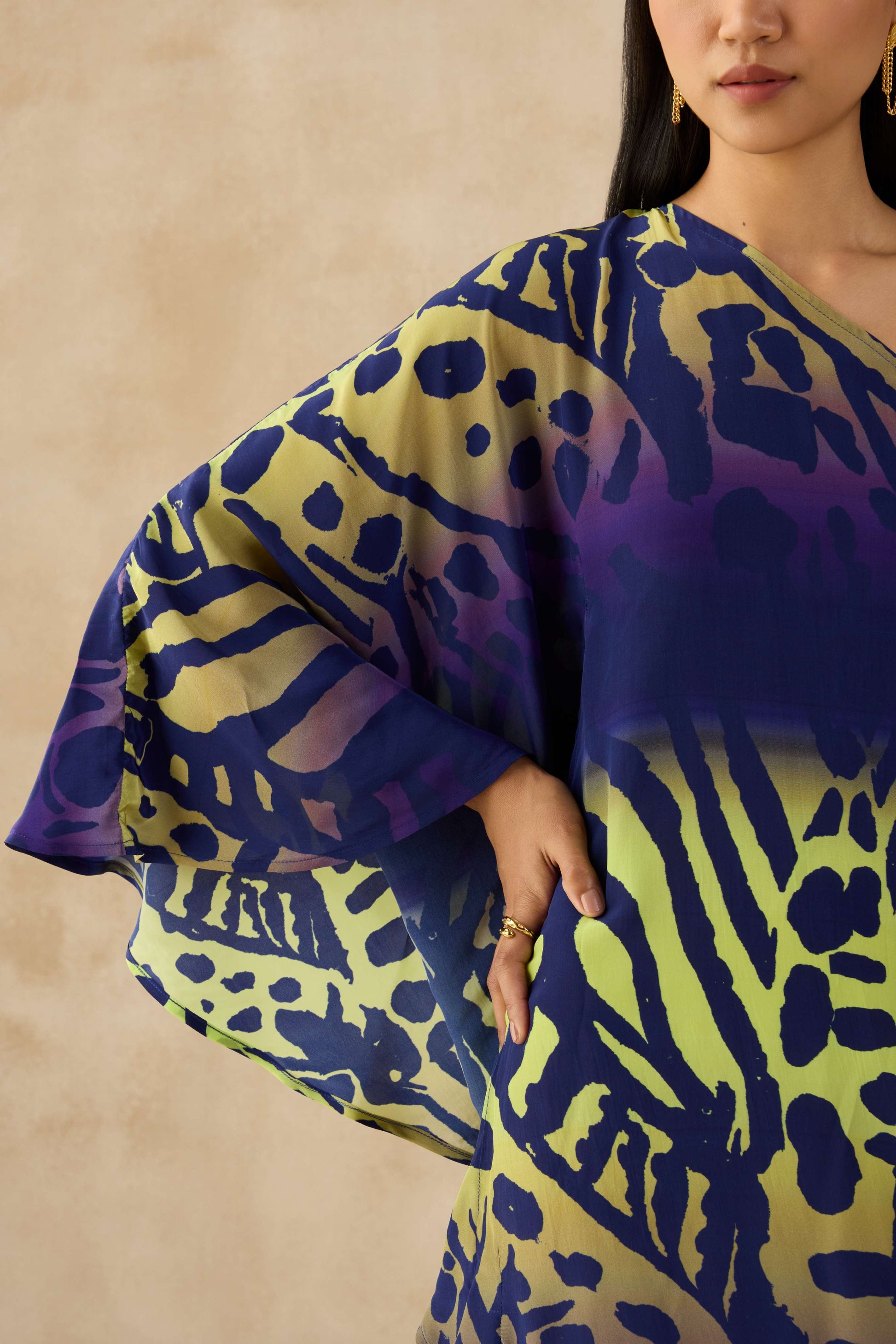 The Ko Samui Dress is a mesmerizing emsemble with its vivid blend of deep blues, electric greens, and inky purples dancing across the fabric like a night sky in motion. The one-shoulder silhouette drapes effortlessly, while the asymmetrical hem adds a touch of movement.Crafted from airy, lightweight crepe fabric, this piece is designed to captivate, whether you're strolling under city lights or embracing the magic of an evening escape.