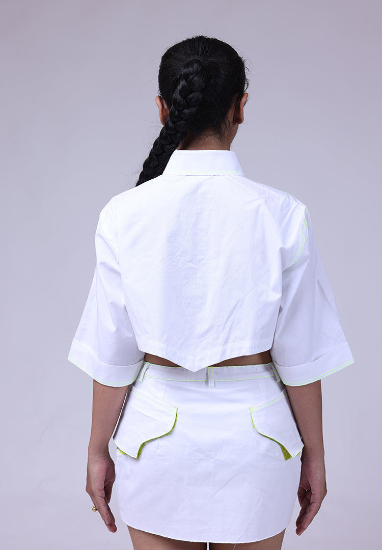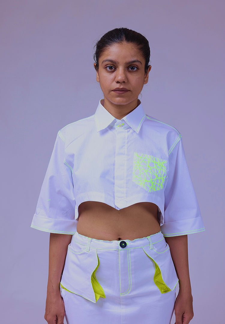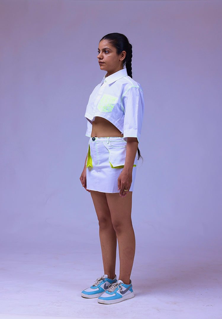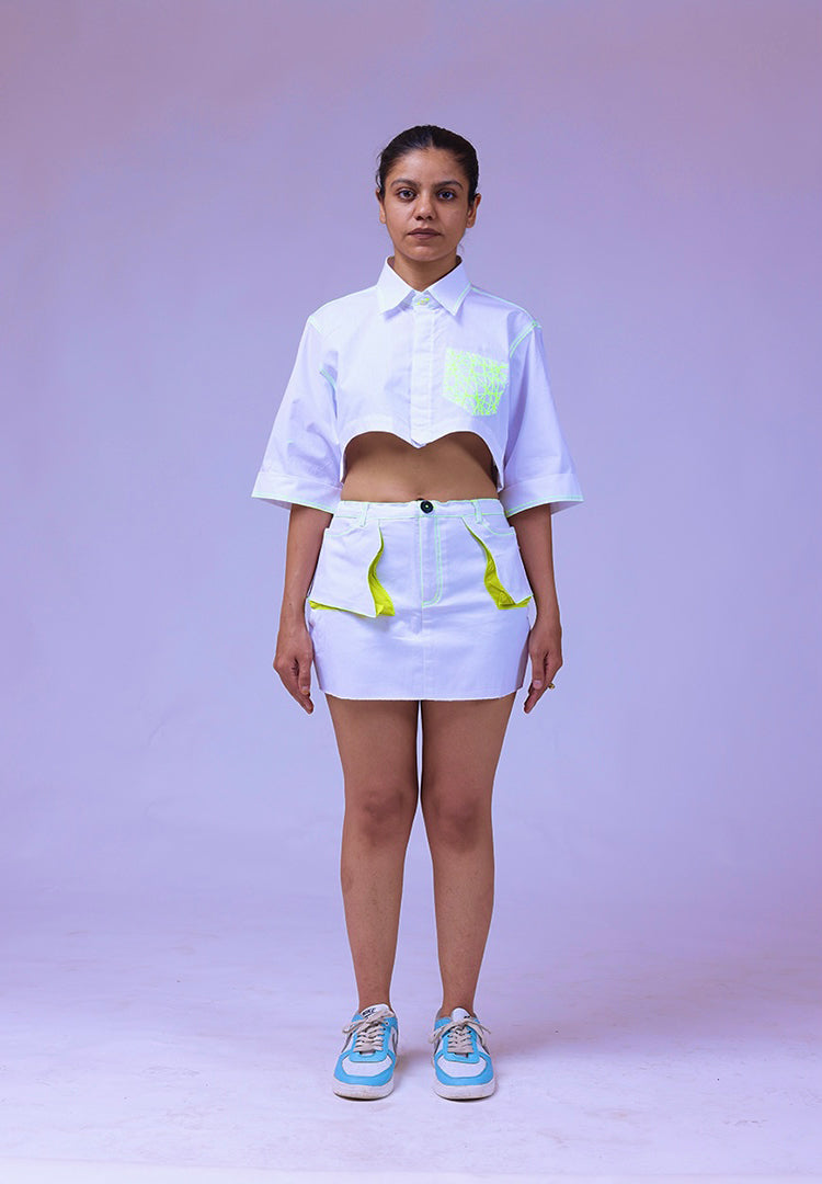 This skirt is cut from white denim fabric. It has asymmetric wave shaped pocket with lime hidden detailing. The pocket goes from front till the back. It has lime stitch detailing all over.