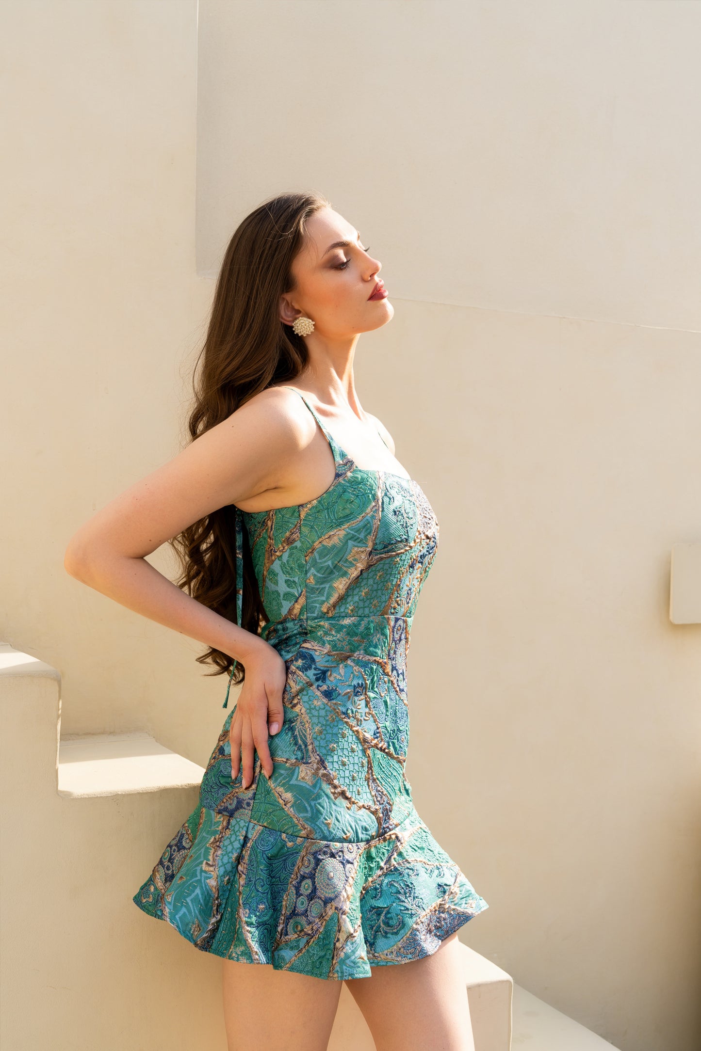 Jacquard dress with flaring at the bottom. Adjustable straps. Invisible back zip fastening.