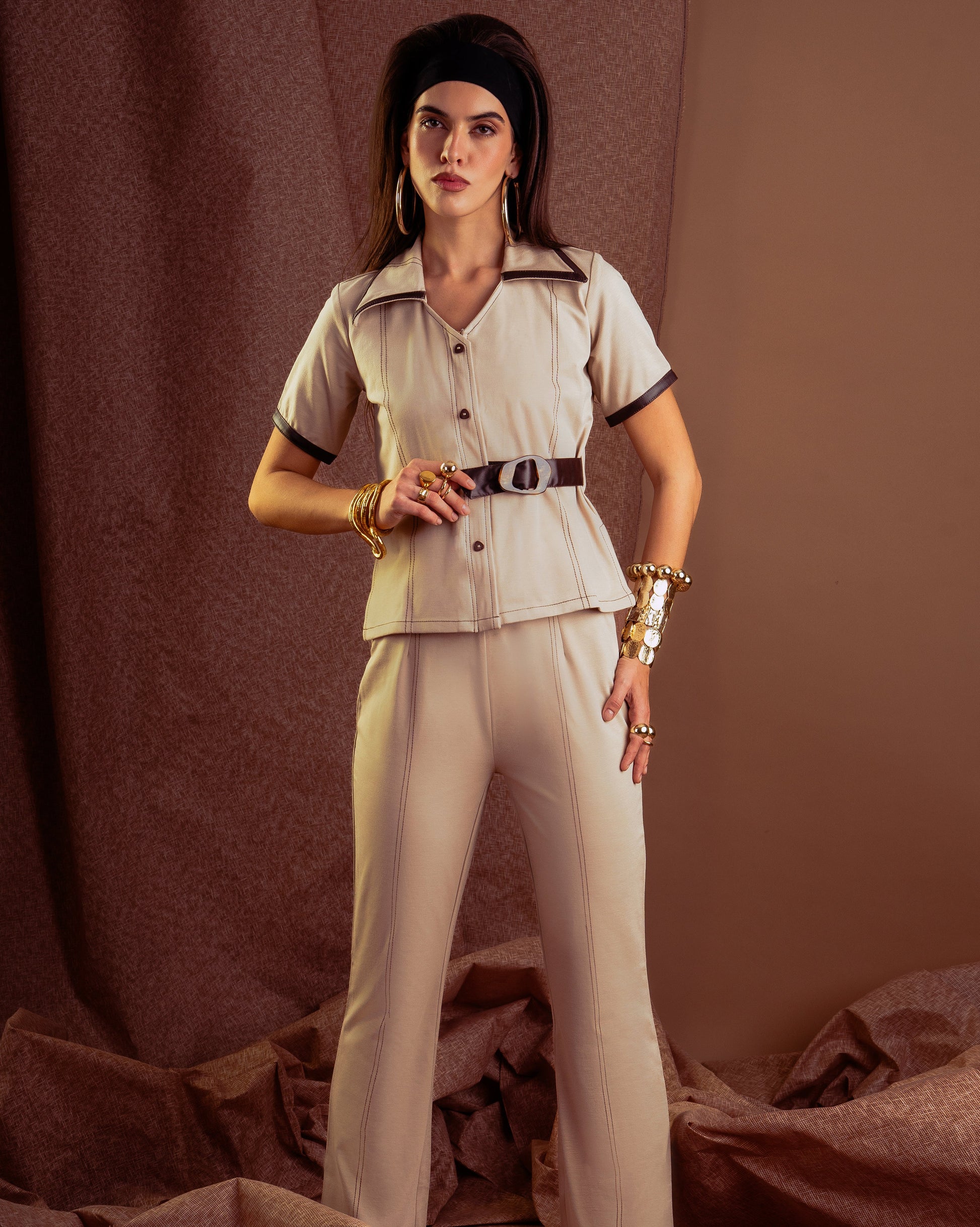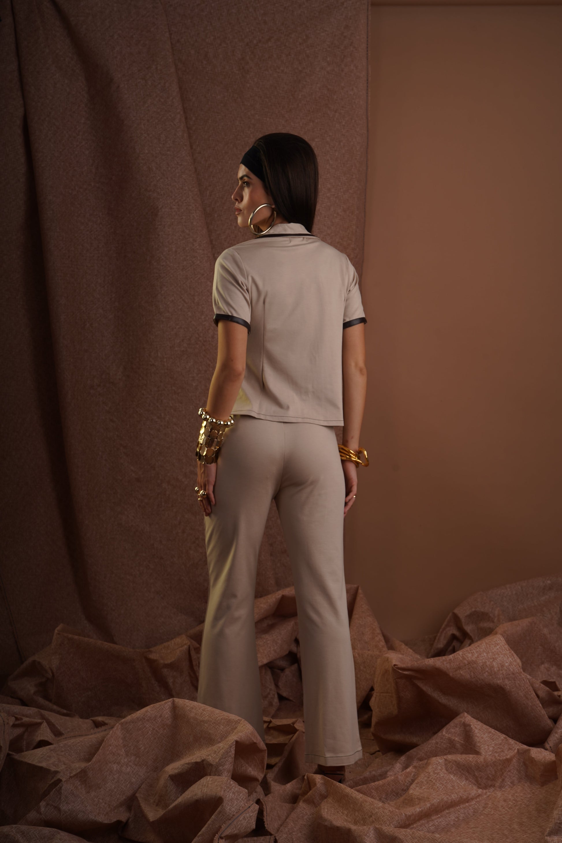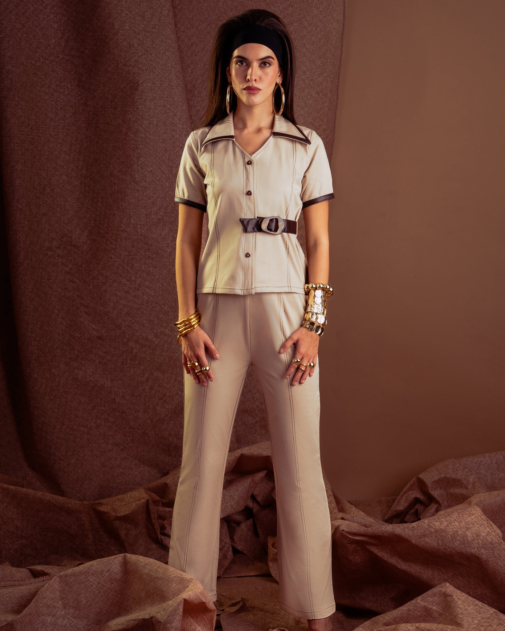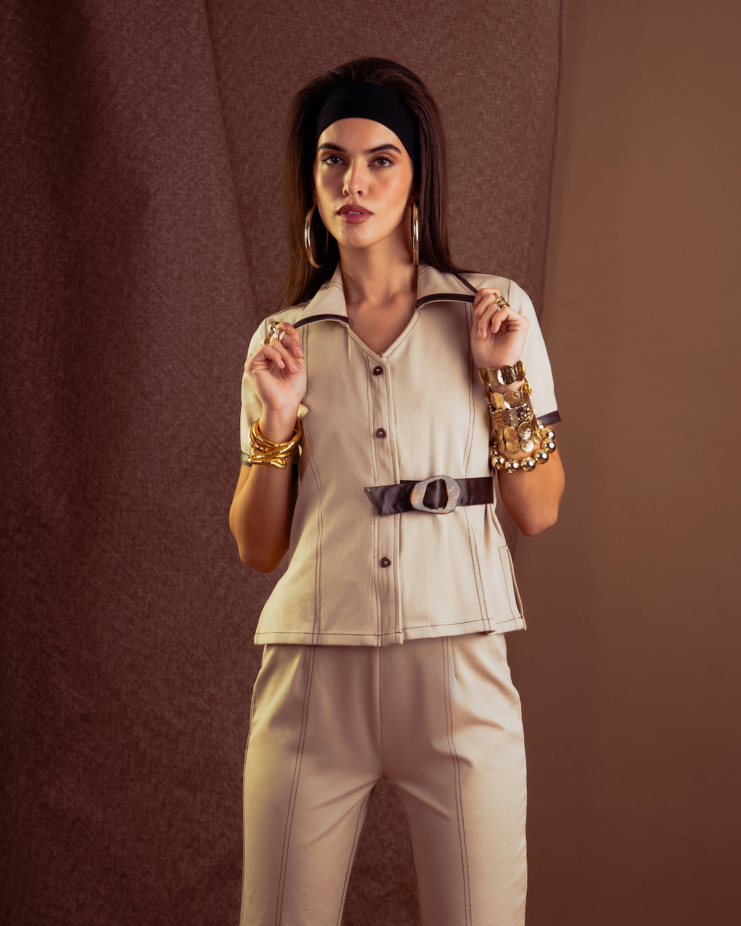 A classic beige coord in a rich cotton fabric is every girl's go-to look. A fitted zipped look with thread detailing on the top & pants with the leather details on collar and added side belt too give fab look. The elasticated at back in pants with a flare cut make it perfect for all day comfort.