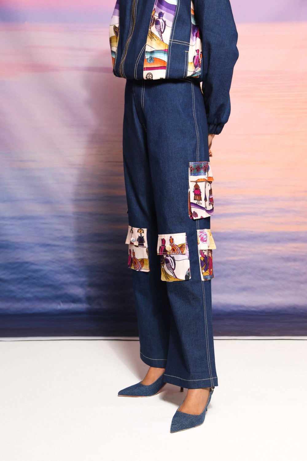 - High-waist trousers with patch pockets on the sides and on the leg and false pockets with flaps on the back.