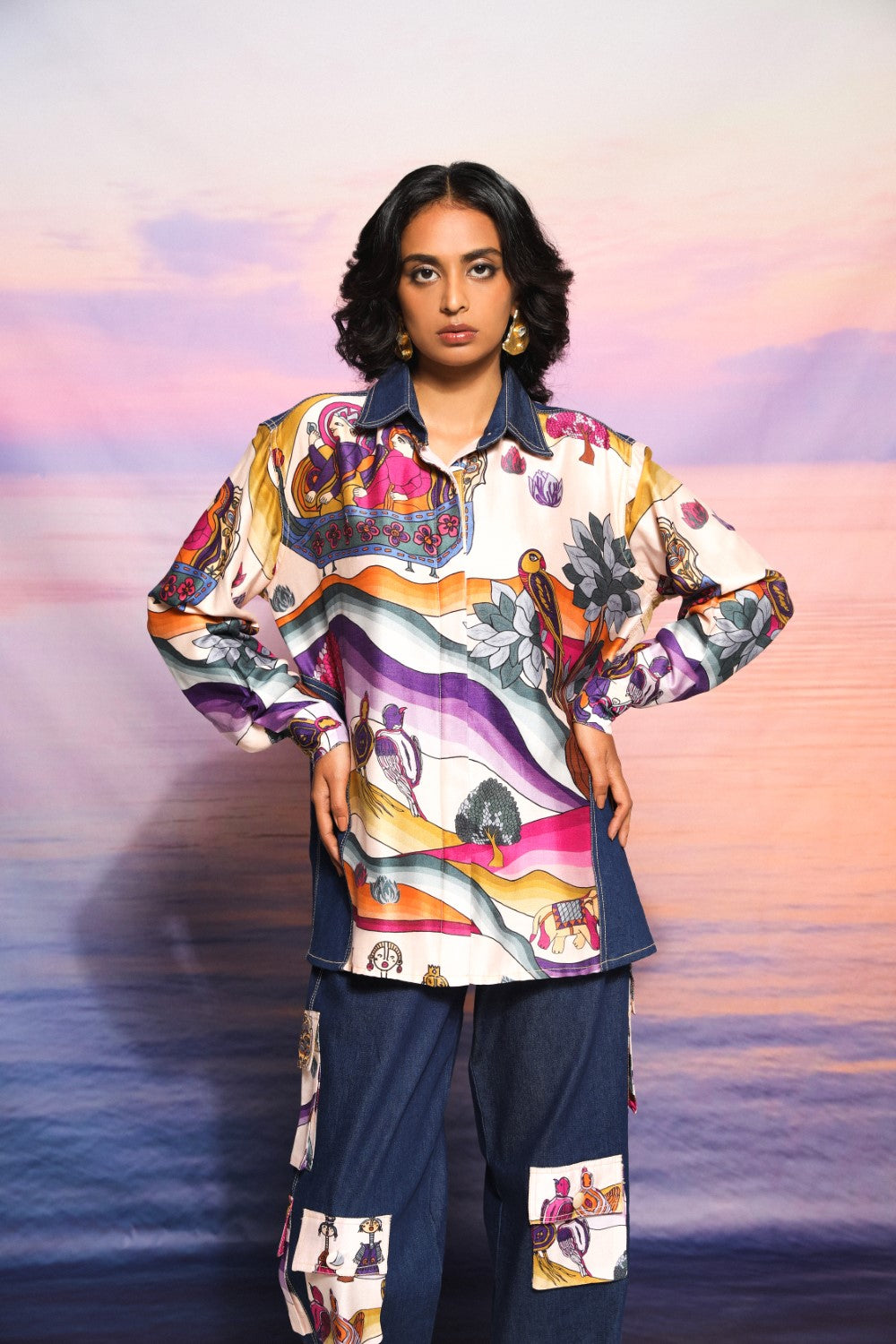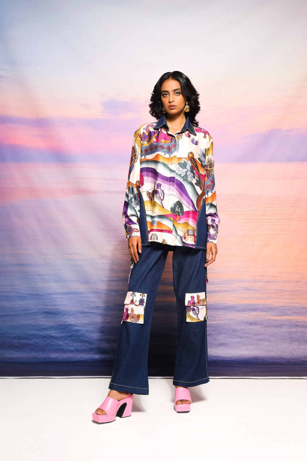 - Collared shirt with long sleeves. Denim panels on the sides.