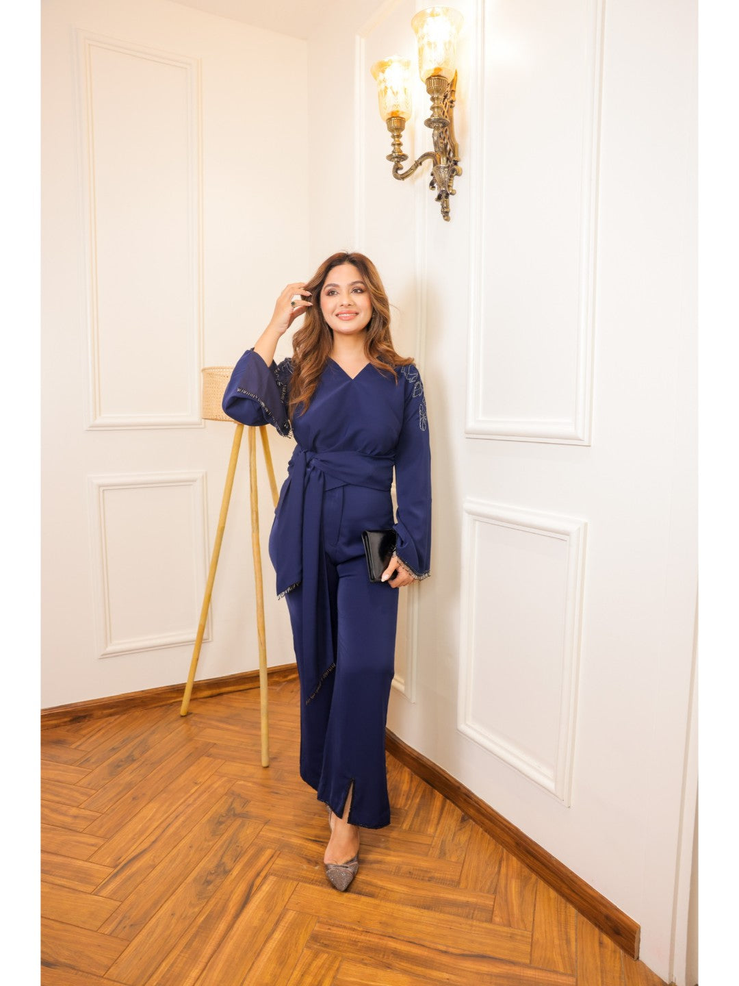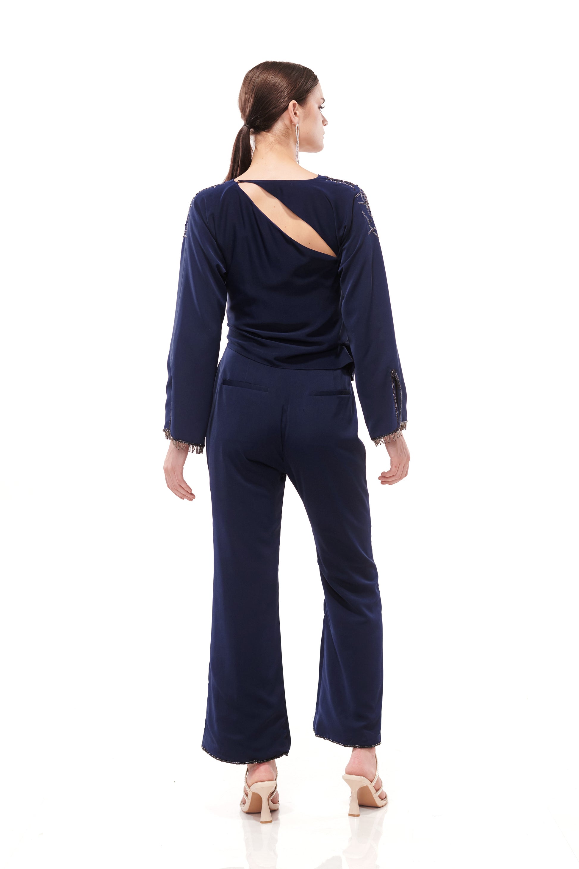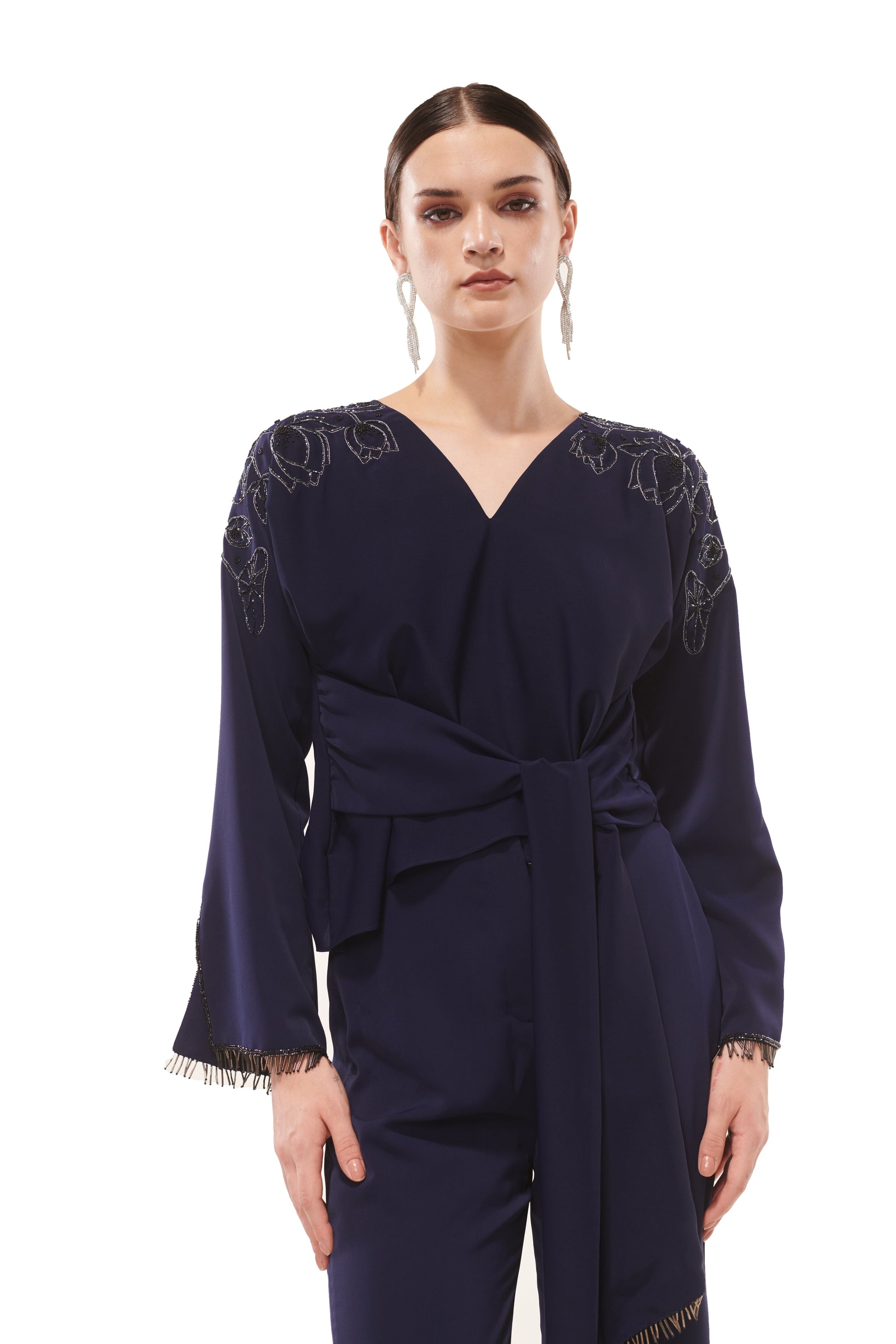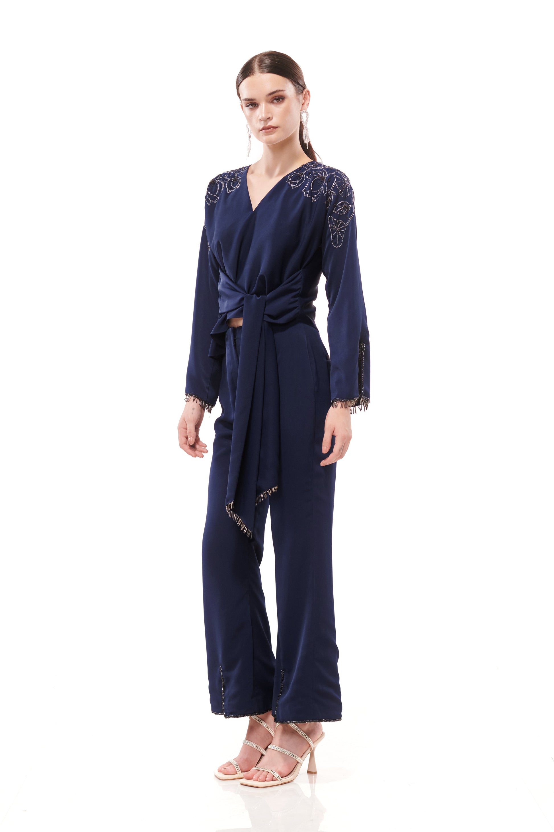 Drawing inspiration from traditional Thai outfits, this V-neck top features hand-beaded lotuses on the shoulder, with each petal meticulously hand drawn and hand embroidered; paired with our pants with front slits, hand embellished with beadwork along the borders, adding a touch of elegance.