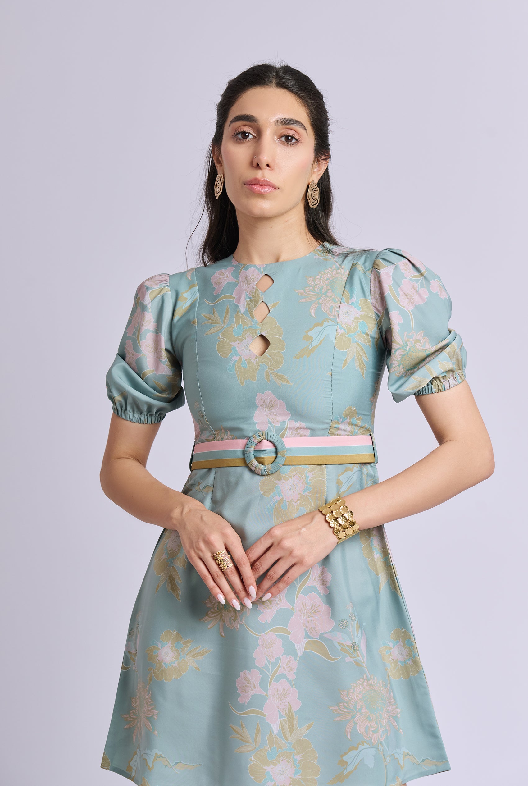 Lilia Blue and Pink Flower Print Short Dress with Belt