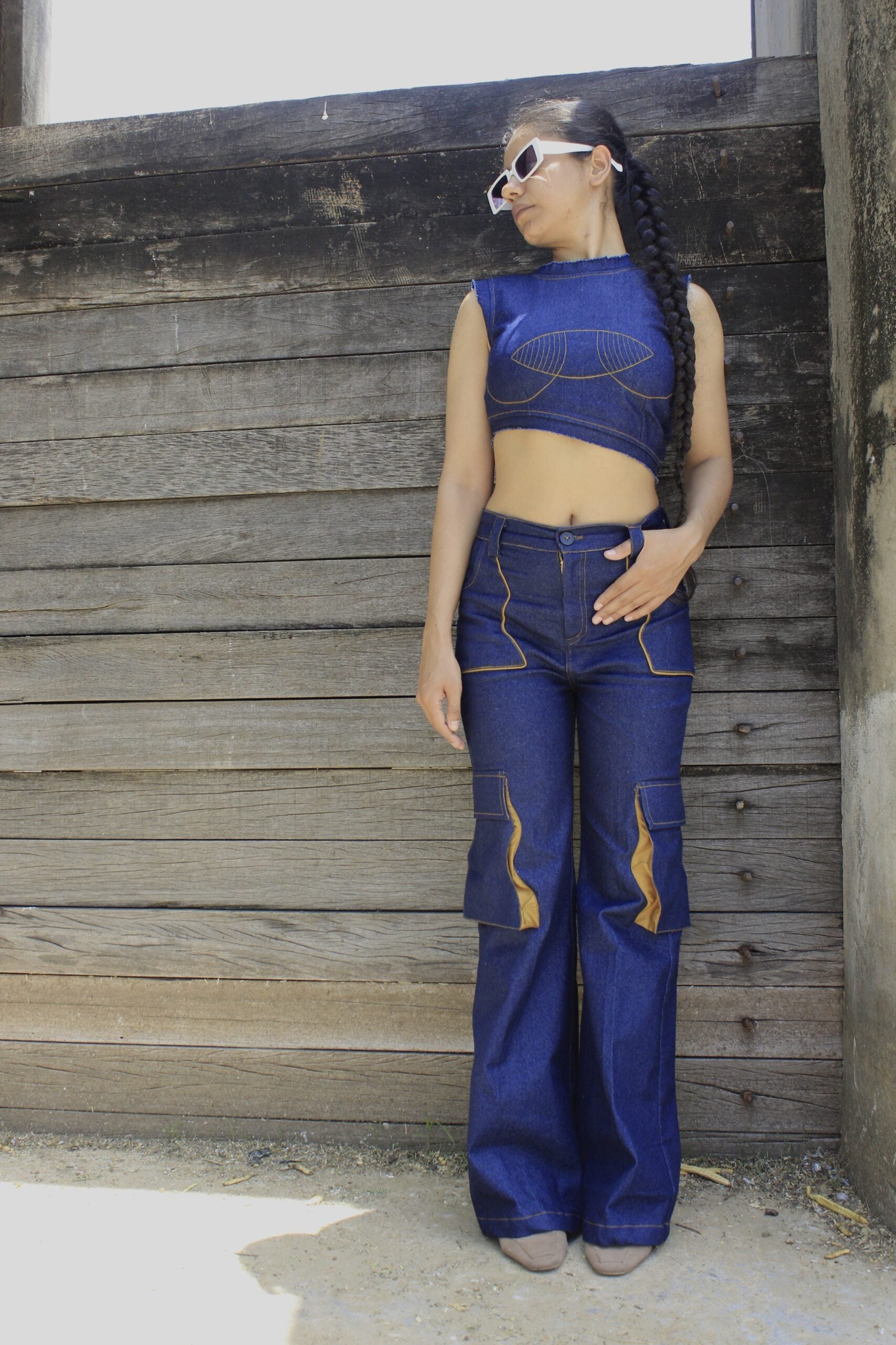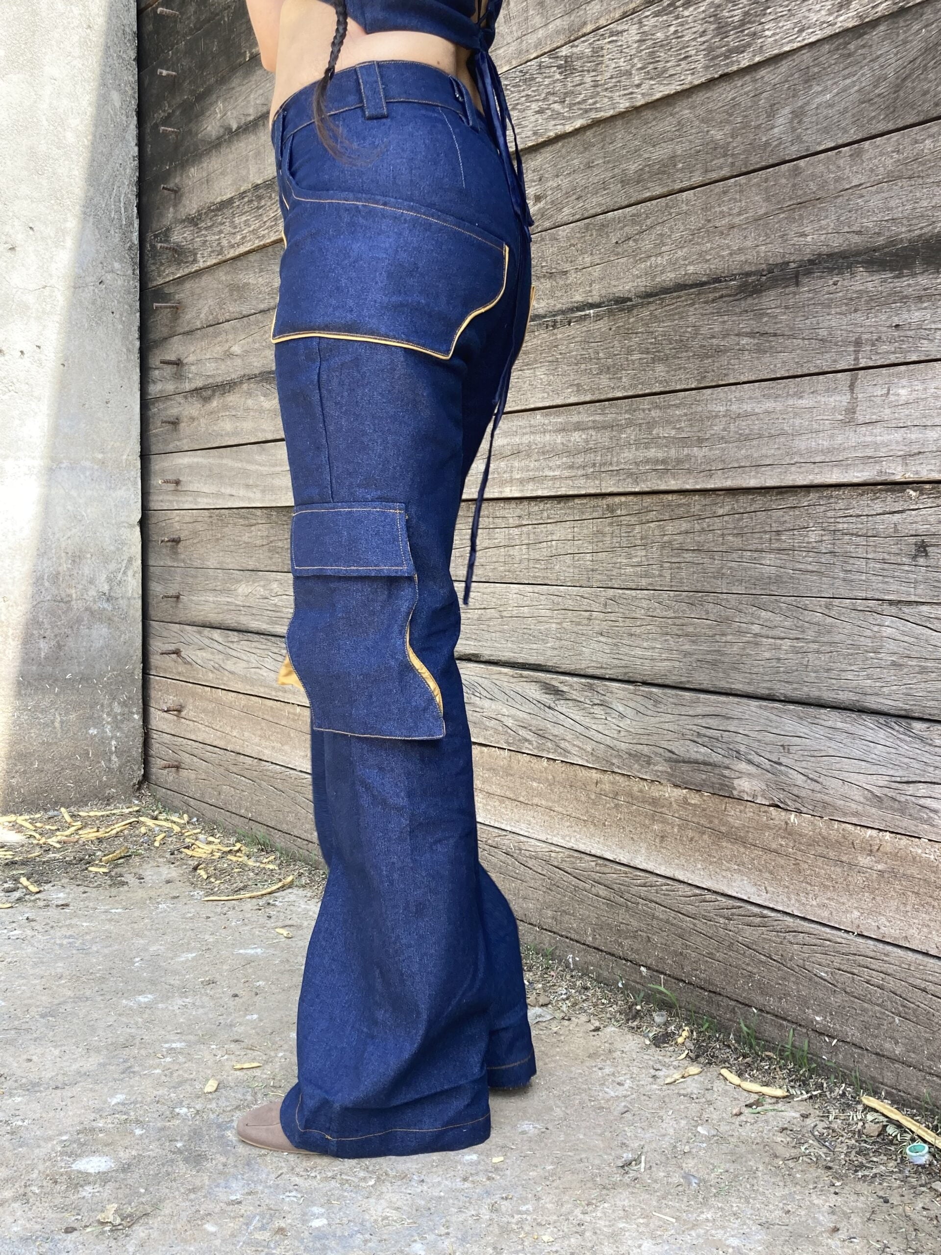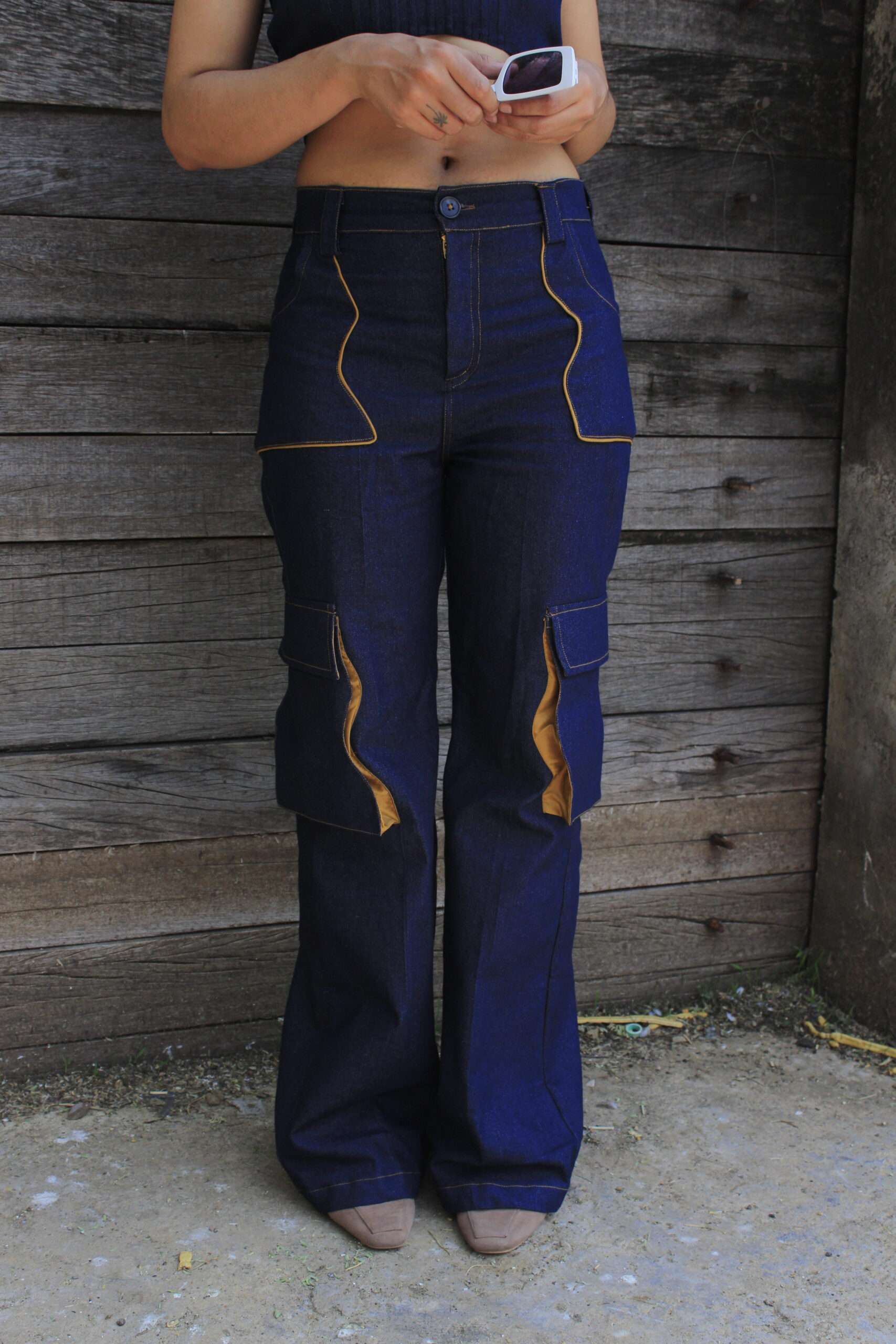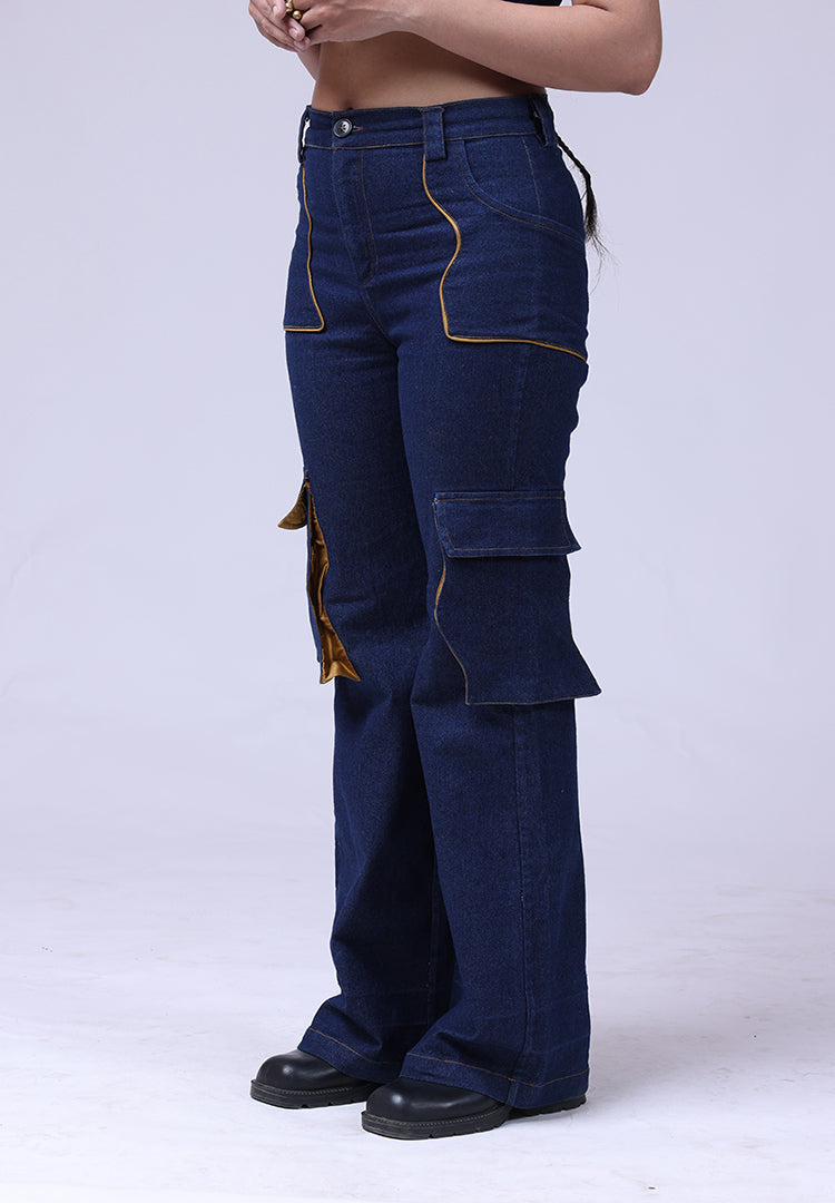 This high waist jeans is cut from navy blue denim fabric. The top 2 statement river pockets with brown piping details, goes all the way from front to the hip area. It has other 2 utility pockets with river shaped detailing.