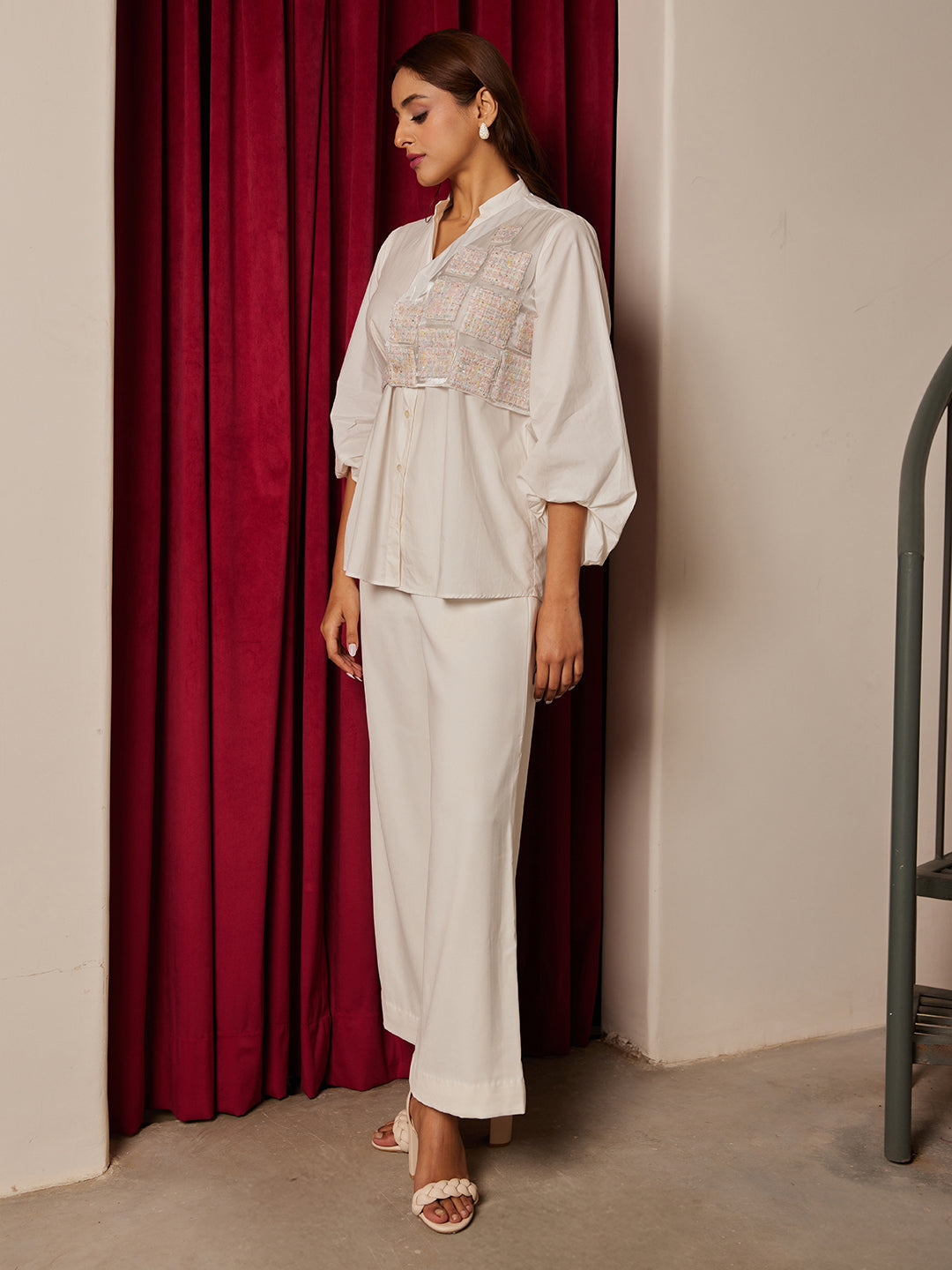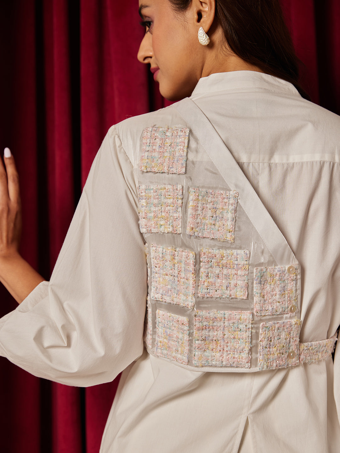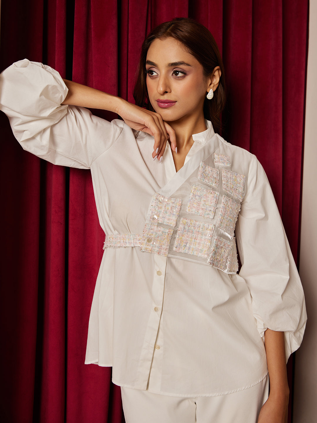 Elevate your wardrobe with our mandarin collar shirt, with voluminous gathered sleeves with elasticated hem and an overlap organza panel adorned with multicolor tweed square patches.