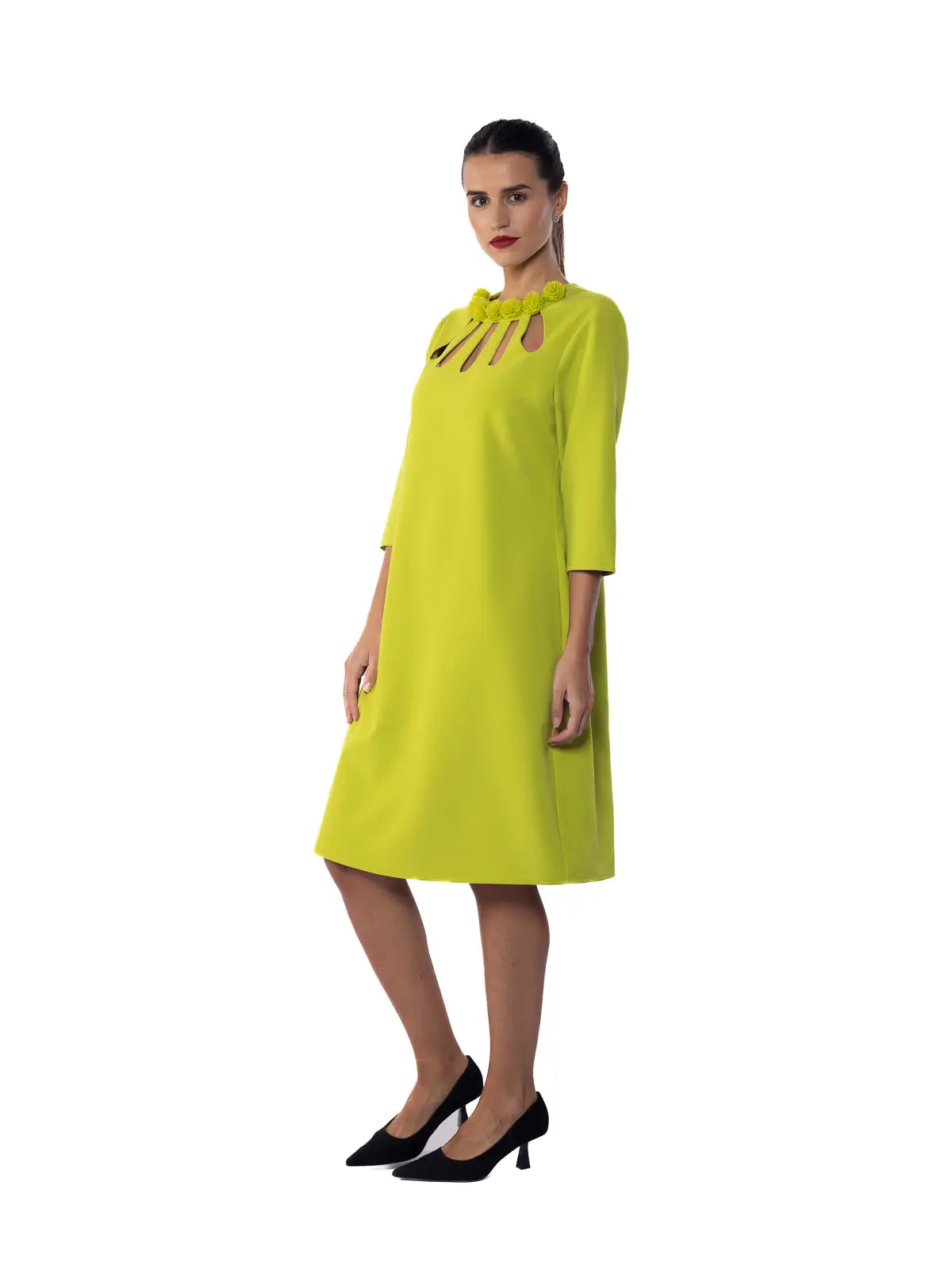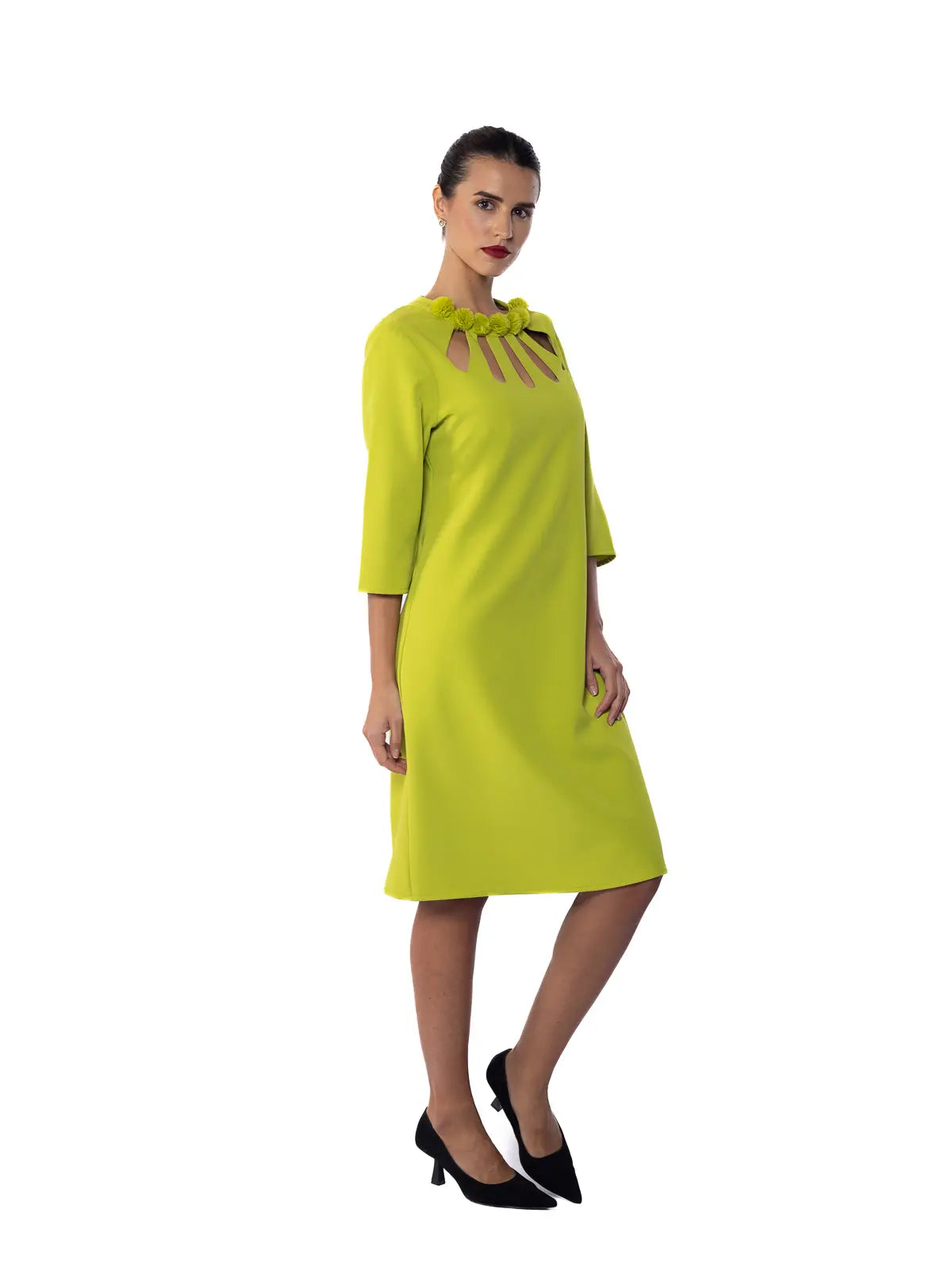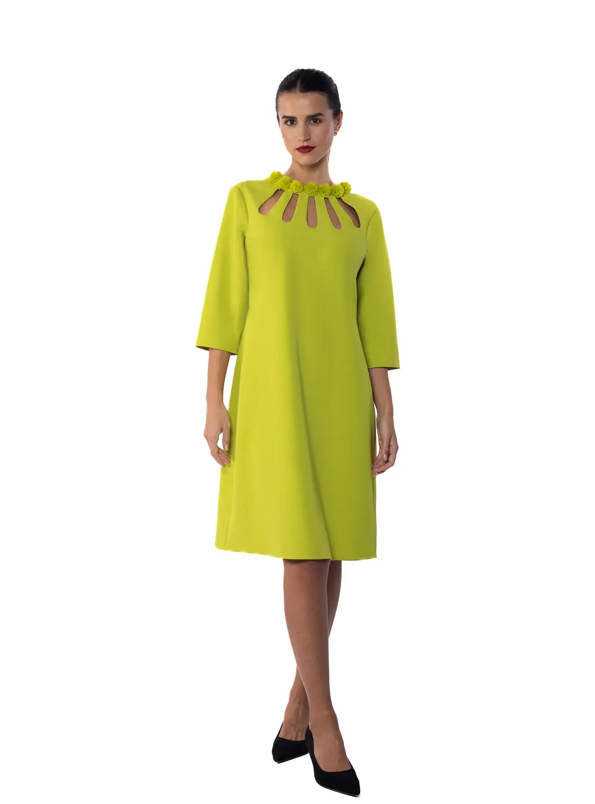 Chic and contemporary, this knee-length shift Lisa dress redefines timeless elegance. The neckline is adorned with delicate organza flower appliqués, creating a soft, feminine contrast against the bold cutout design that graces both the front and back necklines. Thoughtfully placed keyhole cutouts add a touch of drama, while two hook-and-eye closures at the back ensure a secure and polished finish.