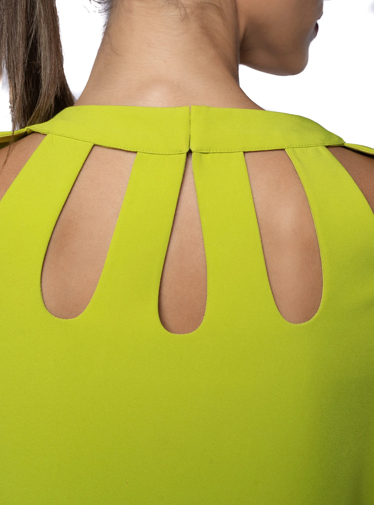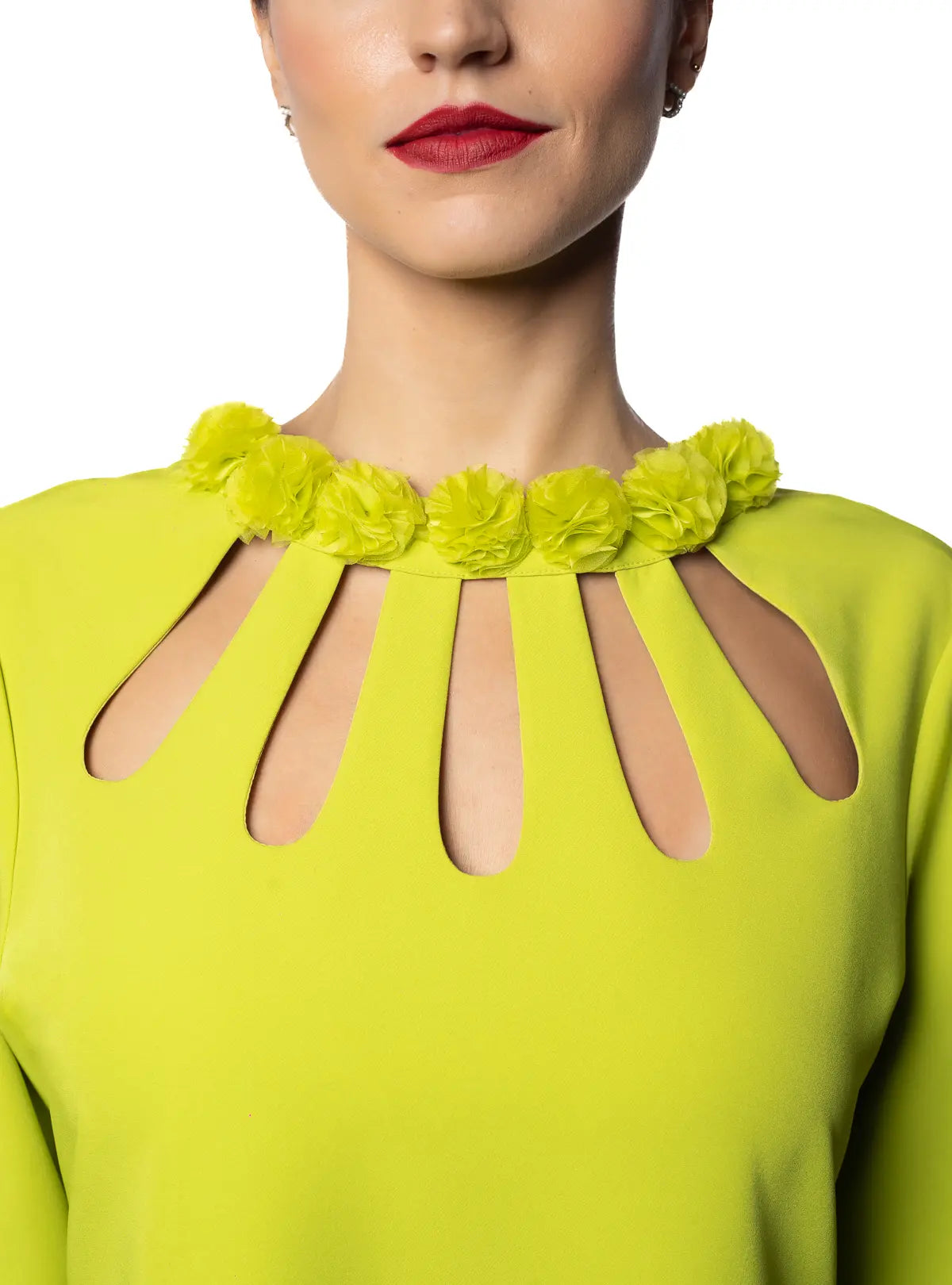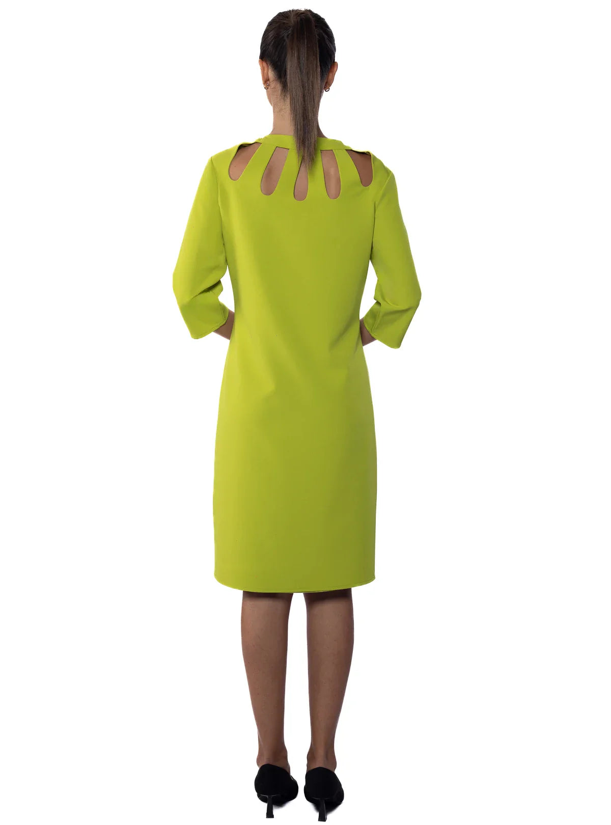 Chic and contemporary, this knee-length shift Lisa dress redefines timeless elegance. The neckline is adorned with delicate organza flower appliqués, creating a soft, feminine contrast against the bold cutout design that graces both the front and back necklines. Thoughtfully placed keyhole cutouts add a touch of drama, while two hook-and-eye closures at the back ensure a secure and polished finish.