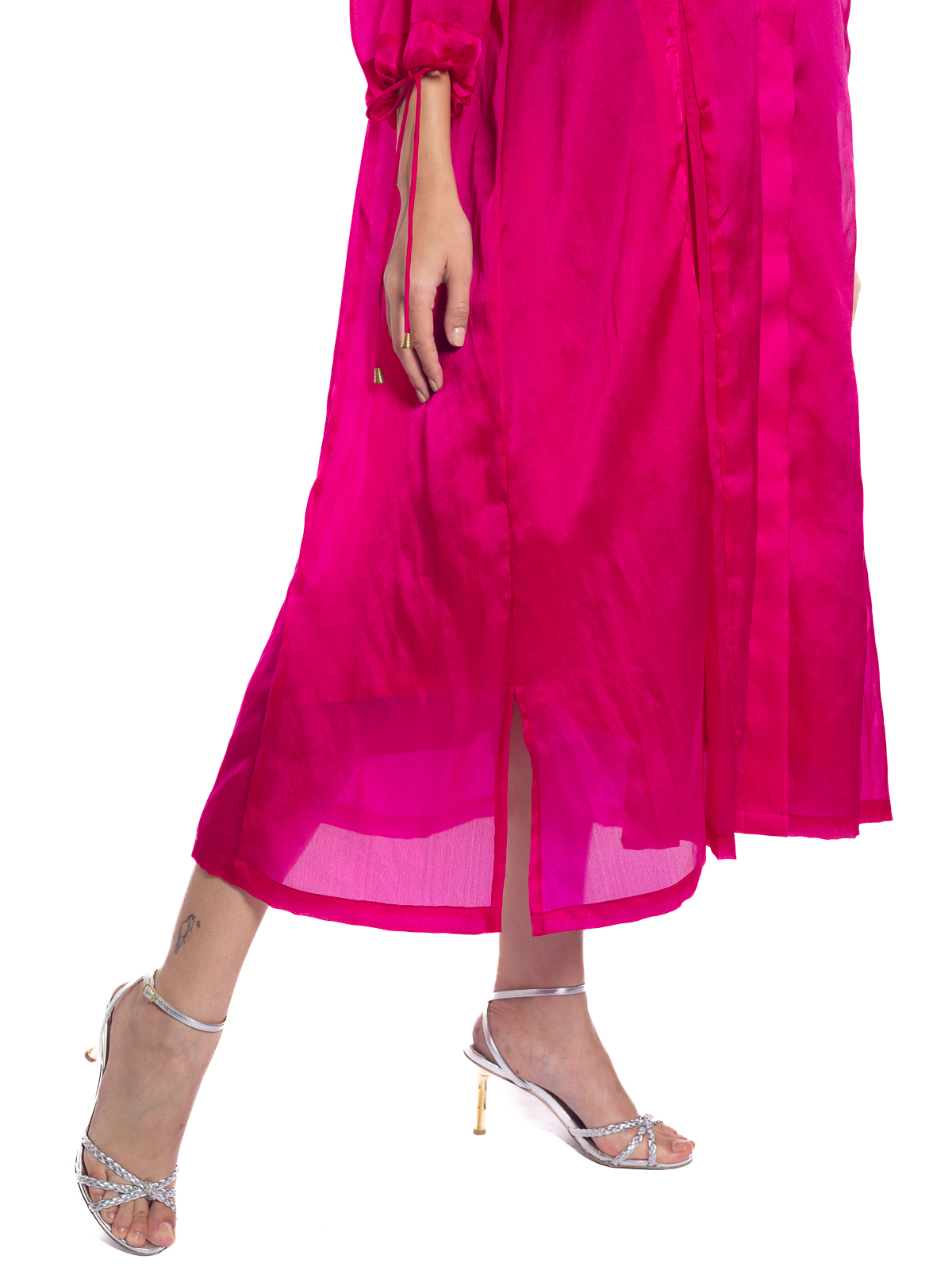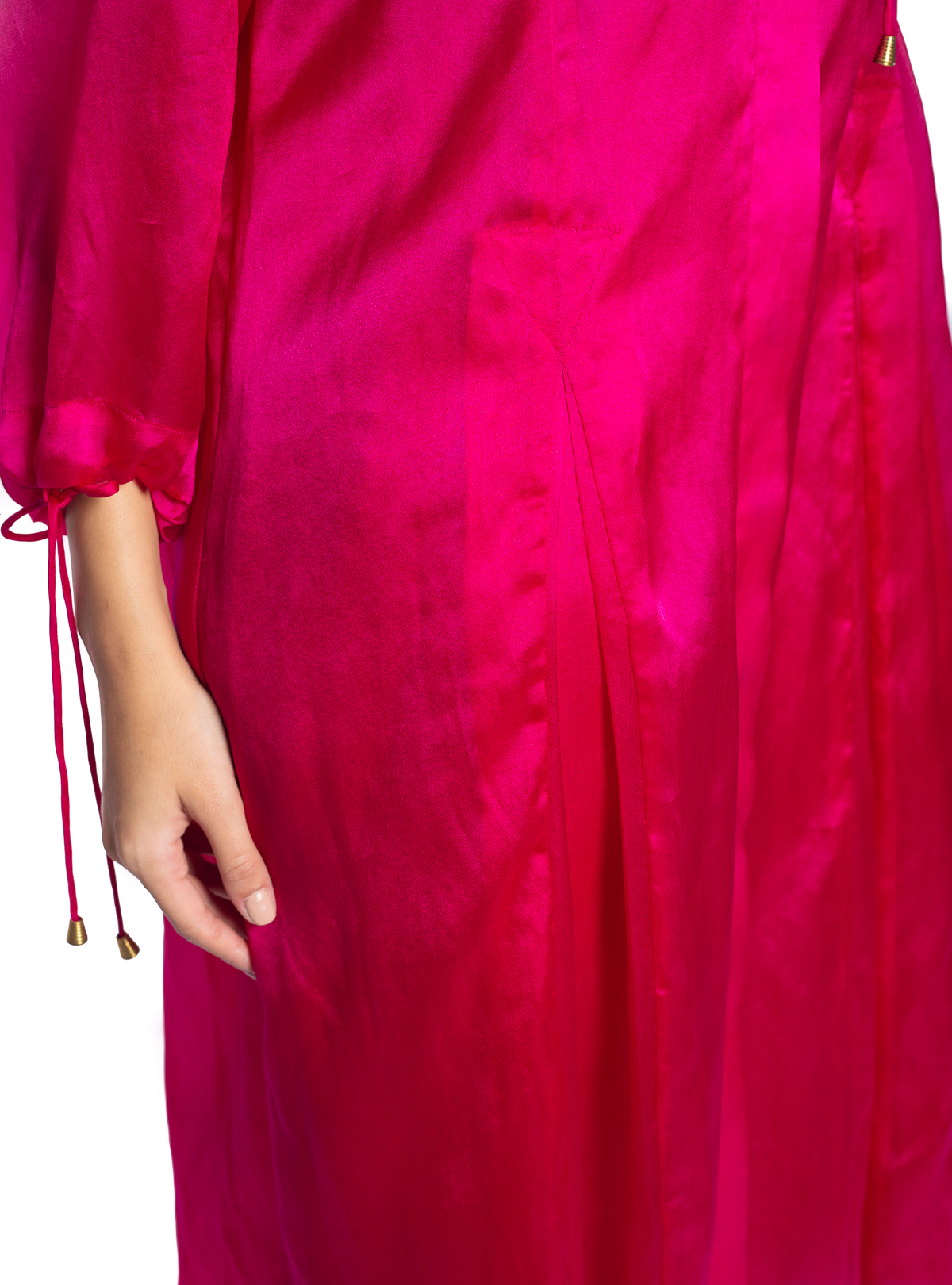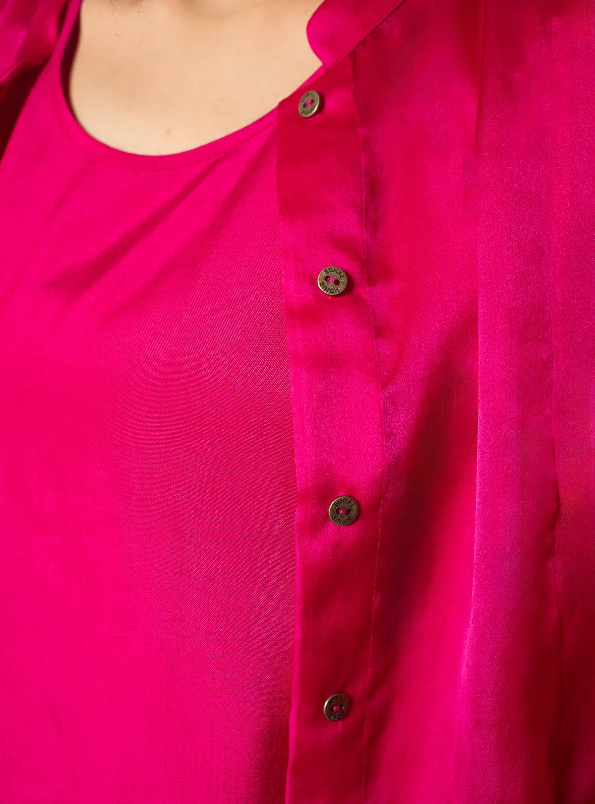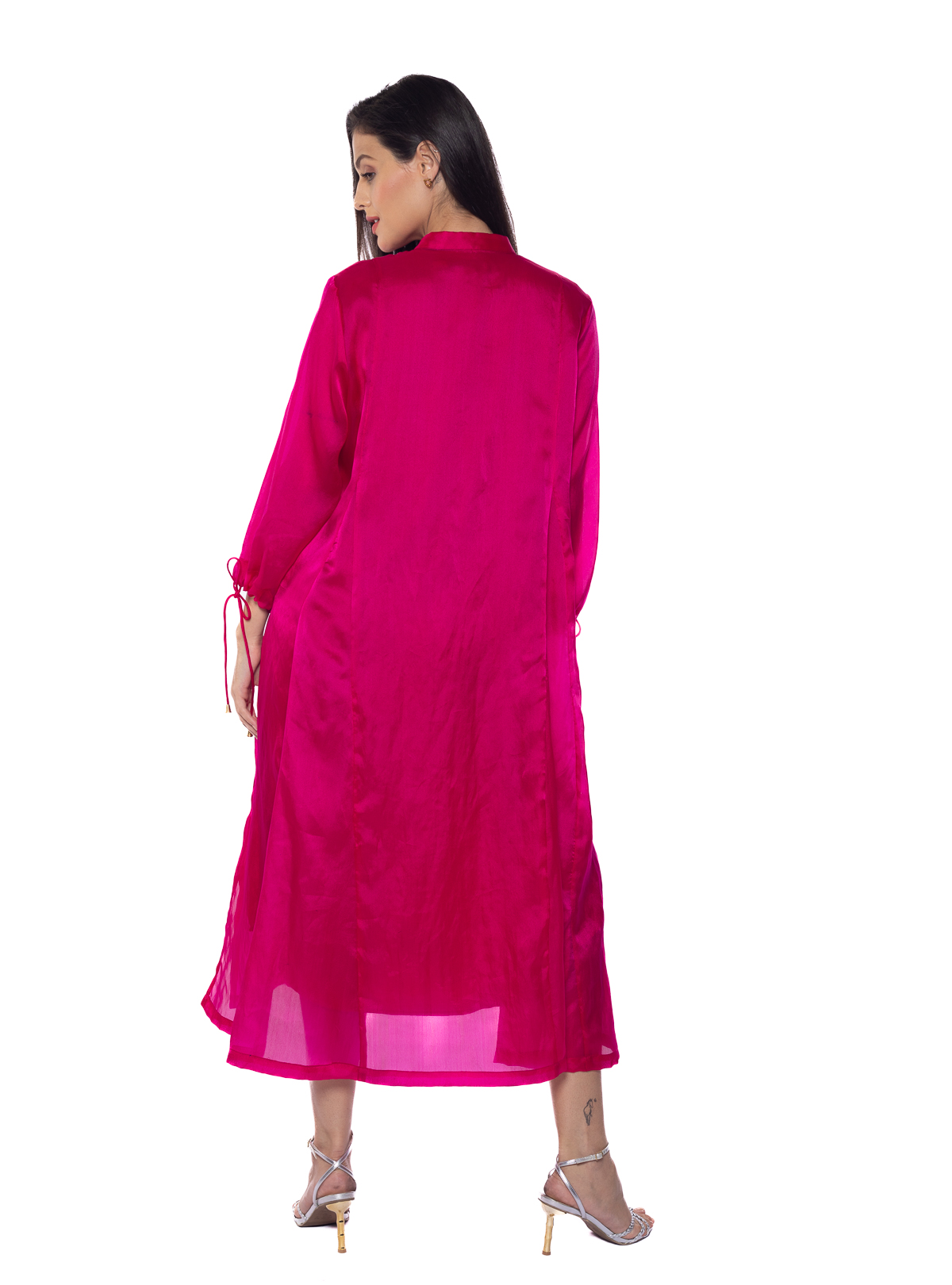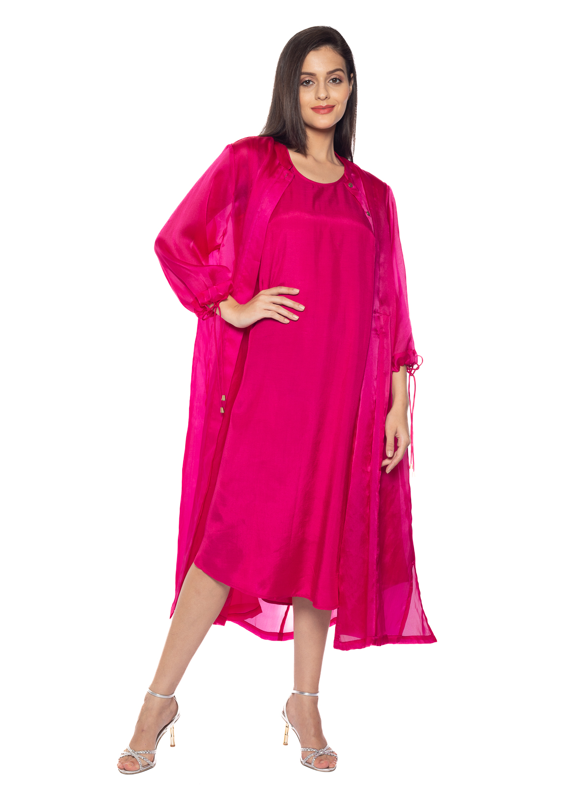 Embrace the allure of contemporary grace with this stunning two-piece dress set in radiant fuchsia. The ensemble features a luxurious sleeveless inner dress crafted from smooth, flowy chanton fabric, designed to drape beautifully and move with effortless elegance.