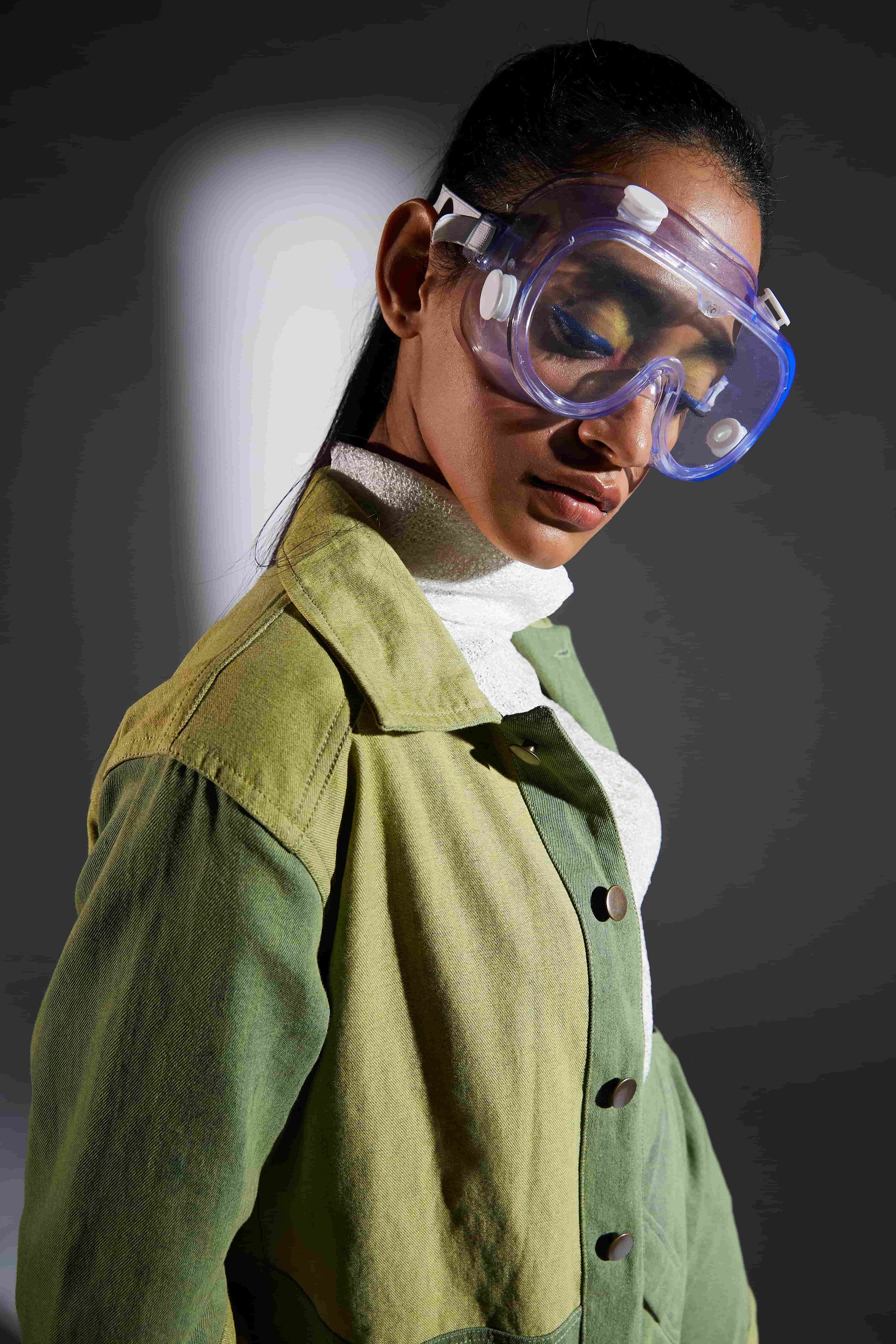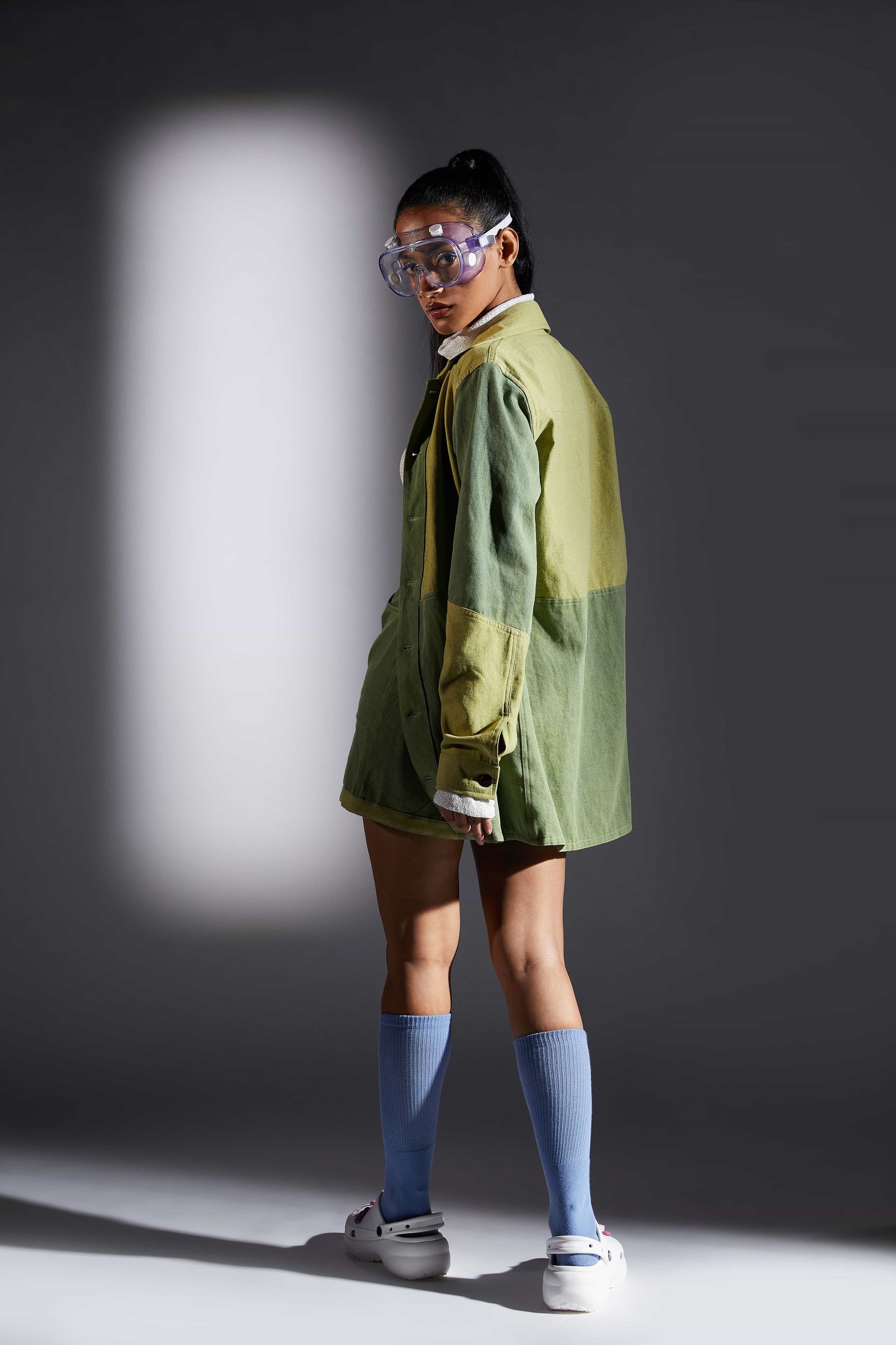 Green duo long denim jacket with Button-up front detailing. This collection is in collaboration with Muskaan. An NGO for specially abled. 15% of our net profits will be donated for their welfare.