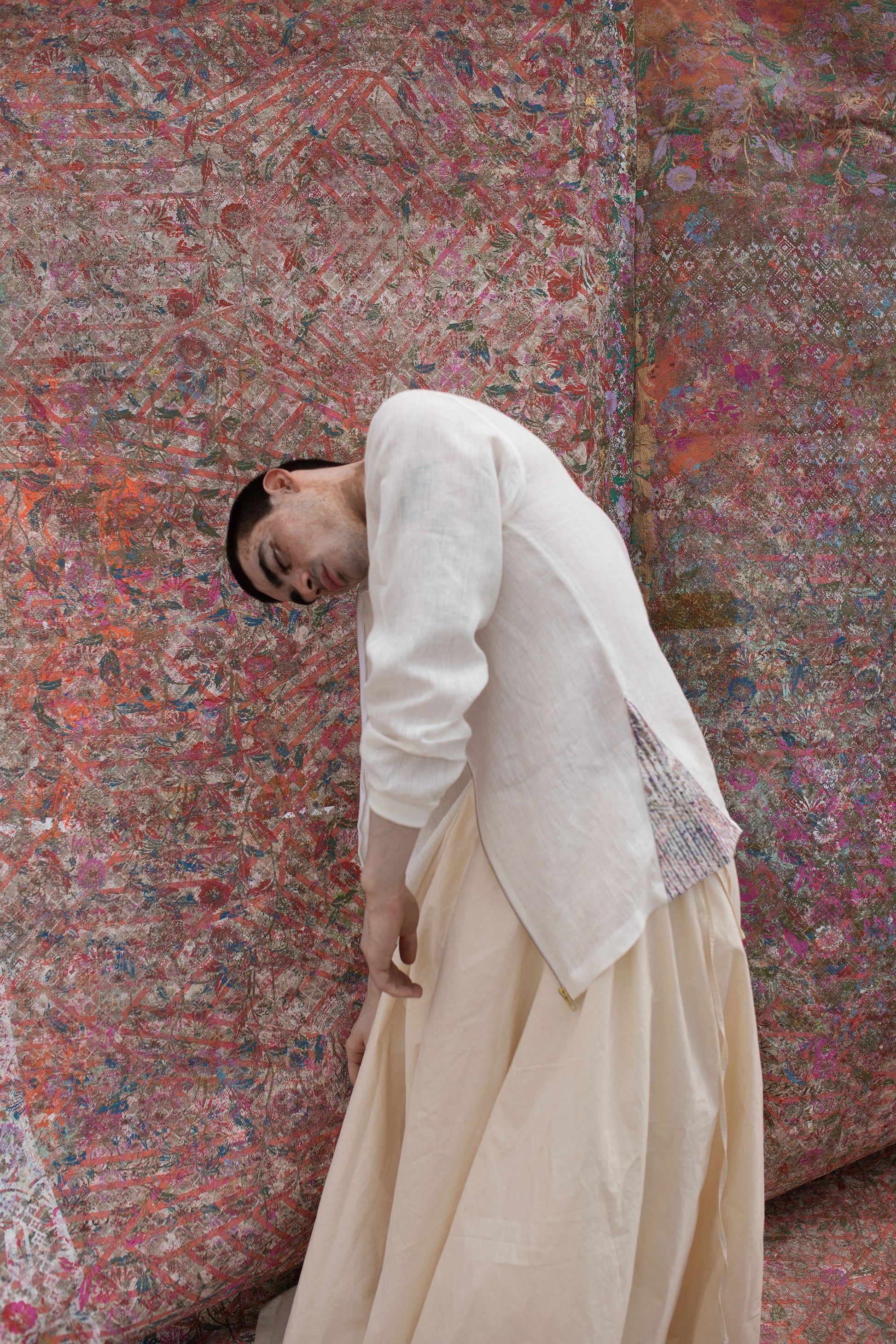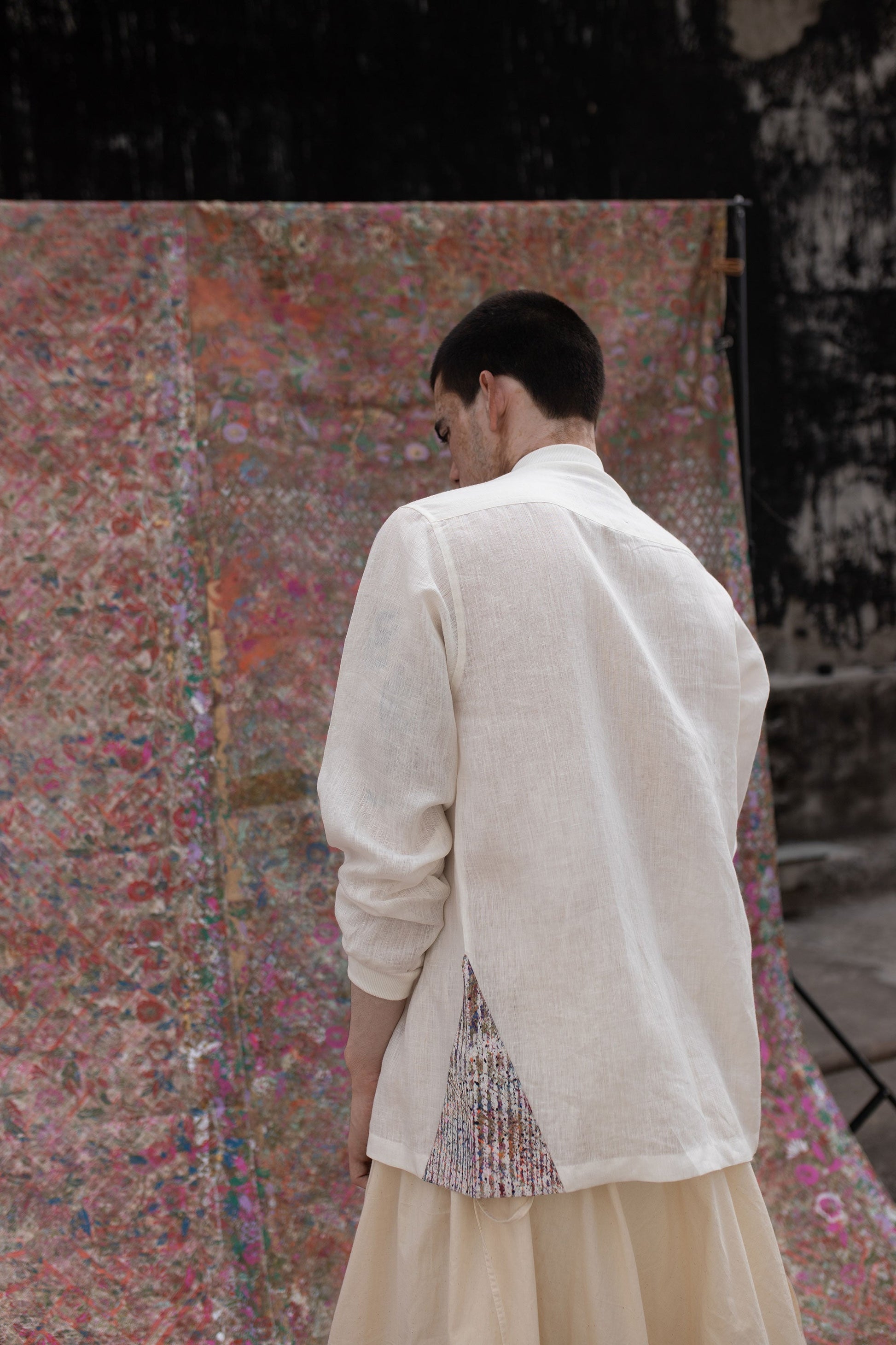 The Patina Collection is created using soft handwoven Bhagalpuri linen. These textiles are highlighted with different geometrical textures and patterns in different colors using recycled hand block print using hand carved traditional wooden blocks from Sanganer. This shirt has a Patina block printed one-of-a-kind fabric side godet detail. Kindly note that this product is a regular fit. Hand Wash/Dry Clean recommended.