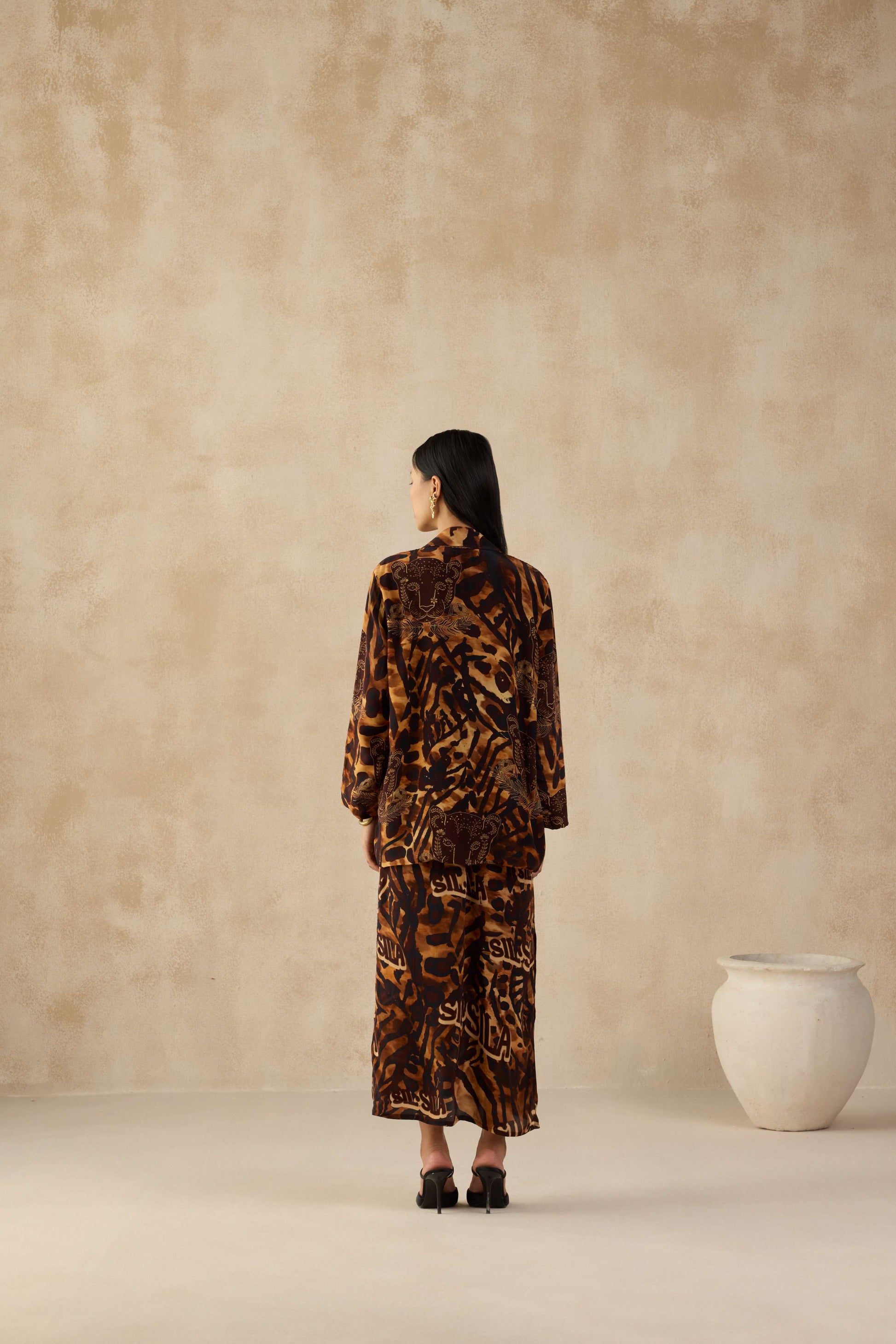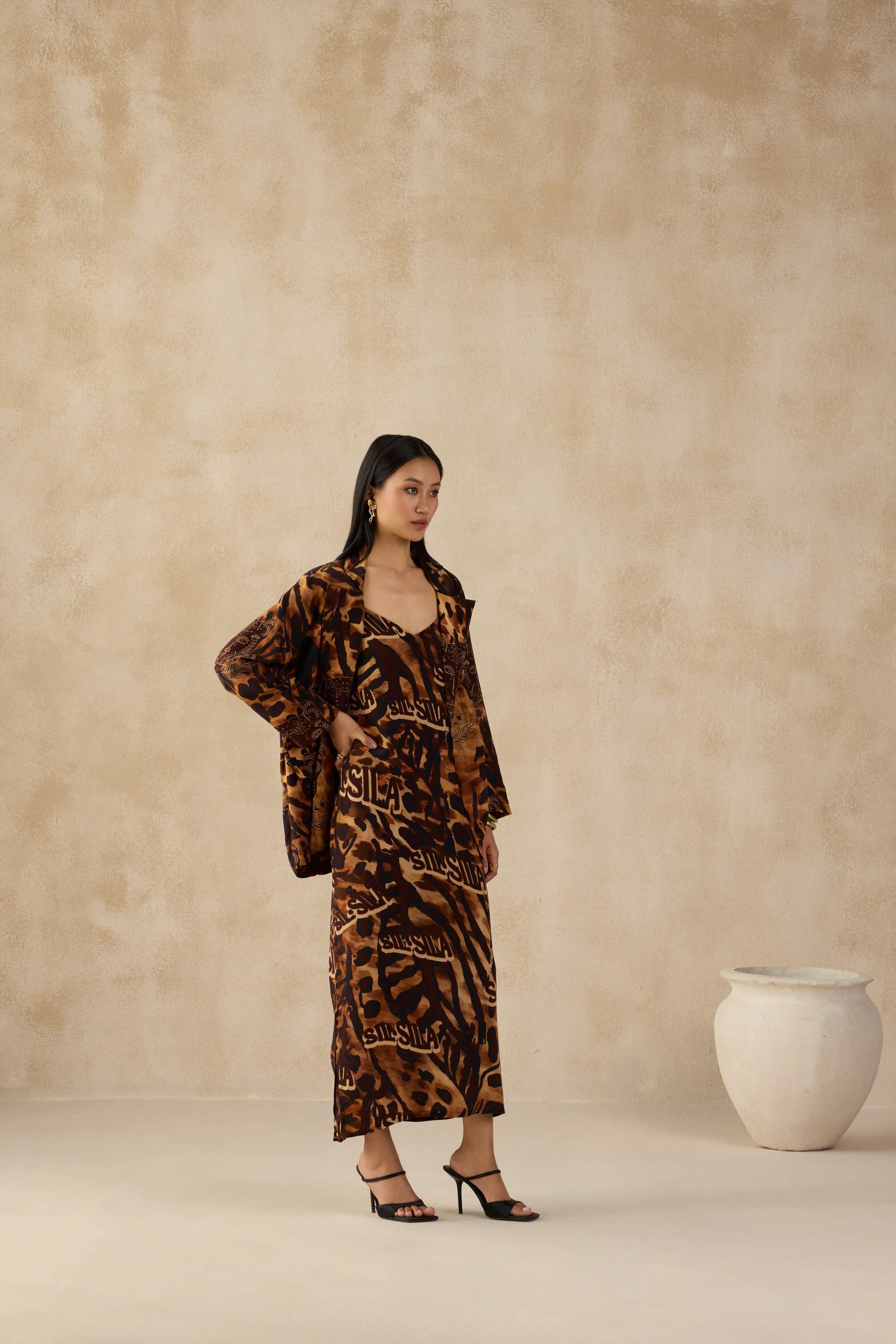 Bold, untamed, and effortlessly striking—the Madagascar Blazer is your ultimate statement piece. Featuring a rich brown and black animal print infused with Sil Sila’s signature typography, this oversized blazer exudes confidence and attitude. The relaxed fit, structured lapels, and fluid drape make it perfect for layering over co-ords, dresses, or casual denim. Whether you’re making a powerful entrance or elevating your everyday wardrobe, the Madagascar Blazer is designed for those who embrace fearless fashion.