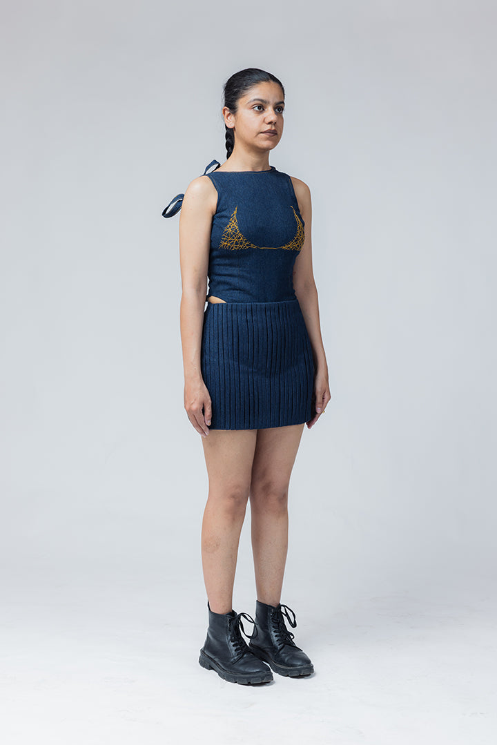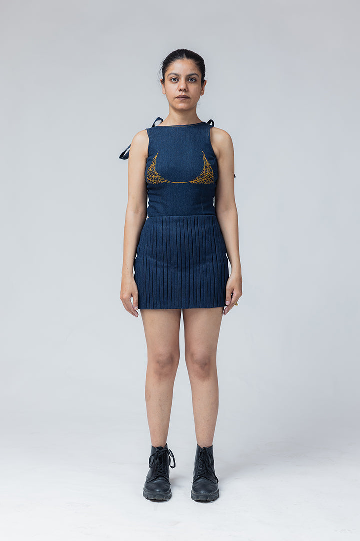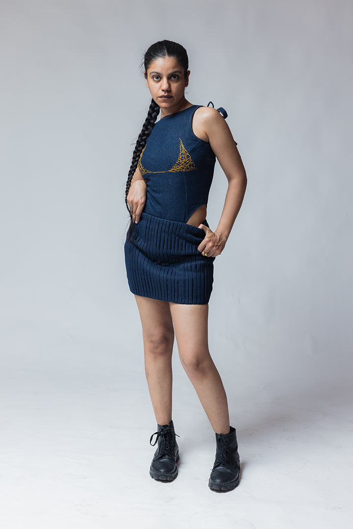 This bodysuit is cut from blue denim fabric. It has bra shaped asymmetric hand embroidery on the bust area. It has string tie-up neck detailing and a zipper back opening.
