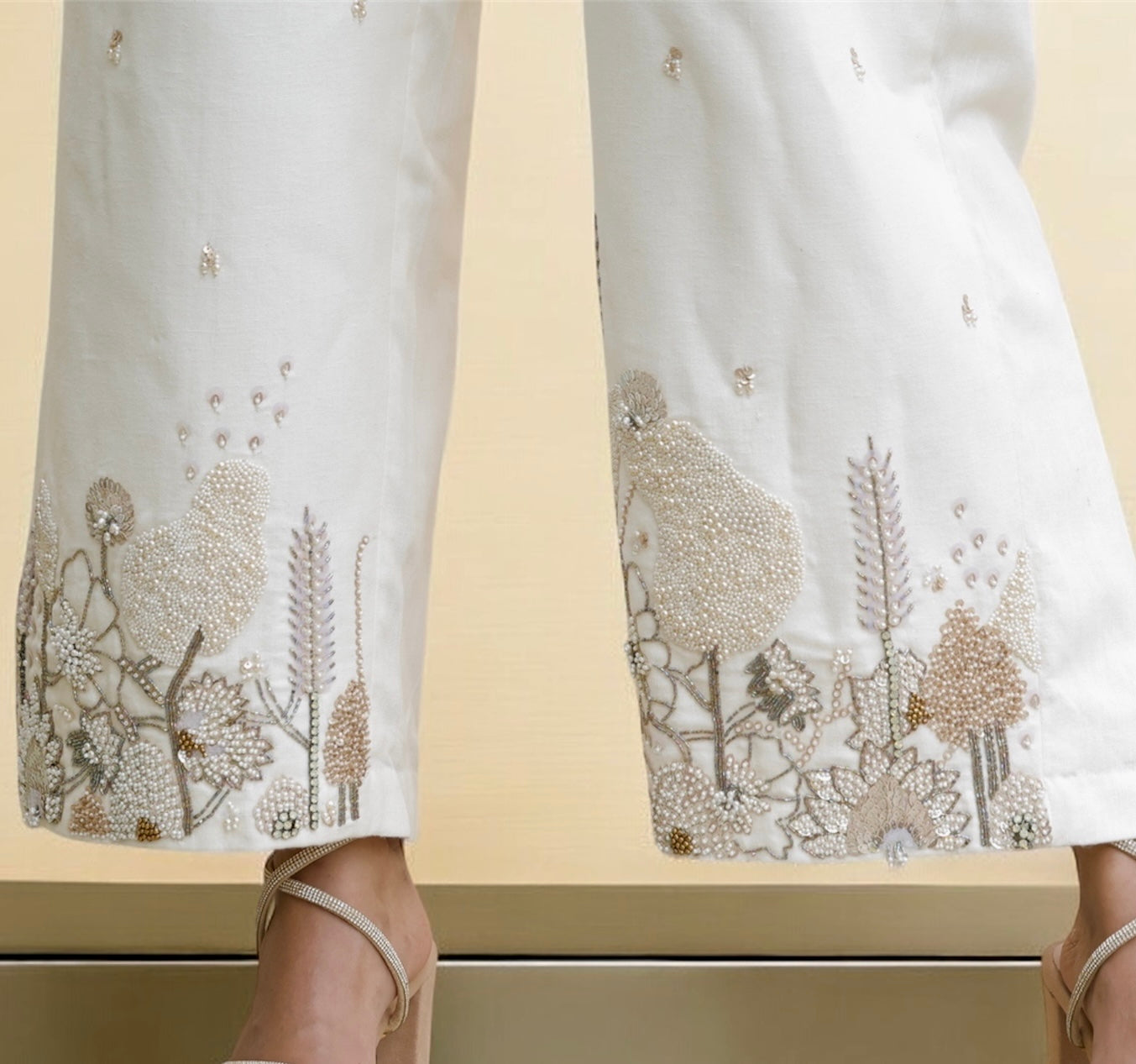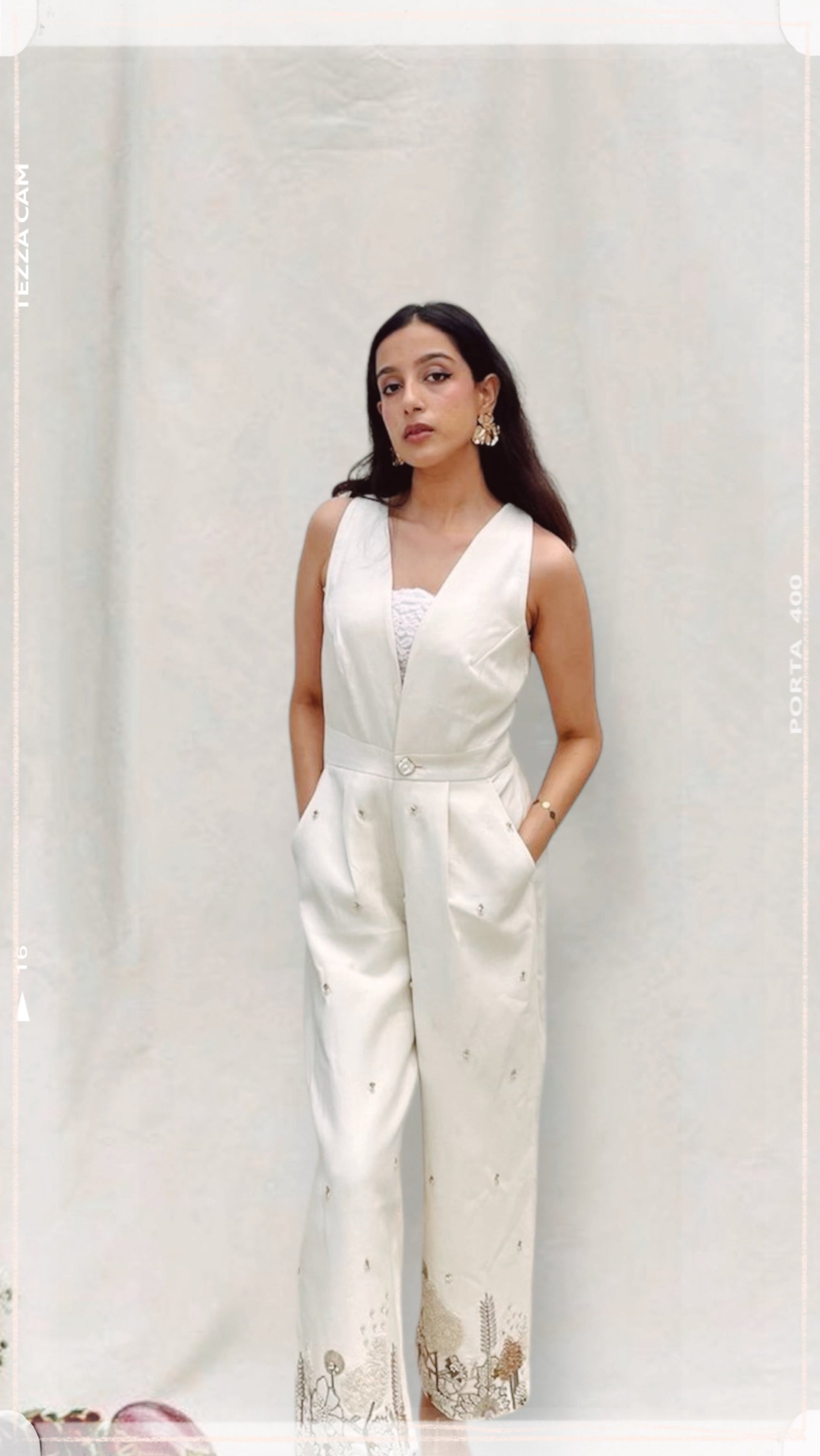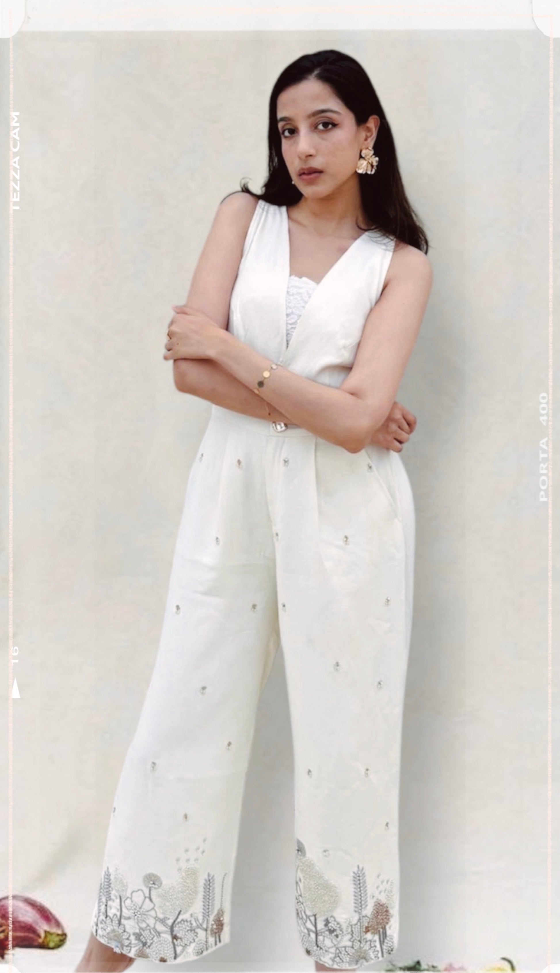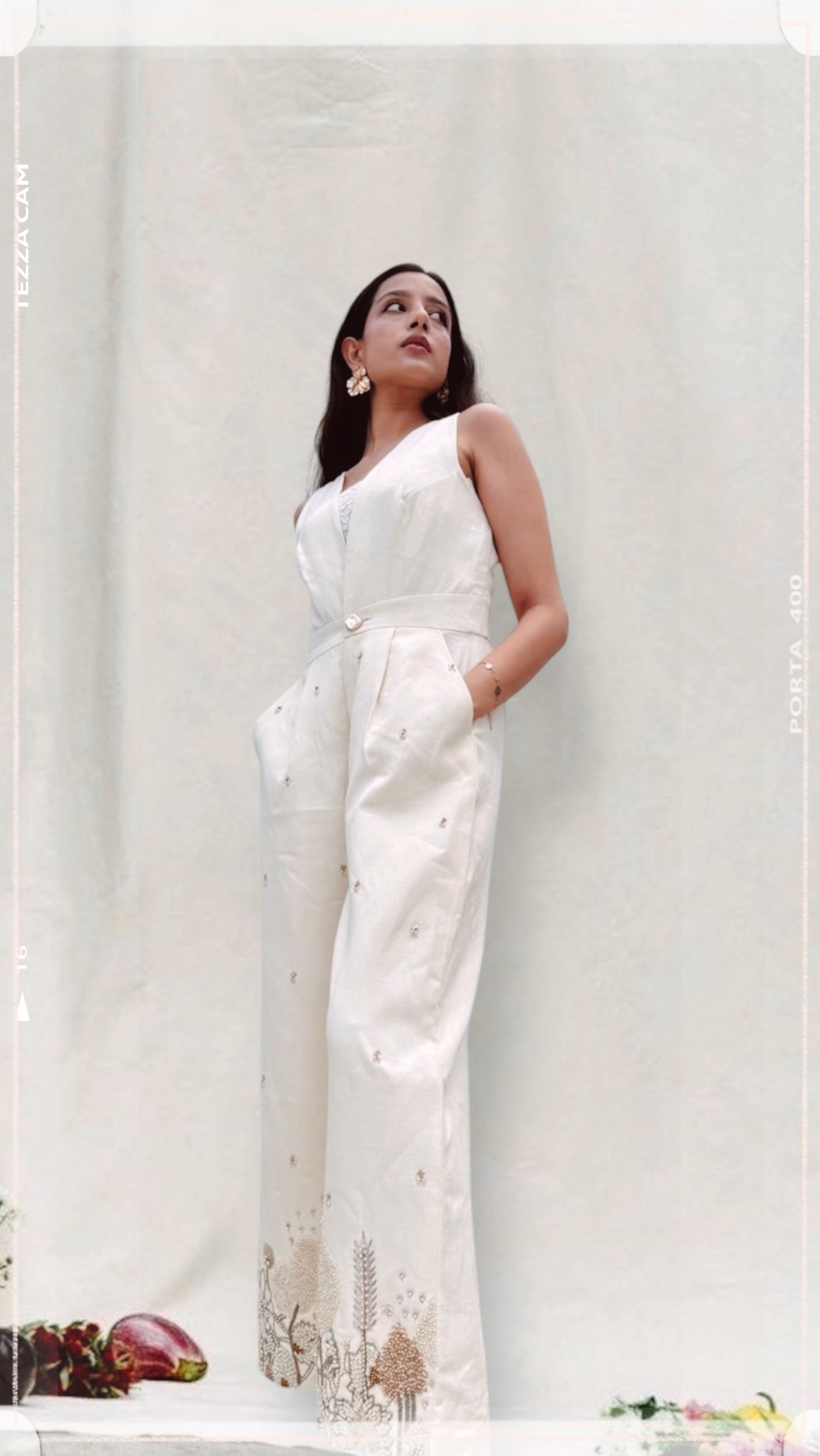 A minimal silhouette with thoughtful detailing — this straight-fit cotton jumpsuit features delicate scattered embroidery, blooming into a whimsical floral design at the hem. Designed with comfort in mind, it includes functional pockets, an adjustable neckline with hook-eye closure, and a flattering sleeveless cut. Soft structure meets poetic charm, making it perfect for daydreamers with an edge.