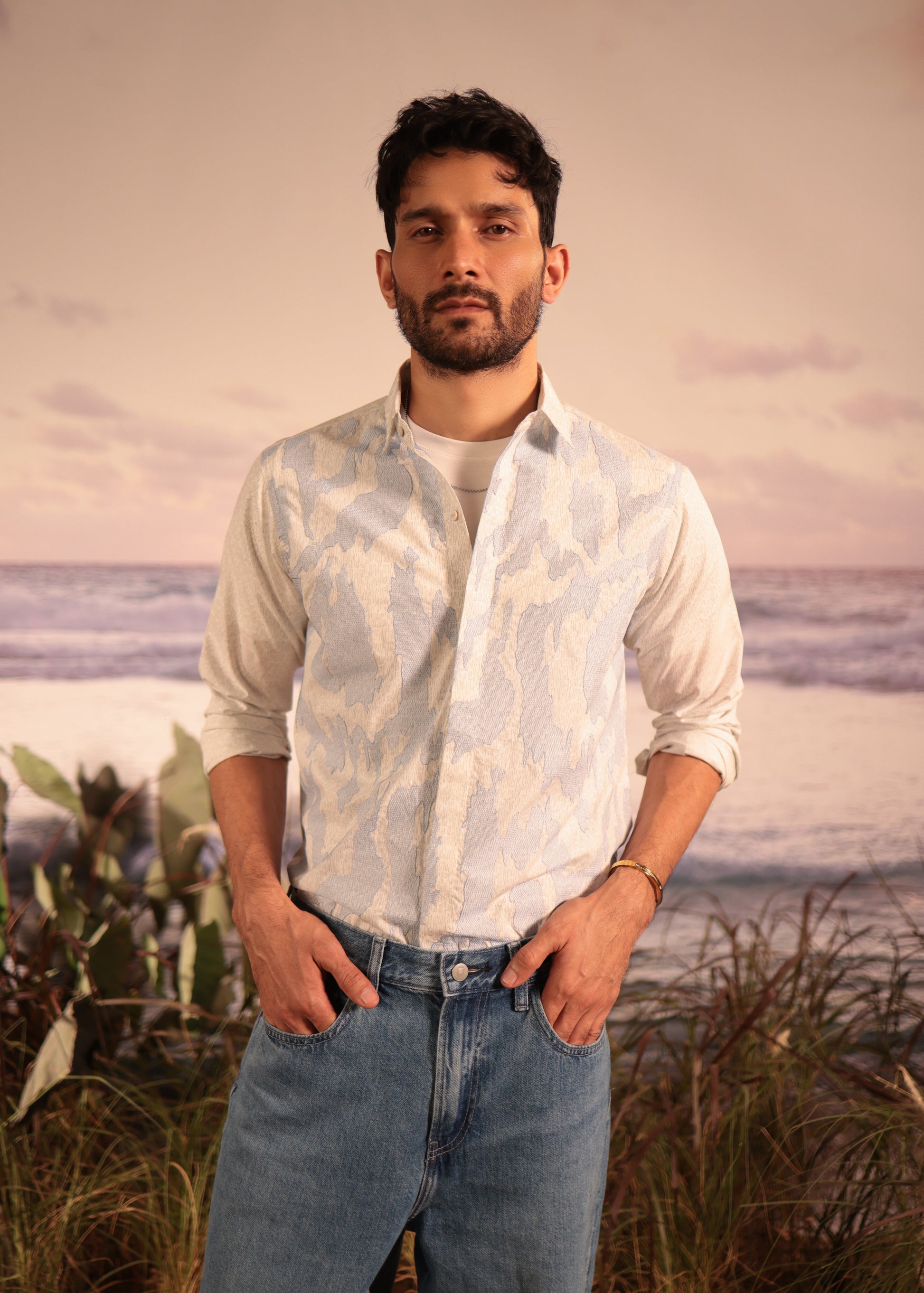 Elevate your summer wardrobe with the Meridian Serene Shirt, an effortless blend of peak summer vibrancy and tranquil elegance. Crafted from 100% Egyptian Giza cotton, the shirt features a hand-block printed texture adorned with abstract embroidery, evoking the serene beauty of sunlit horizons. Designed to make you stand out, this shirt is a timeless addition to your summer adventures.