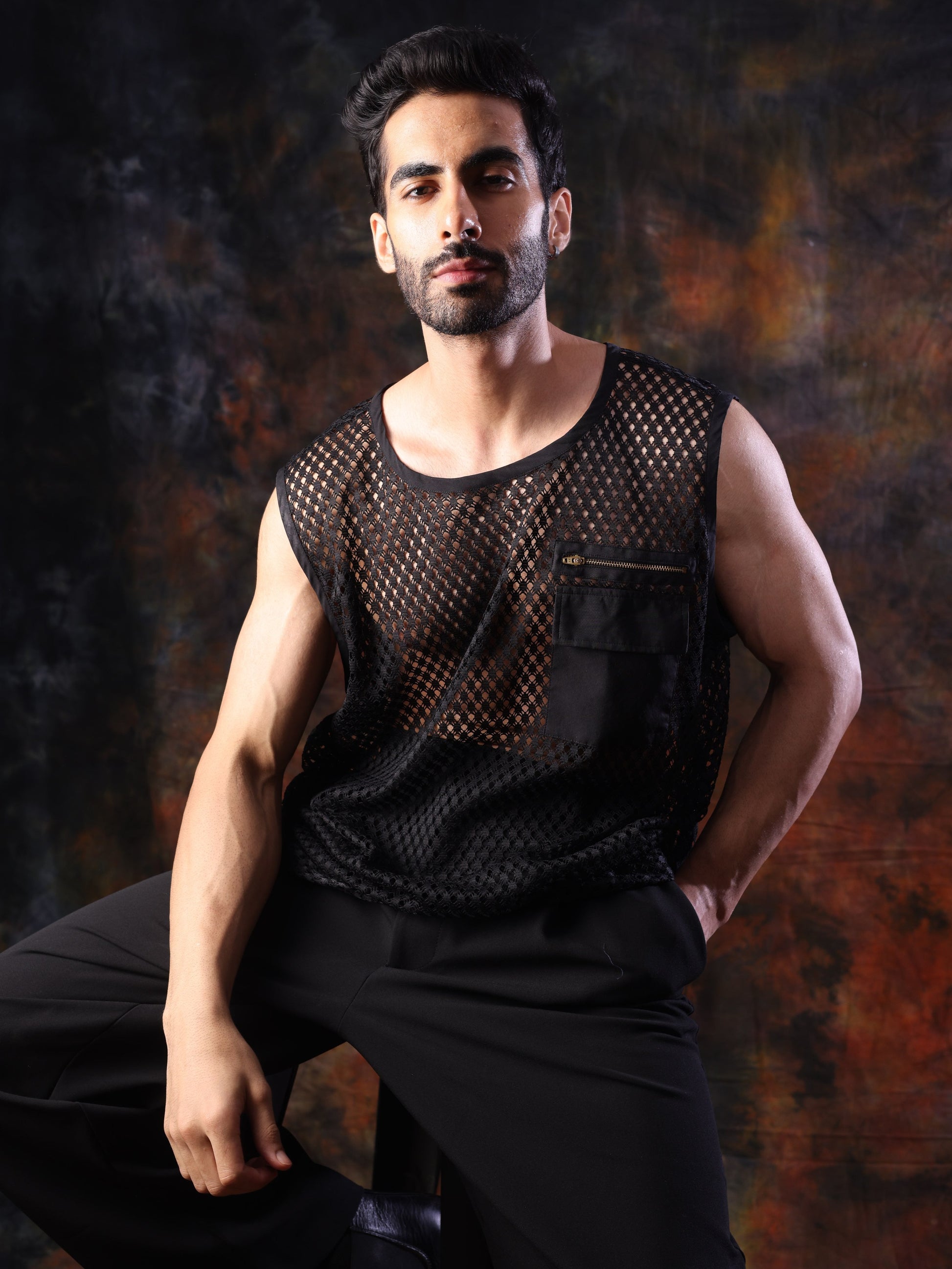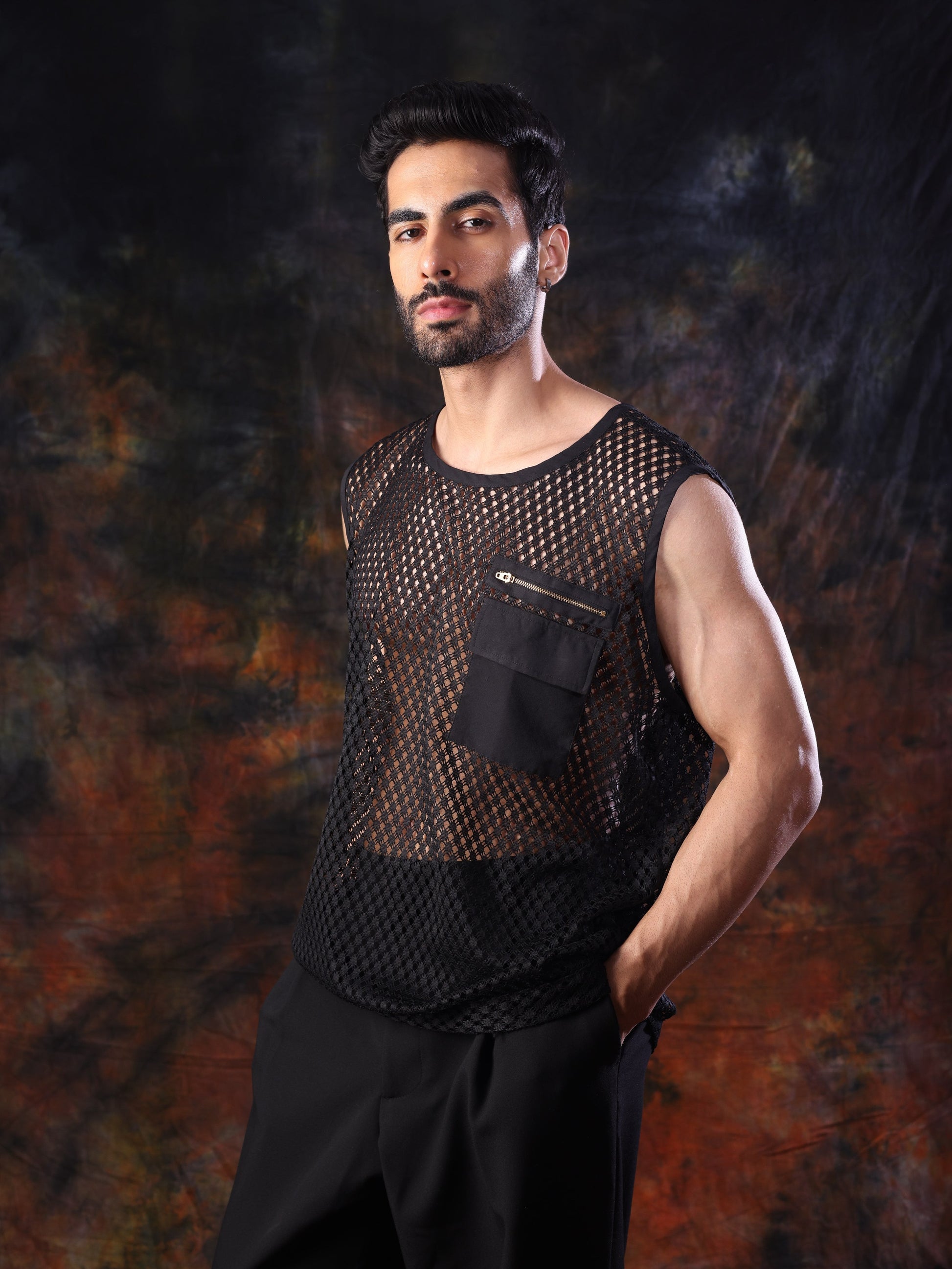 Sleek, bold, and unapologetically modern — the Mesh Tank is crafted from structured black mesh with a sharp geometric weave. Featuring a relaxed sleeveless cut, a statement front zipper pocket, and an effortless silhouette, this piece is designed for those who like to push style boundaries. Perfect for layering or standing on its own, it pairs effortlessly with relaxed trousers or statement streetwear for an edgy, fashion-forward look.