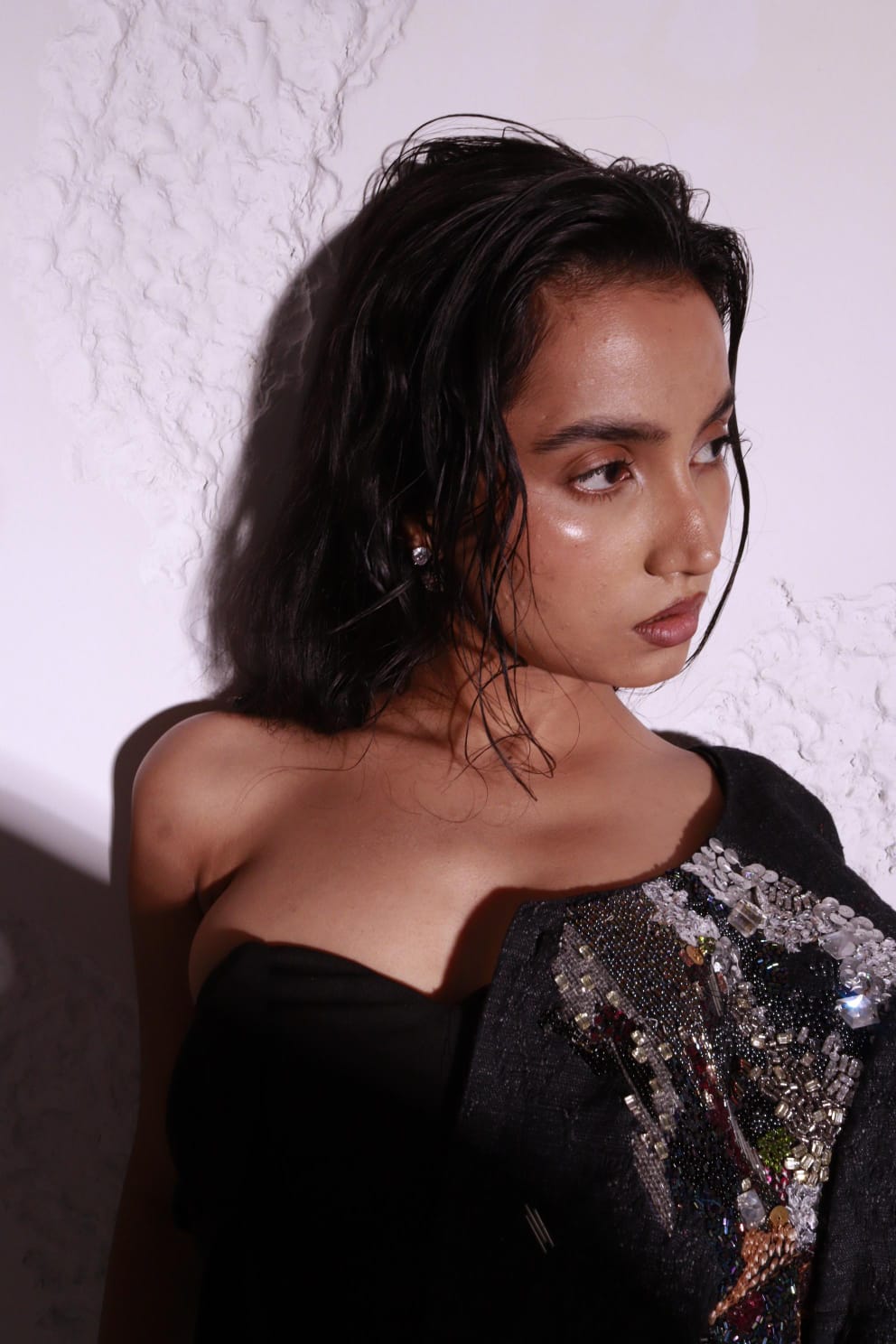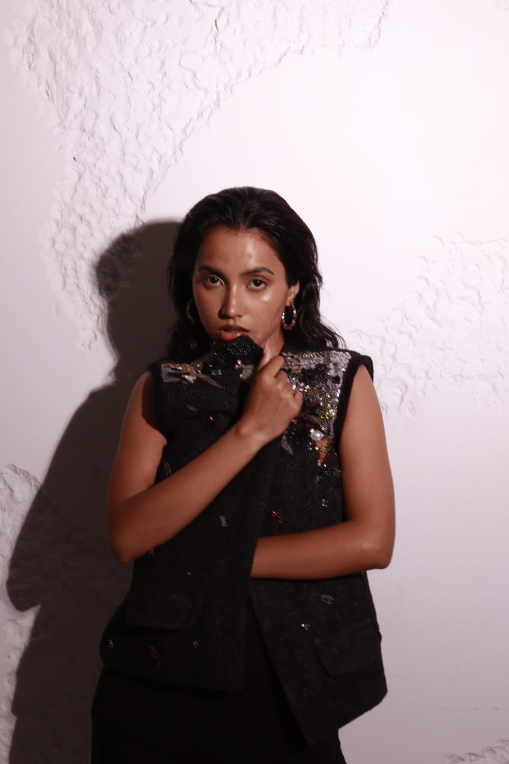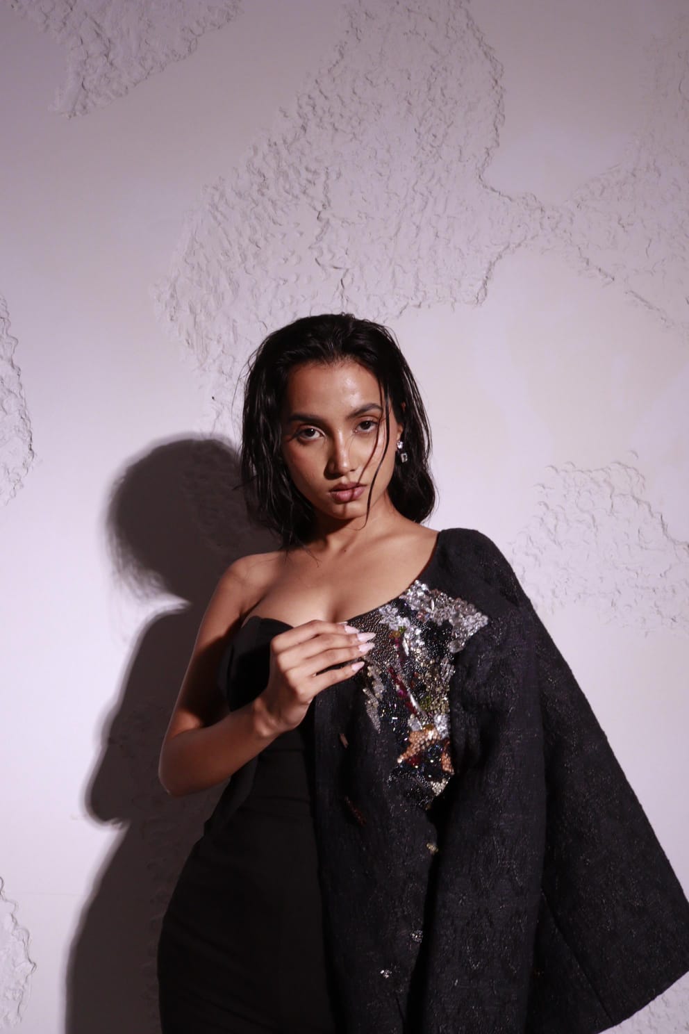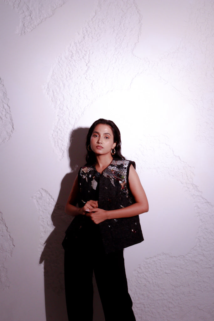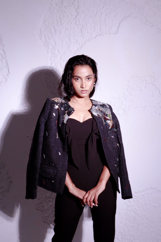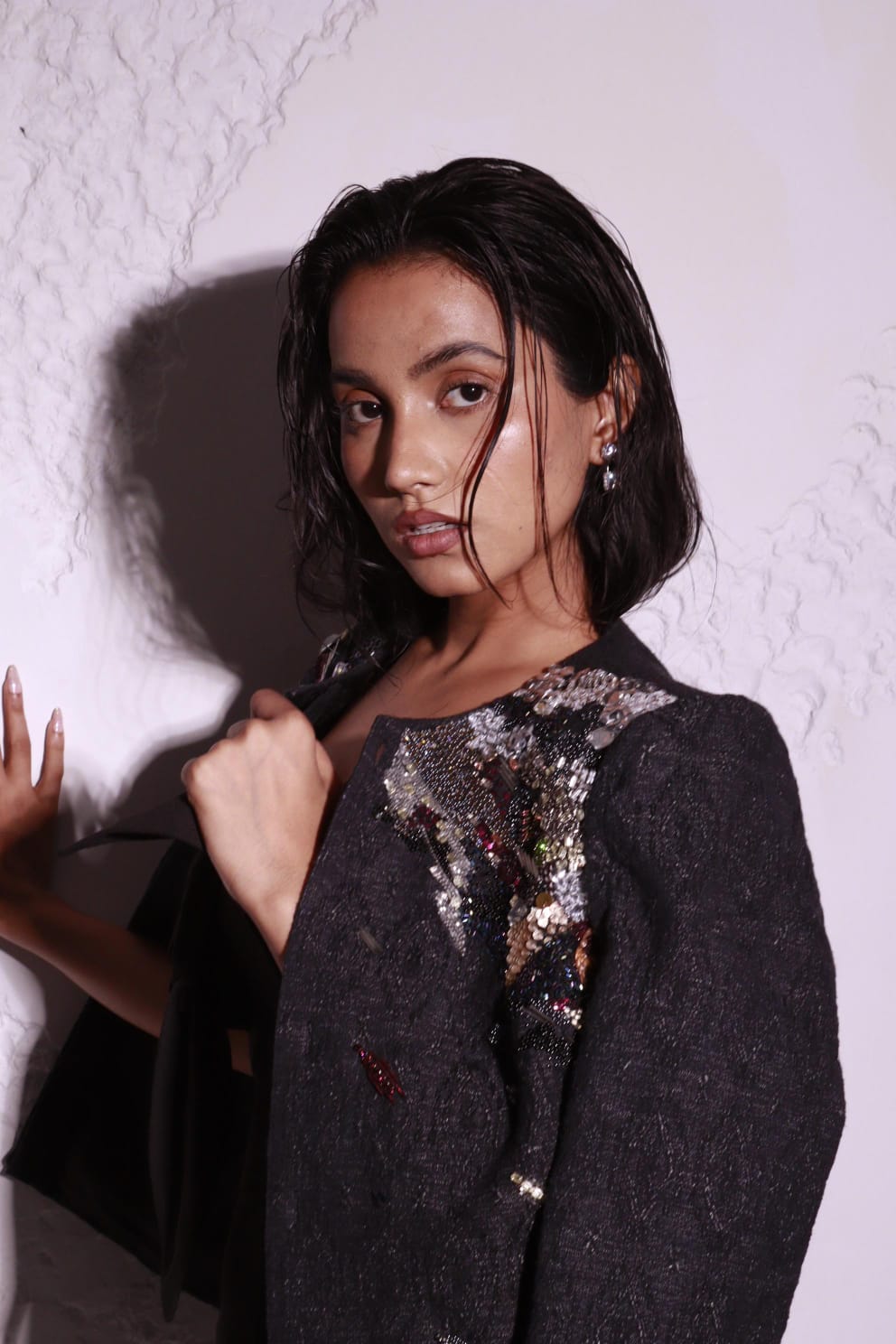 The Meteorite Jacket is a striking and sleek outerwear piece that combines structured design with an otherworldly aesthetic. Inspired by the jagged, reflective edges of meteorite fragments, this jacket features a unique, slightly irregular texture that catches the light in mesmerizing ways. Hand-embroidered details add an element of artistry, elevating the overall design with intricate craftsmanship. The woven fabric enhances the texture, offering a rich, tactile feel. Perfect for those who appreciate bold, fashion-forward pieces, the Meteorite Jacket makes a statement with its futuristic yet refined look. Ideal for standout moments.