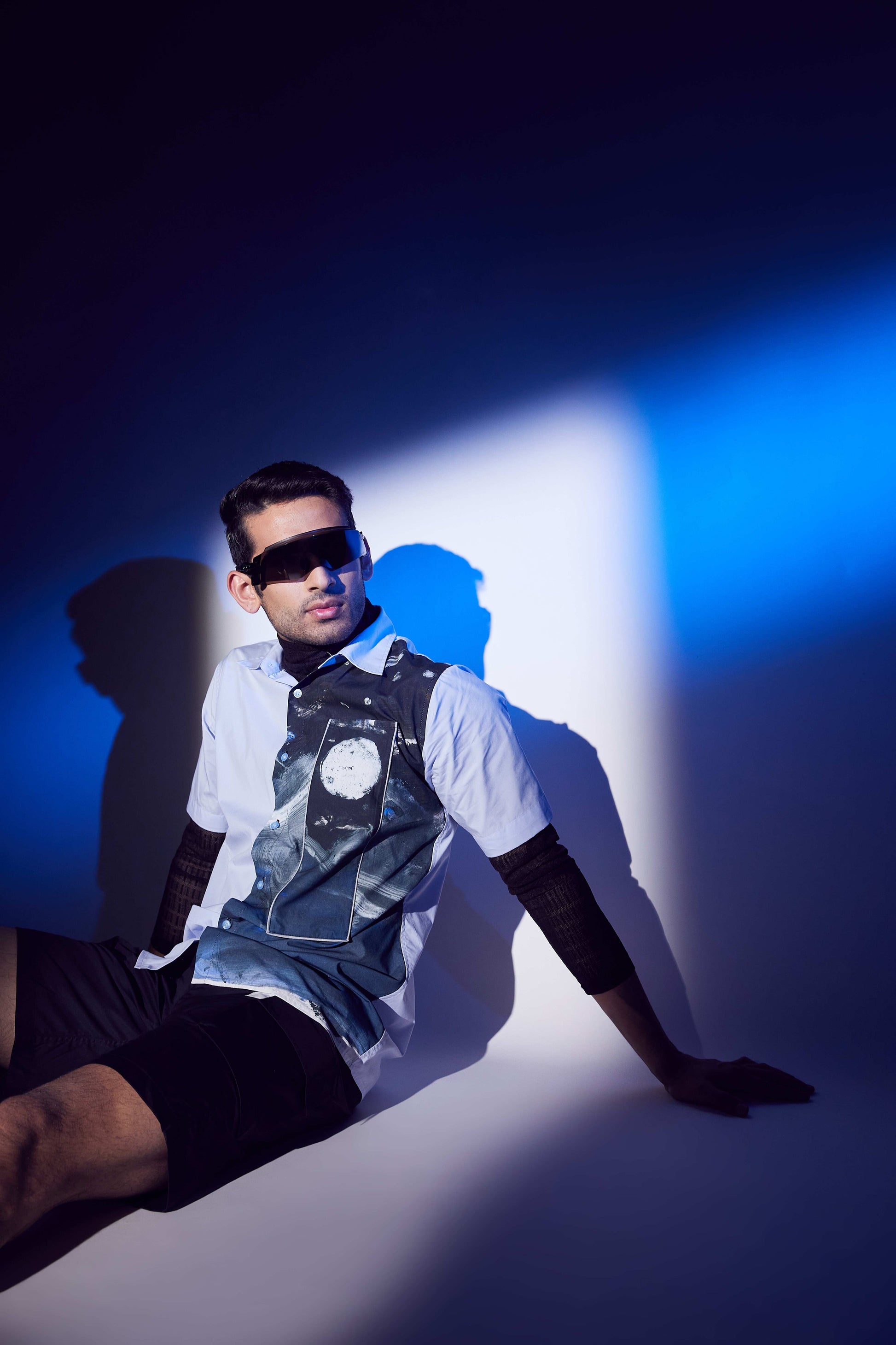 Regular-fit collared button up shirt with short sleeves featuring "Midnight Moon" Print with reflective detailing. The Moon Print is designed in collaboration with Muskaan. An NGO for specially abled. This Artwork was created by Hamaesul. 15% of our net profits will be donated for their welfare.